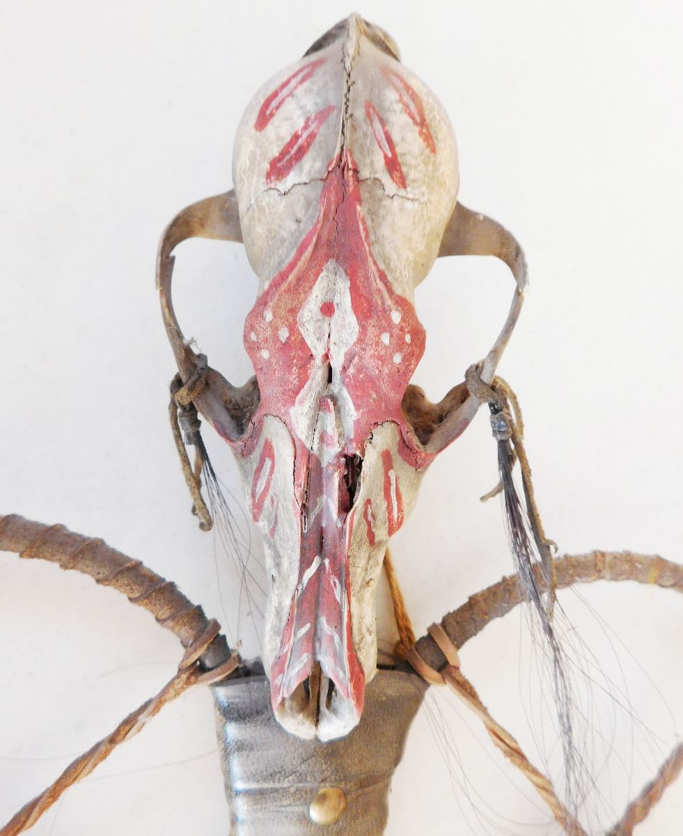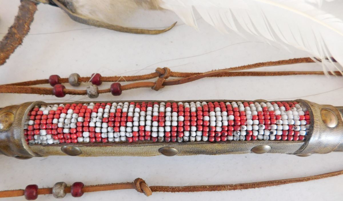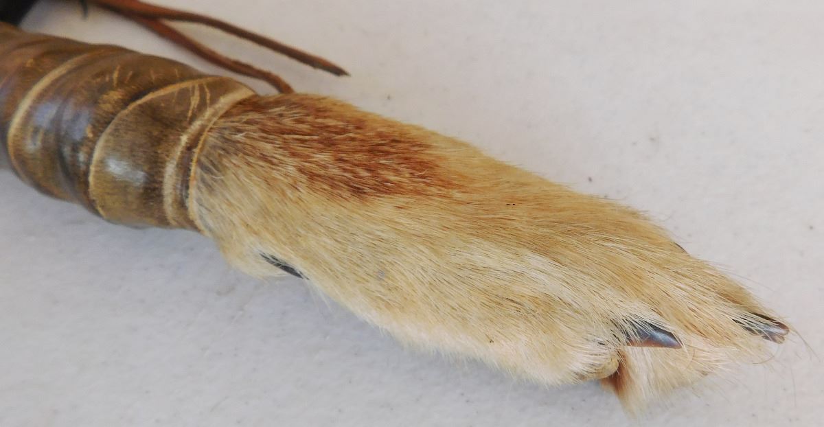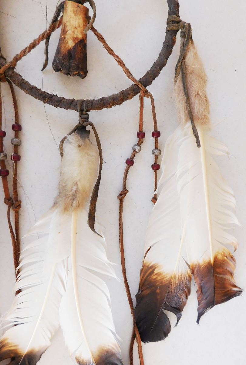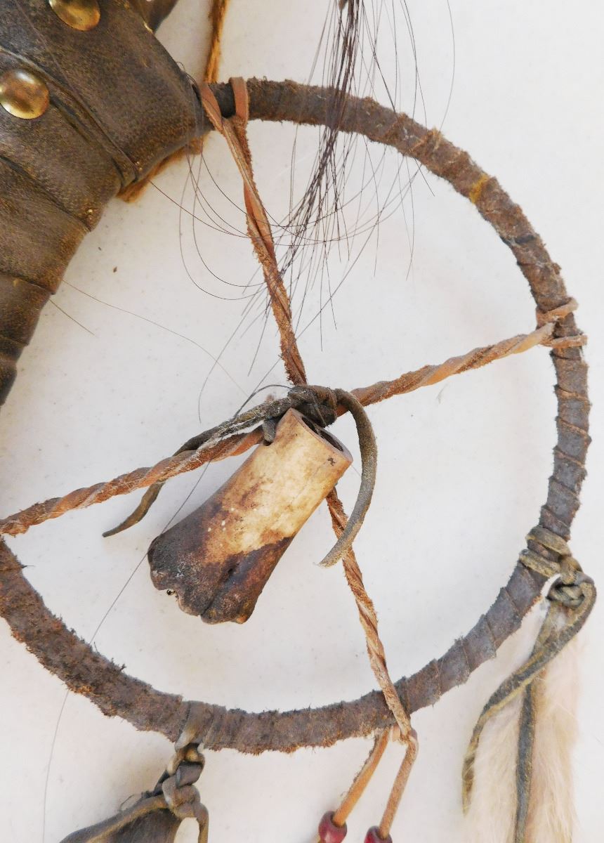 Plains Indian Coyote Medicine Wand, circa 1900. Item is made of feathers, skull bone, fur, rawhide, wood, glass beads and brass tacks. Item measures 31" x 15" x 5". Sioux, Dakota. Much polish on handle from use. Condition: Some wear, good condition, see images. Shipping: $50.