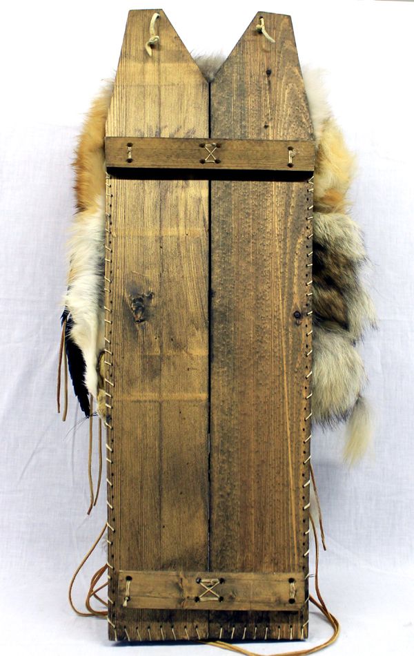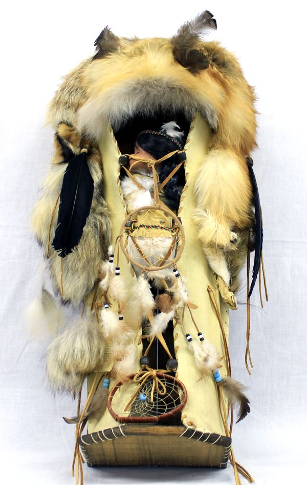 Plains Indian Cradleboard with Doll, measures 31'' x 16'', features genuine fur, feathers, leather, beads, embellished with dream catchers, genuine Plains Indian Cradleboard, gorgeous red fox fur, truly a work of art, comes with tag telling about the cradleboard