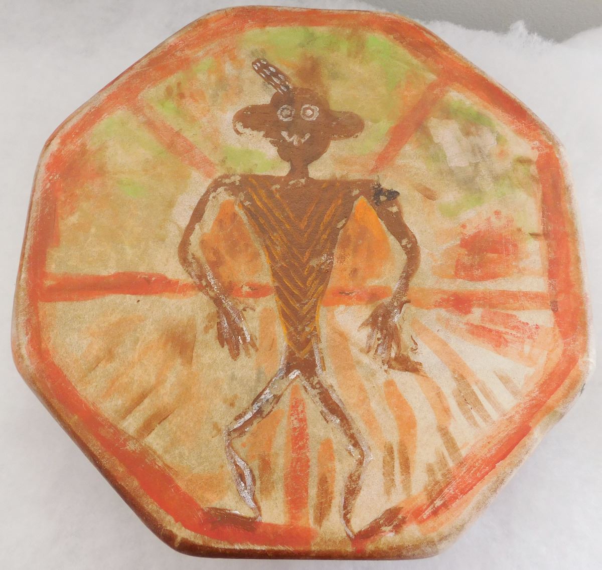 Plains Indian Dance Drum, circa 100 years old. Made of hide, paint, and wood. Item is 14" x 3". From the Southwest USA. Nice sound. Condition: Good, see images. Shipping: $30.00.