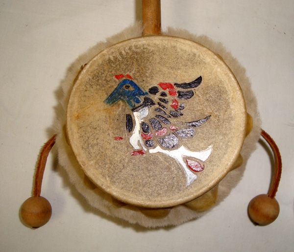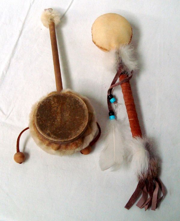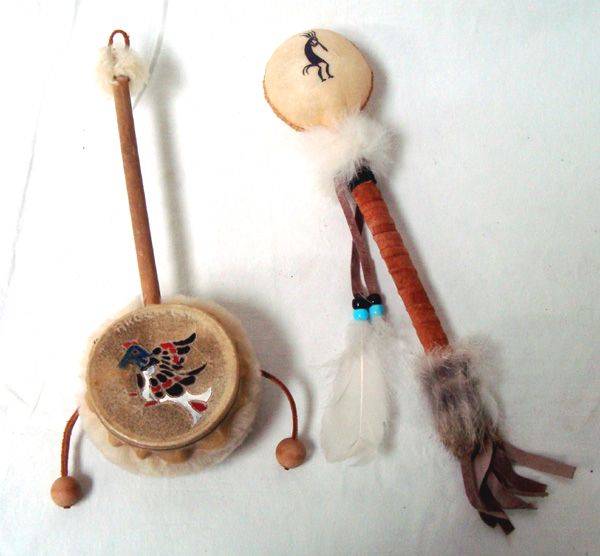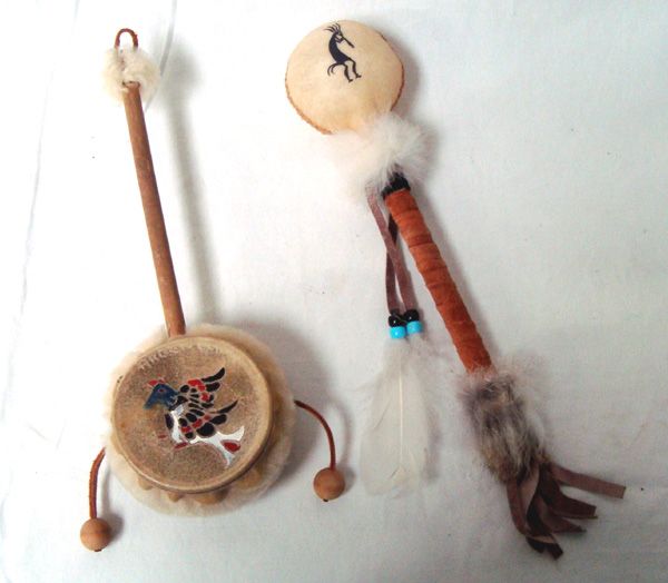 Plains Indian Dance Rattle and Drum, largest is scrotum rattle measuring 11''L, #1 is a scrotum rattle with a handpainted Kokopelli on it, wooden handle wrapped in leather and embellished with feathers, pony beads, and rabbit fur, fringed leather on end #2 is a hand painted drum with a wooden handle, embellished with wool and leather on handle's end, drum has bird painting on head and two beaded beaters on leather embellished with wool as well