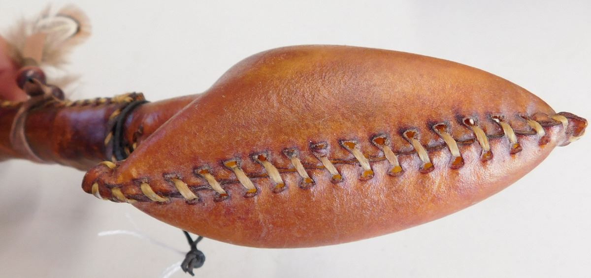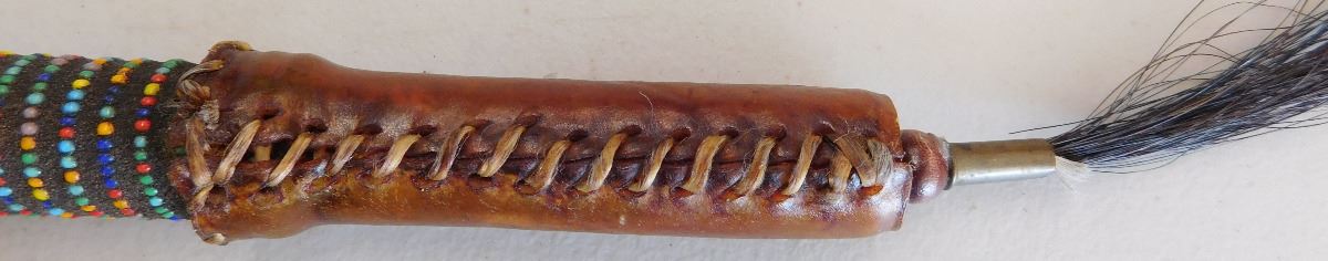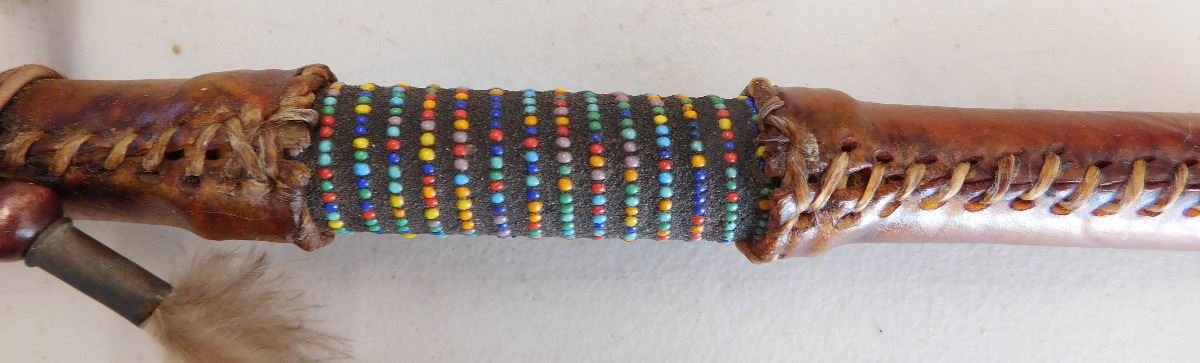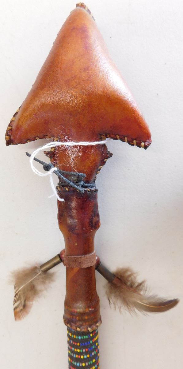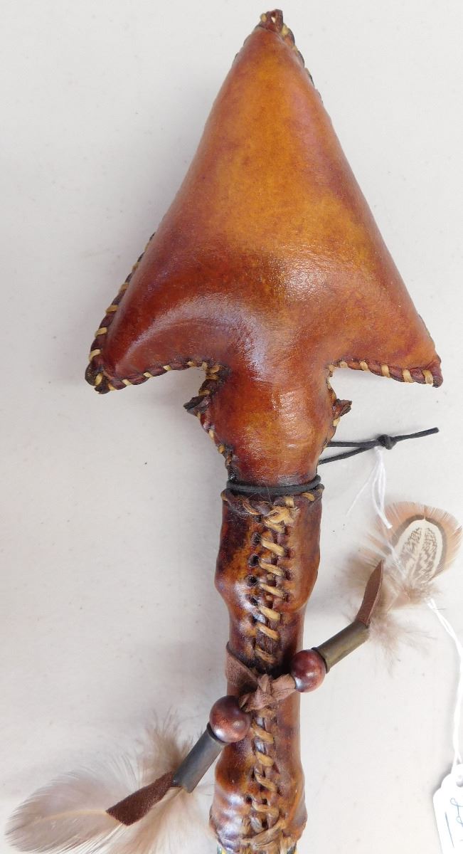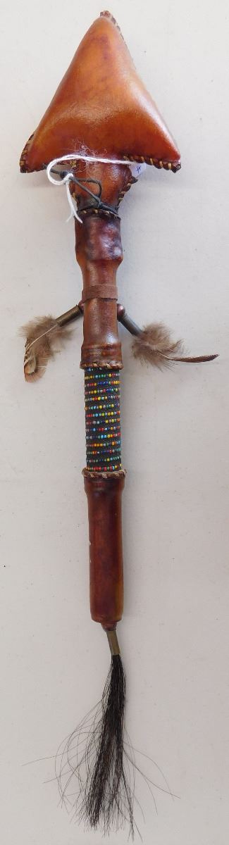 Plains Indian Dance Rattle, modern item. Made of rawhide, feathers, horsehair, spent brass shells and glass beads, this item measures 18" x 3.5" x 2". Sioux. Has a shape of an arrow! Nice rattle sound as well. Condition: Very good, see images. Shipping: $19.50.