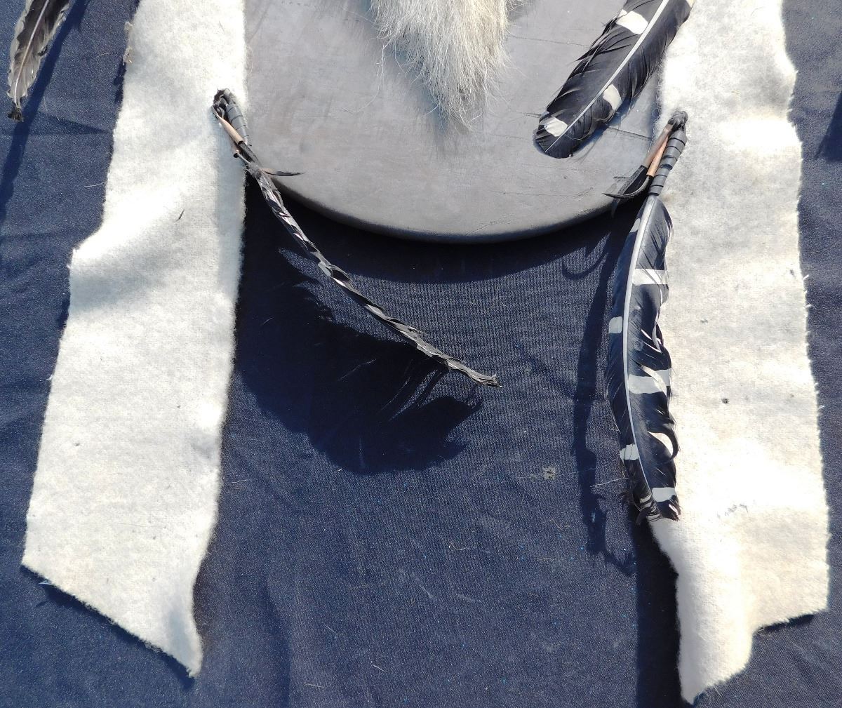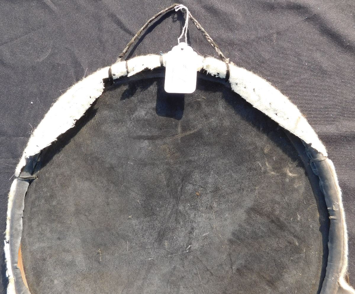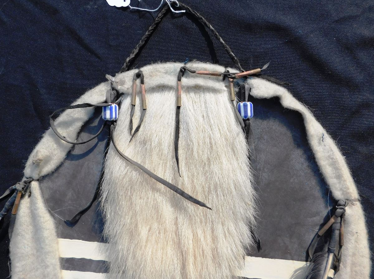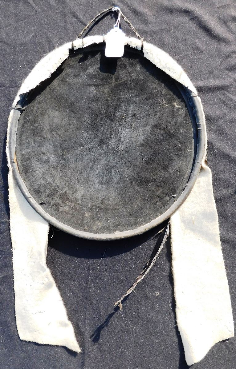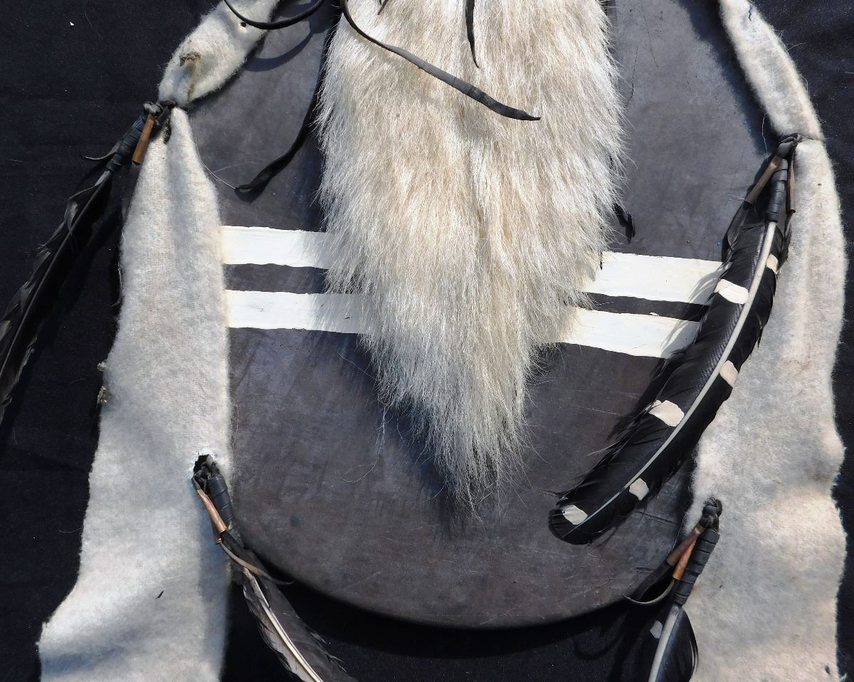 Plains Indian Dance Shield, circa 1900s. Made of rawhide, glass beads, feathers, fur and cloth. Item measures 20x20x1 inches. Sioux, from the Dakotas. Has rare chevron glass trade beads. Condition: Some scuffs, dust, and wear, some staining, see images. Shipping: $40.00.