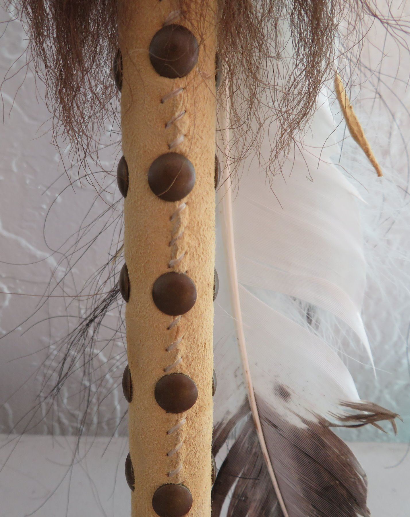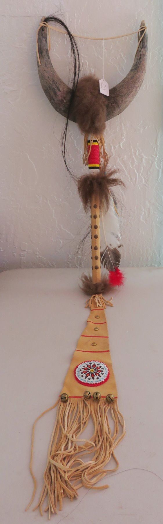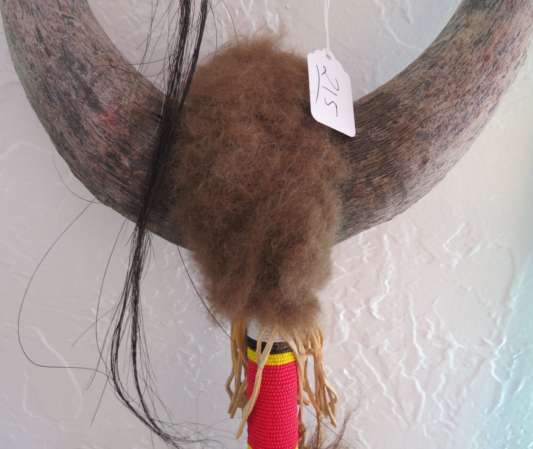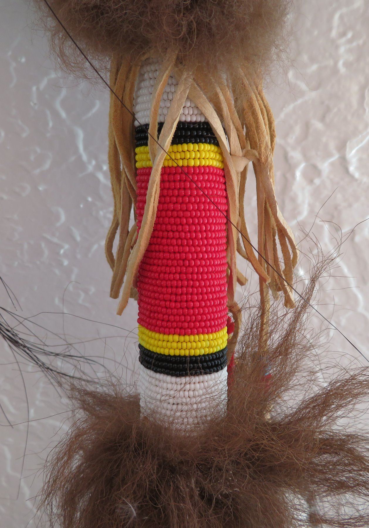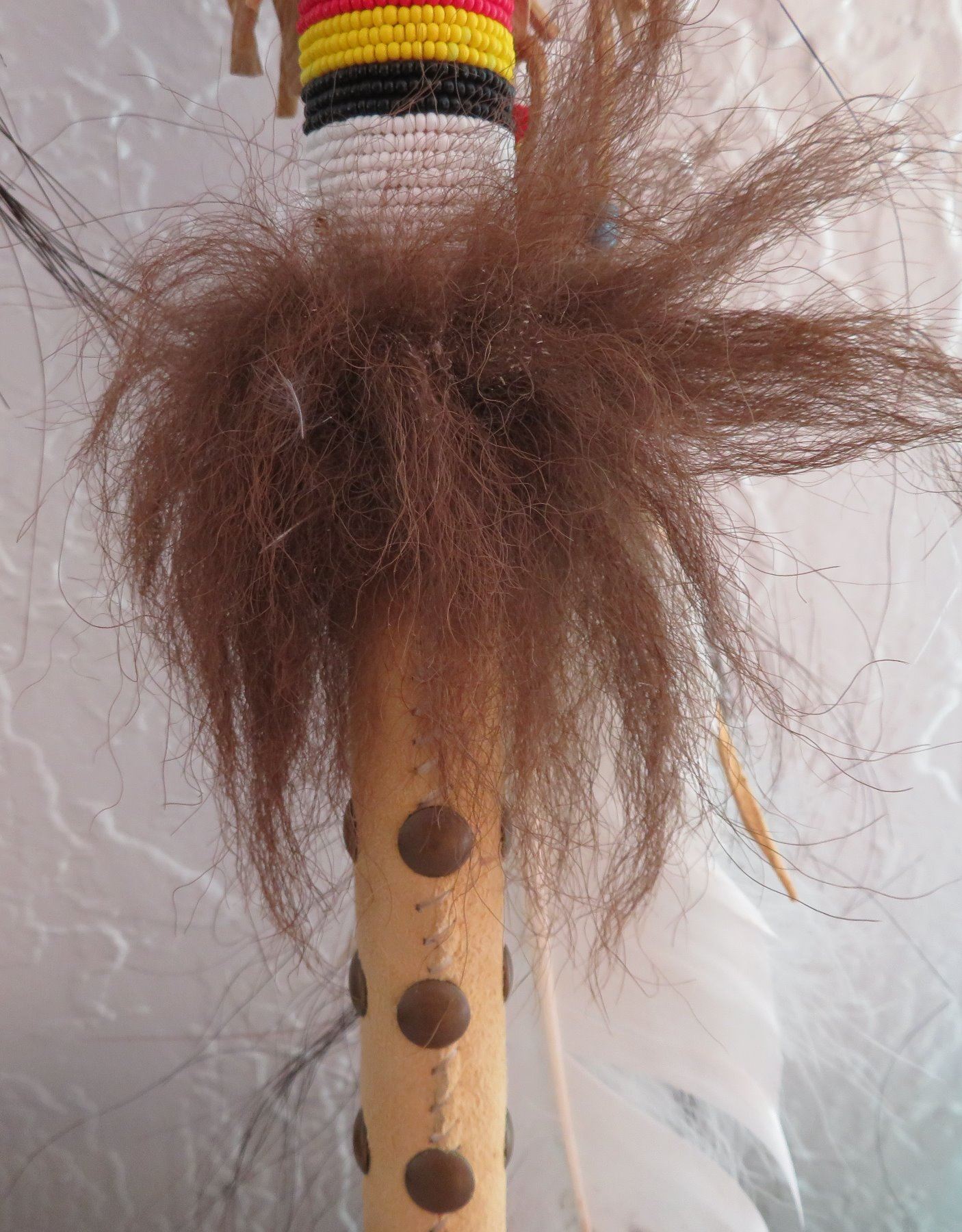 Plains Indian Dance Wand, 20th century item. Made of wood, leather, brass tacks, feathers, bells, hair, fur, buffalo horn and glass beads, the item measures 10 1/2" x 4" x 49" w/fringe. Plains Indian. Red, yellow, black and white beads on handle. Condition: Good, see images. Shipping: $45.00 w/insurance and signature, due to size and value.