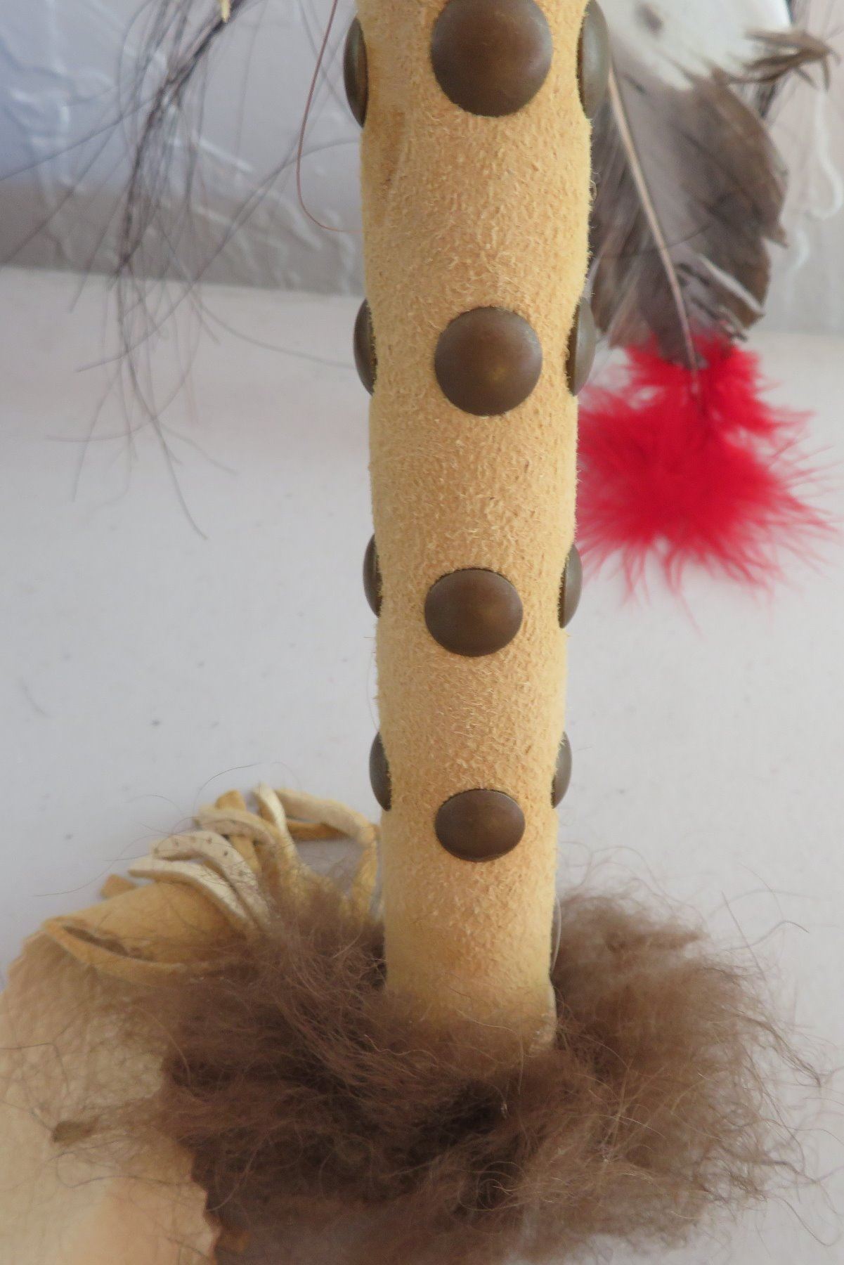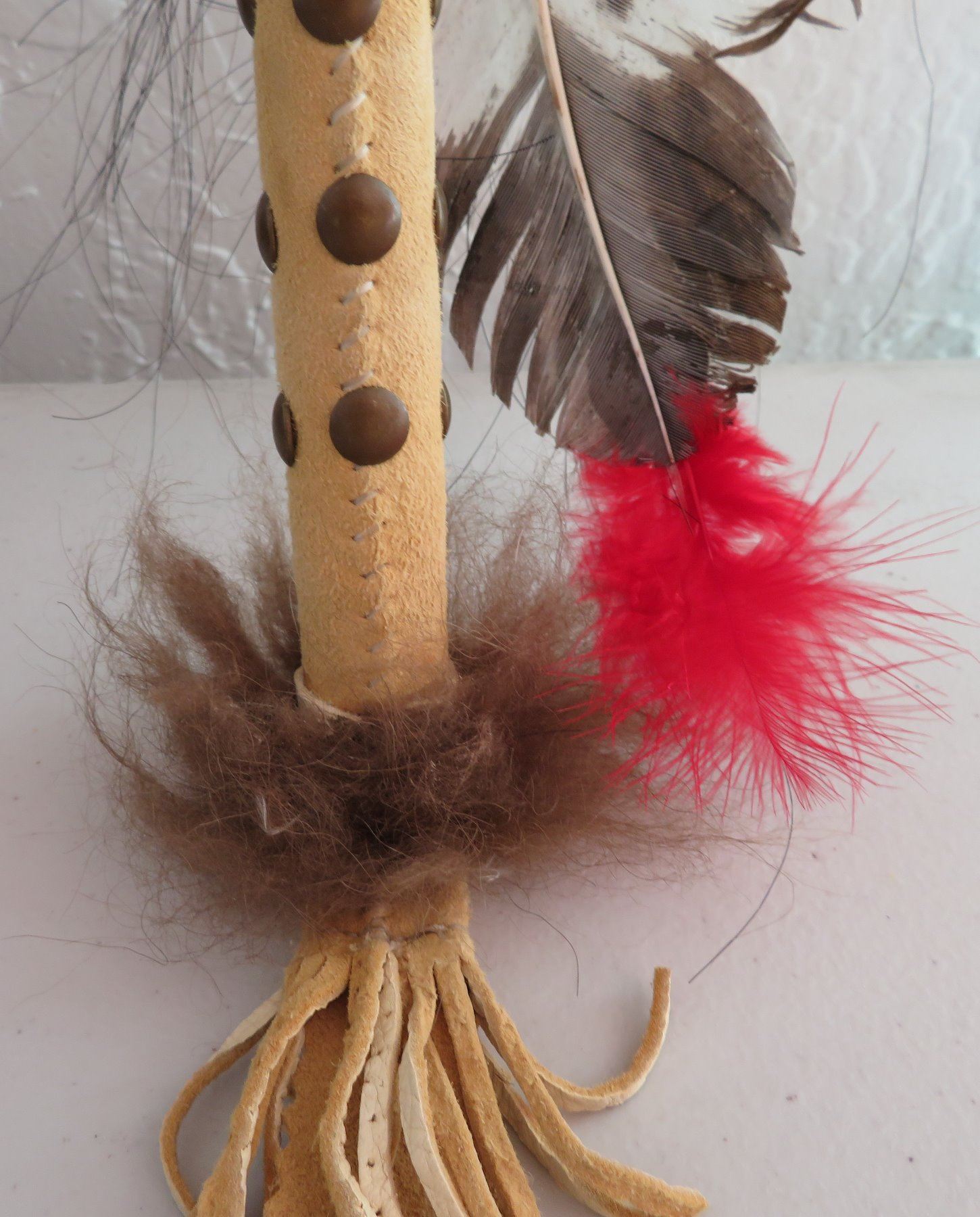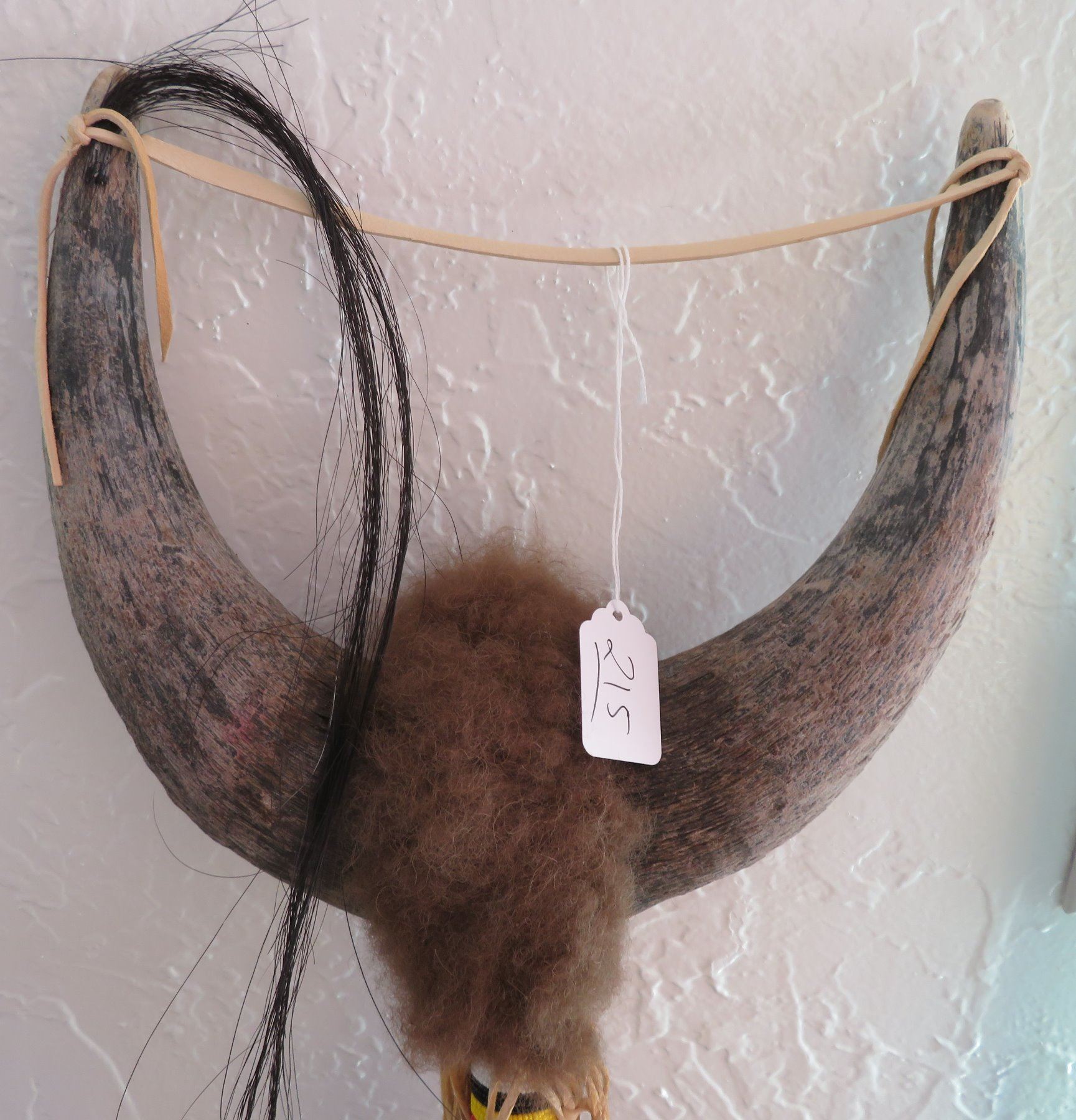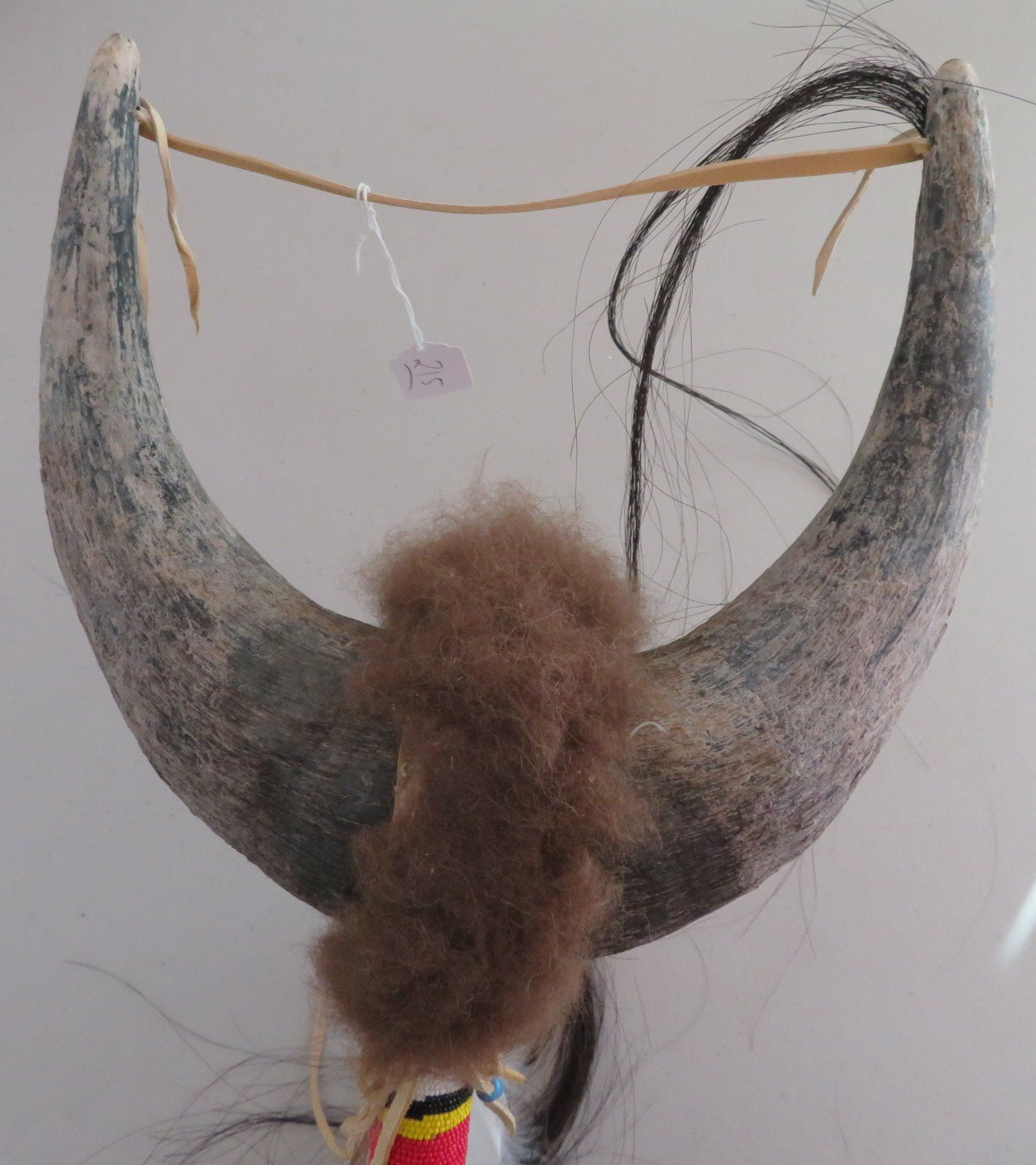 Plains Indian Dance Wand, 20th century item. Made of wood, leather, brass tacks, feathers, bells, hair, fur, buffalo horn and glass beads, the item measures 10 1/2" x 4" x 49" w/fringe. Plains Indian. Red, yellow, black and white beads on handle. Condition: Good, see images. Shipping: $45.00 w/insurance and signature, due to size and value.