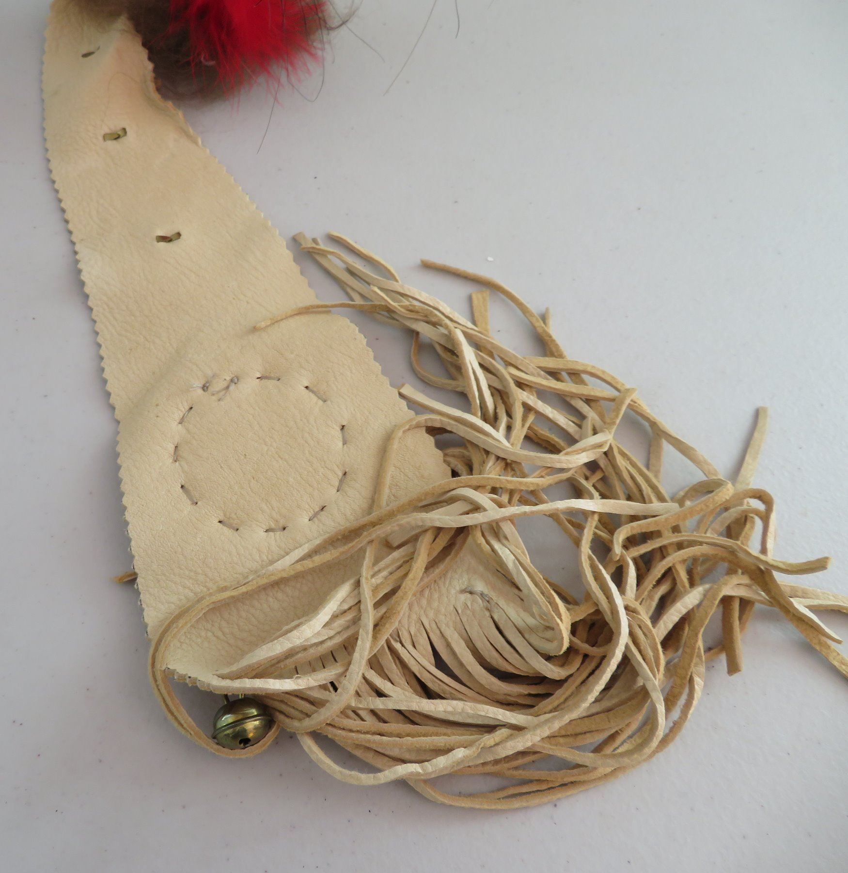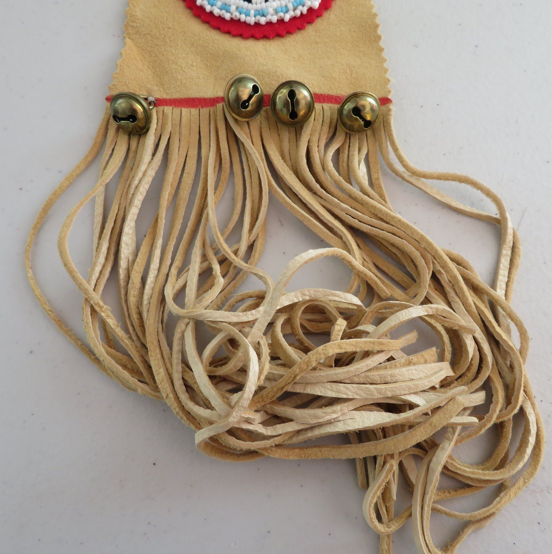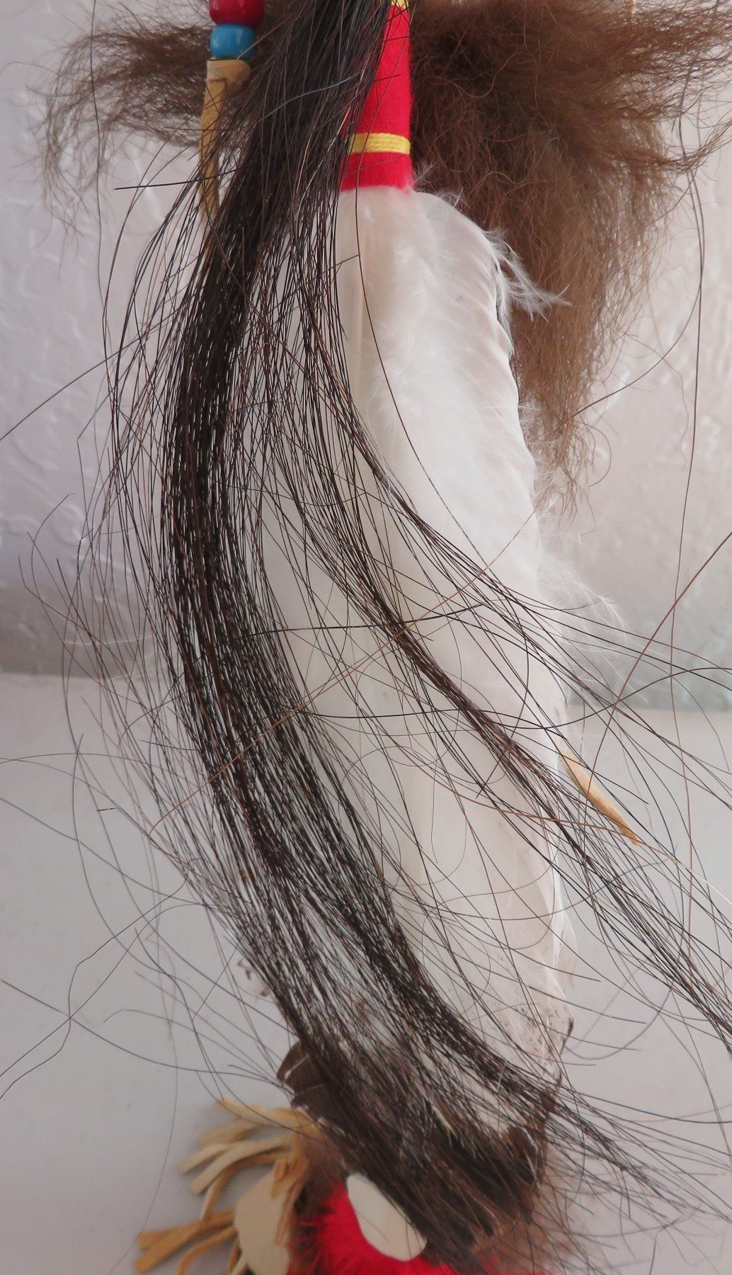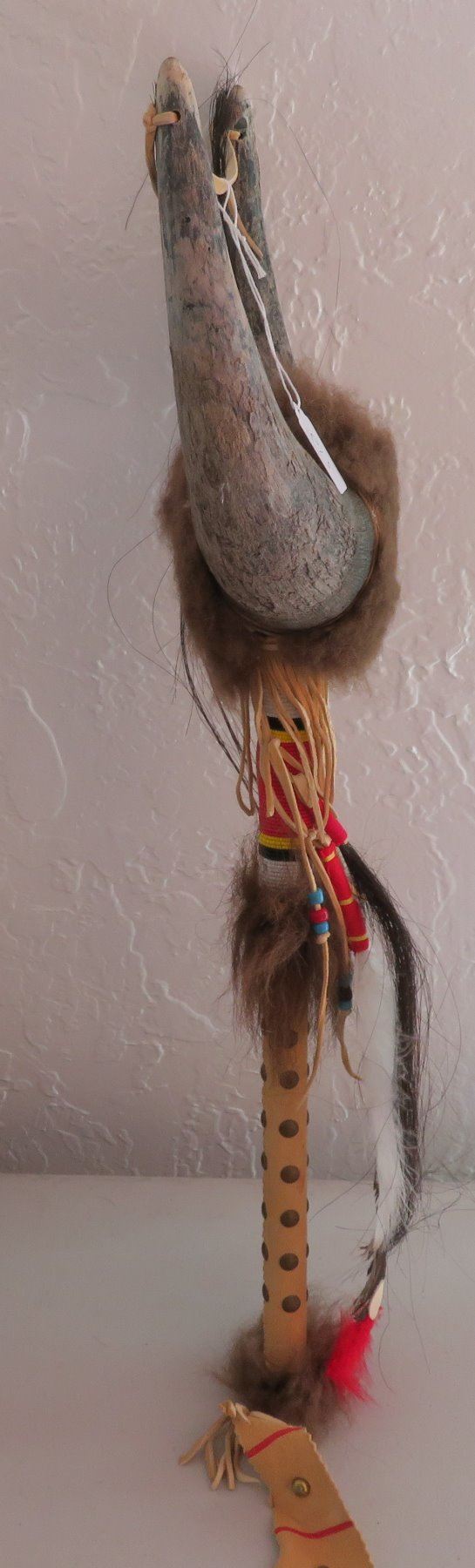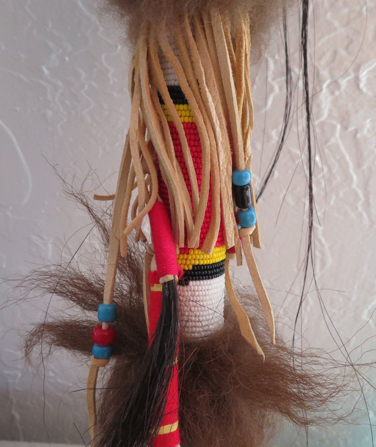 Plains Indian Dance Wand, 20th century item. Made of wood, leather, brass tacks, feathers, bells, hair, fur, buffalo horn and glass beads, the item measures 10 1/2" x 4" x 49" w/fringe. Plains Indian. Red, yellow, black and white beads on handle. Condition: Good, see images. Shipping: $45.00 w/insurance and signature, due to size and value.