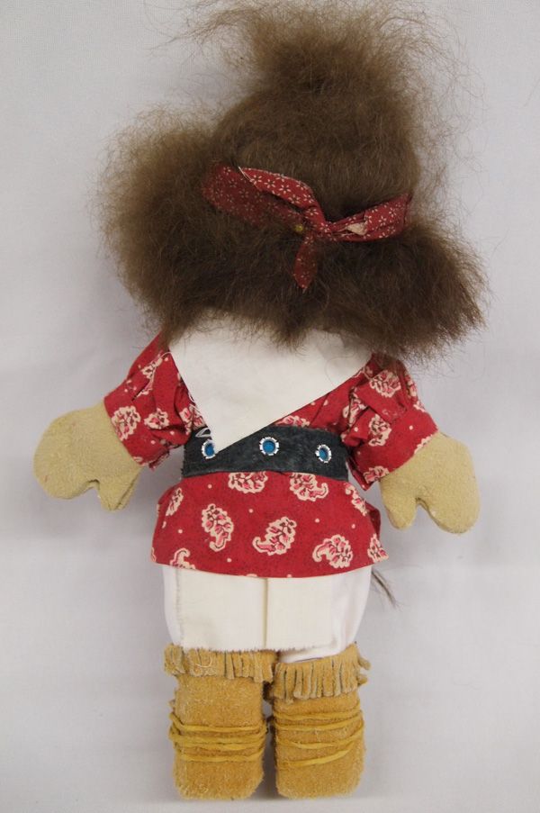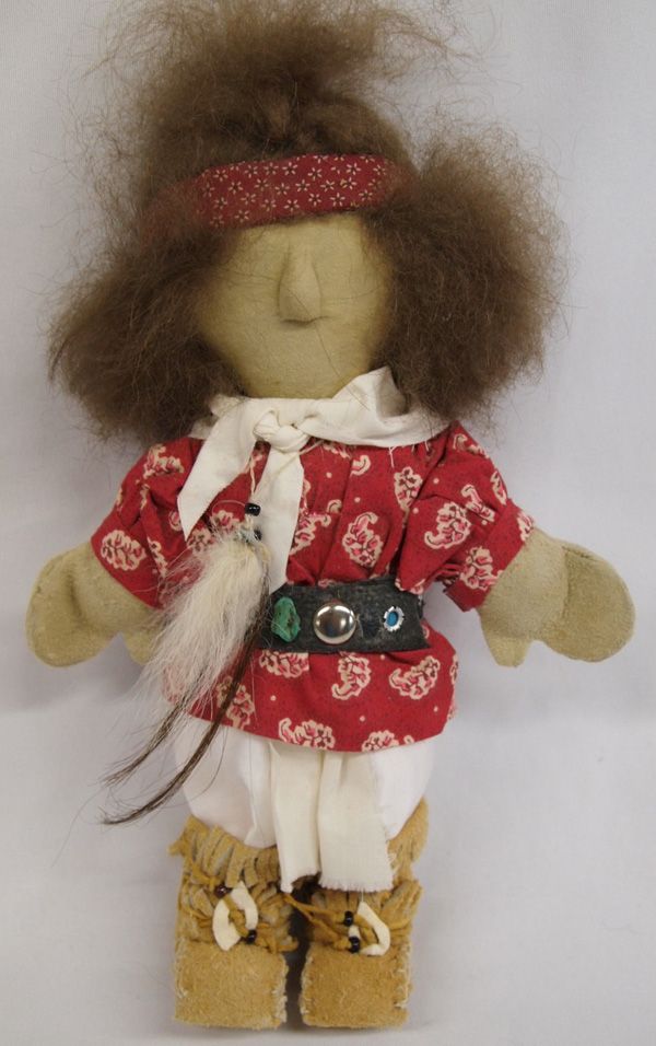 Plains Indian Doll on Stand. 11''H x 7''W, this doll has authentic costume of the Plains tribes. Stand is metal.
