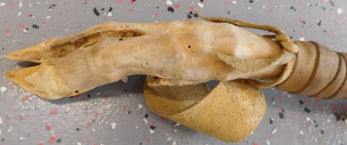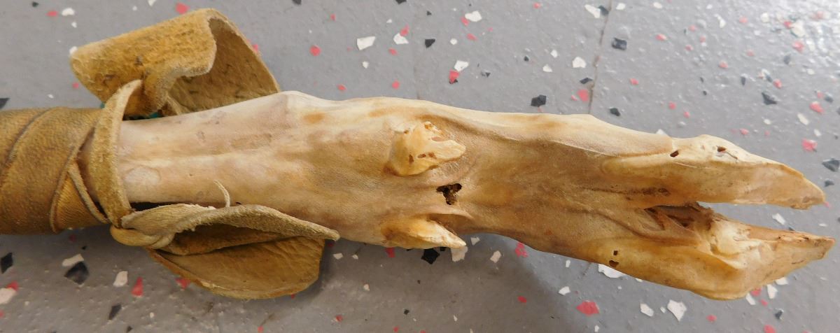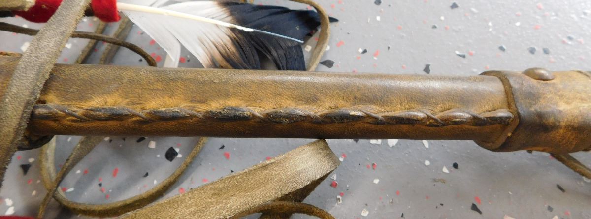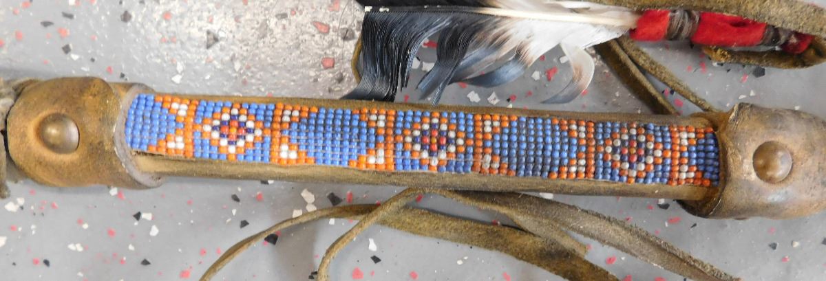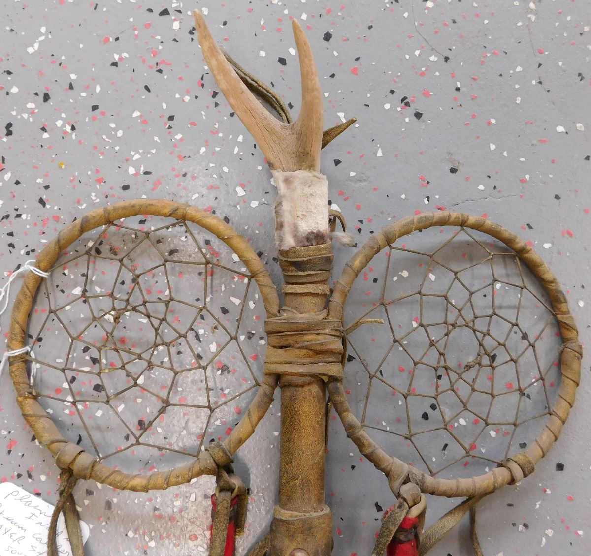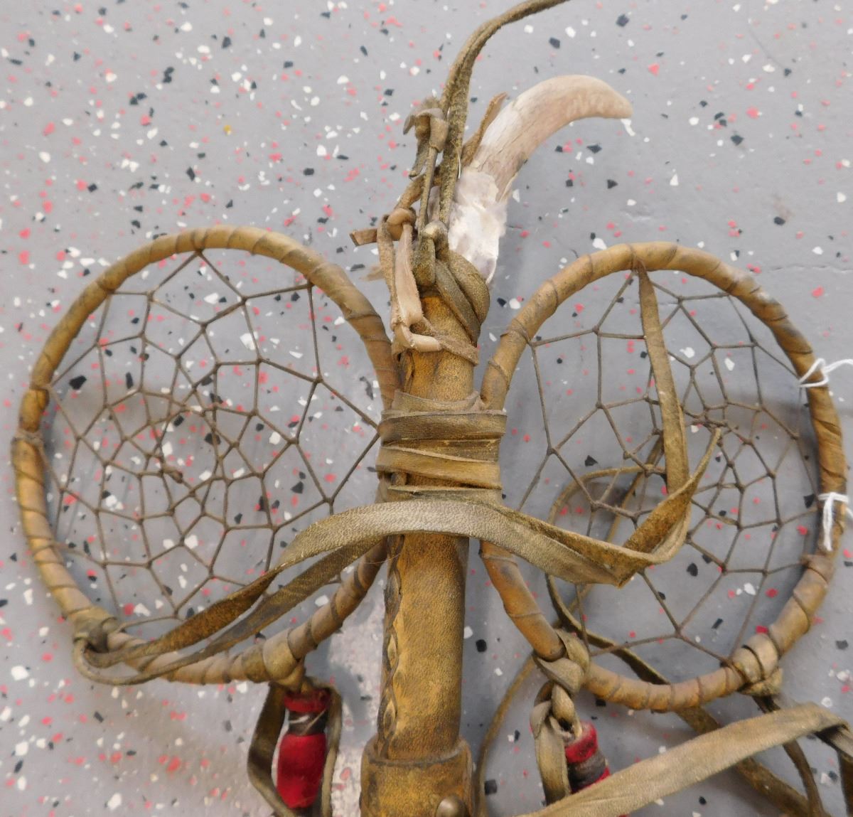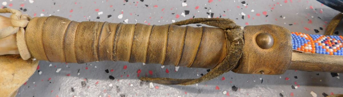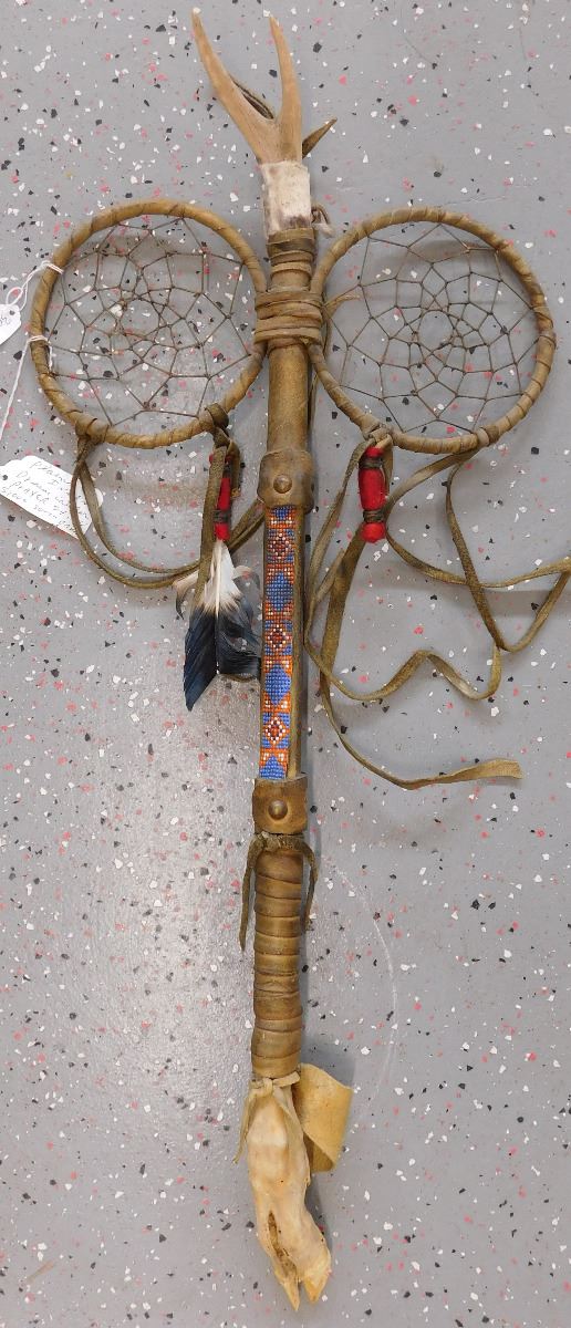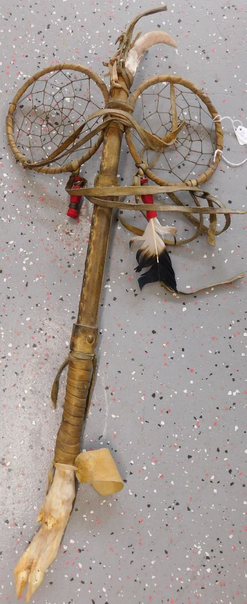 Plains Indian Dreamcatcher Prayer Staff, circa mid-20th century. Item measures 30 x 13 x 2 inches. Item is made of wood, wrapped in hide, has alter bone and hoof, glass beadwork, brass tacks, and leather. Dakota/Sioux. Condition: Some wear, dust and scuffs, see images. Shipping: $35.00