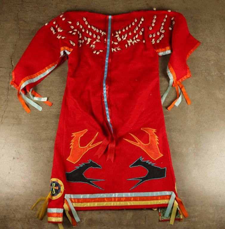Red felt dress with horse motif, horse hair fringe, cowrie shells decoration and orange and blue ribbon. Excellent condition overall.