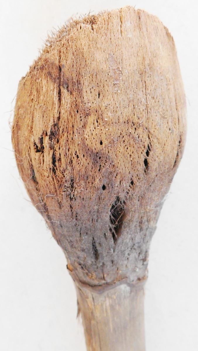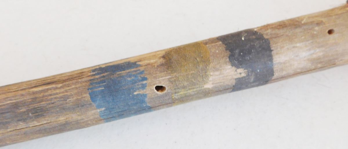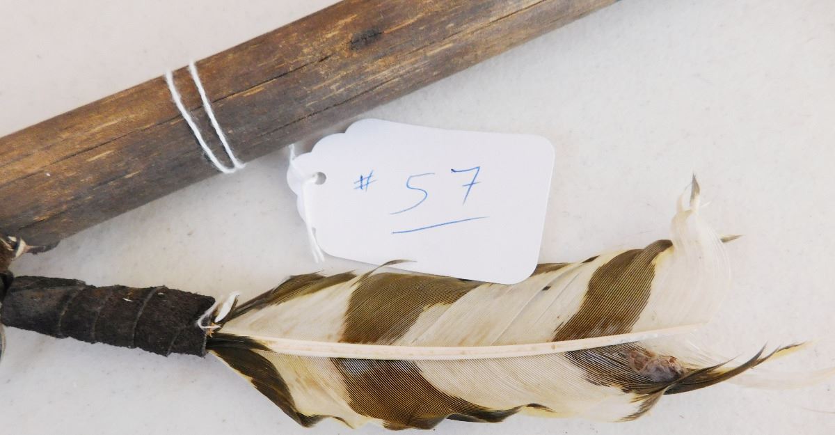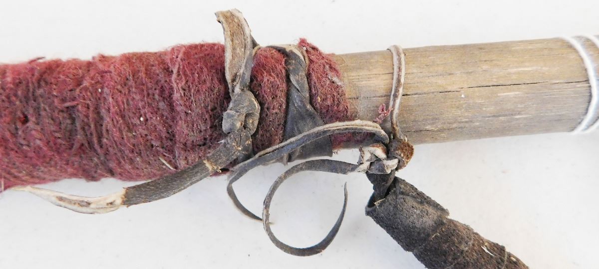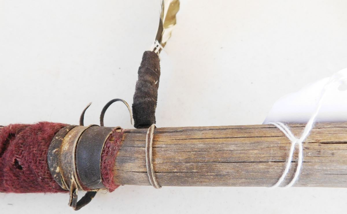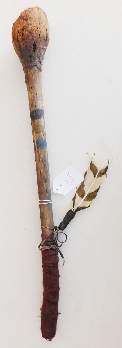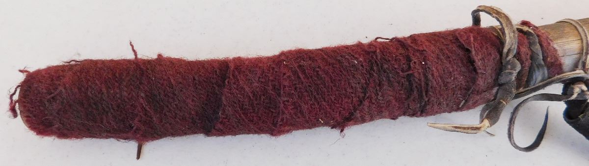 Plains Indian Drum Beater, circa 1900s. Made of trade cloth, feathers, rawhide, some type of yucca-like plant. Item measures 27" x 3" x 3", Sioux/Dakota. Probably used for a large drum. Condition: Some paint loss, seen use and wear, moth-eaten cloth, see images. Shipping: $18.00