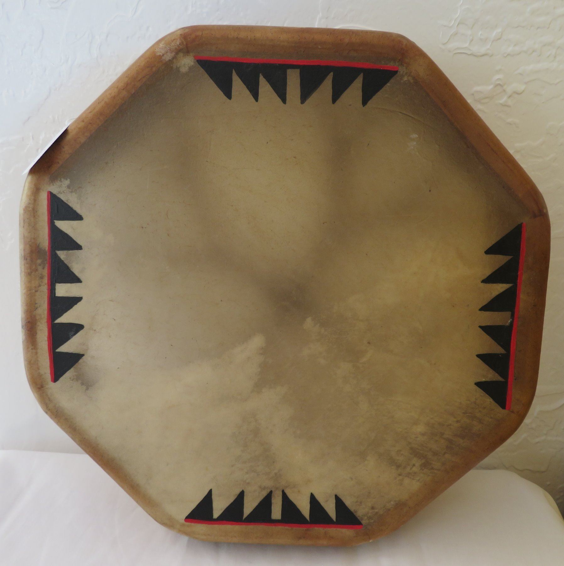 Plains Indian Drum w/Beater, 20th century item. Made of rawhide, wood, paint, and leather, the drum measures 13" x 13" x 2.5", beater is 14.5" long. Sioux. Condition: Good, see images. Shipping: $25.50 w/insurance and signature, due to size.