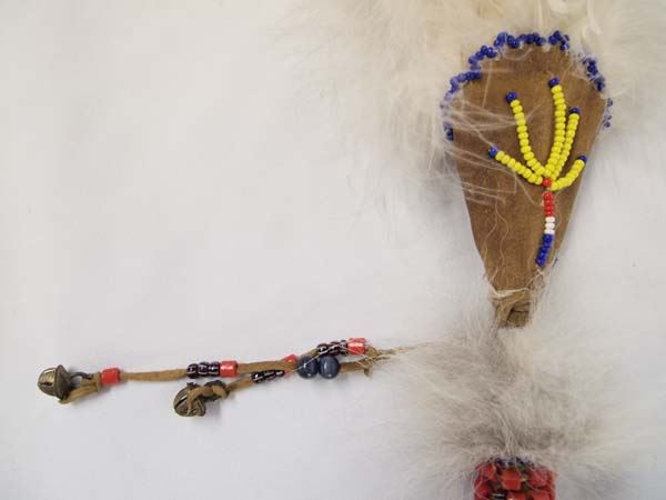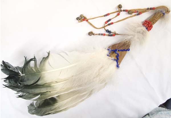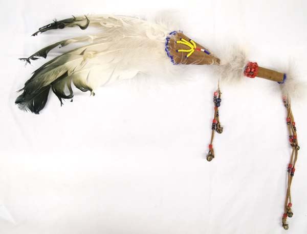 Native American Plains Indian Feather Dance Fan. Adorned with leather and beading this item measures approx. 18''L x 7''W.