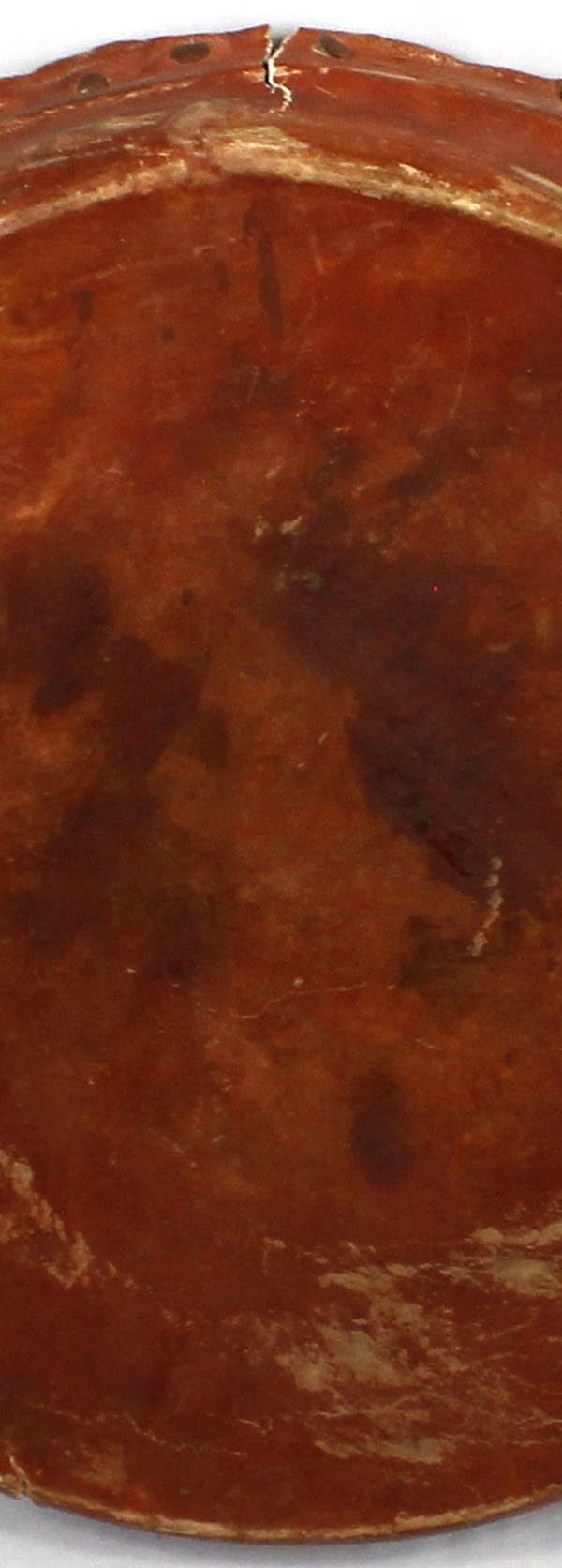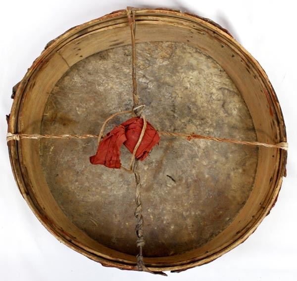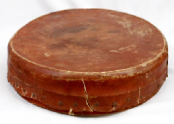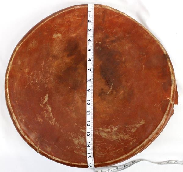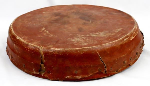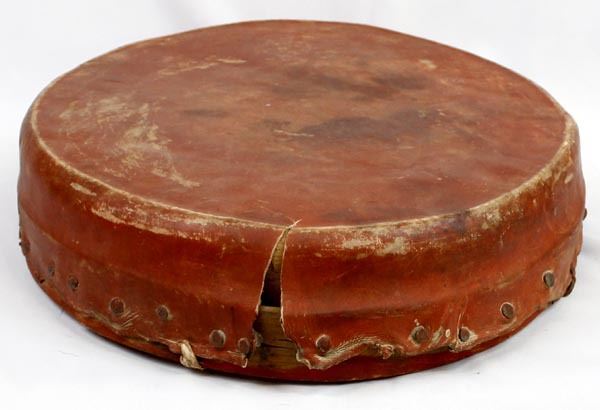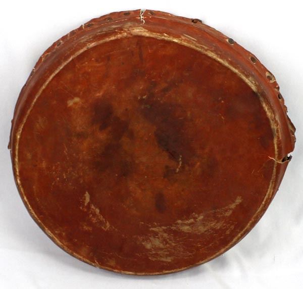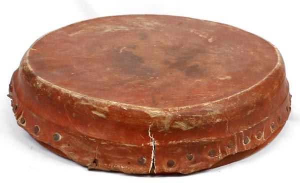 Native American Plains Indian Handmade Handpainted One Sided Drum, measures 4'' x 17'', decorated with Antique Brads. Painted Red, Sound is Terrific.