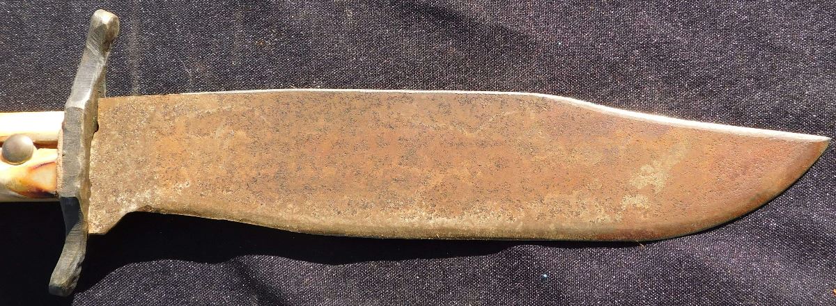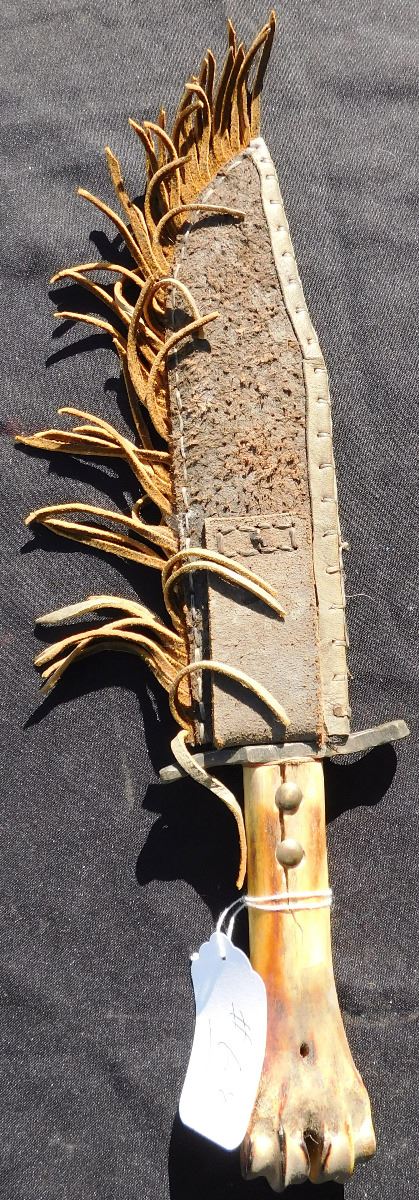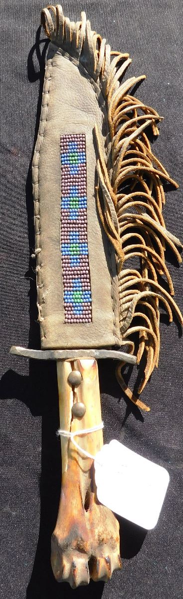 Plains Indian Knife & Sheath, circa 1900s. Made of rawhide, buffalo bone, glass beads and carbon steel. Item measures 16" x 3.5" x 1". Sioux, from the Dakotas. Large bowie-style knife. Condition: Some dust, wear and rust, some scuffs, see images. Shipping: $20.00