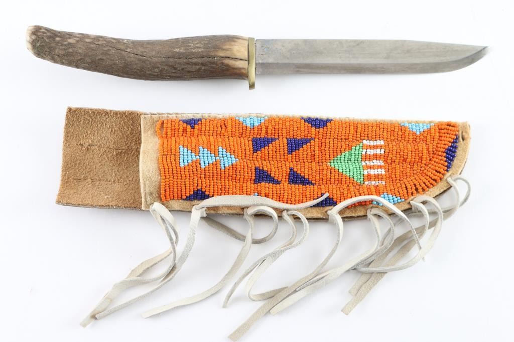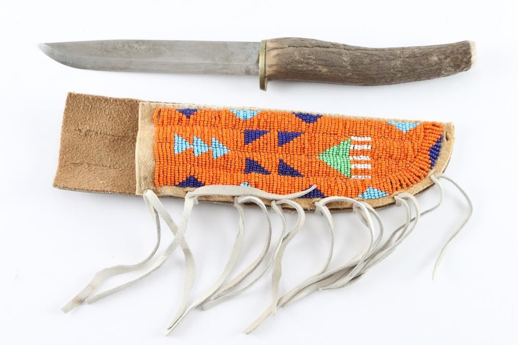 Includes antler handled knife, measures 12inches overall with 6inch blade. Knife sheath is fully beaded with fringe.