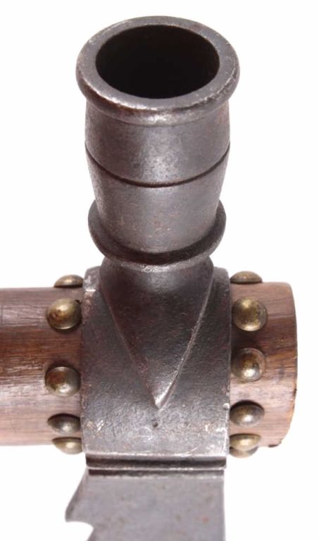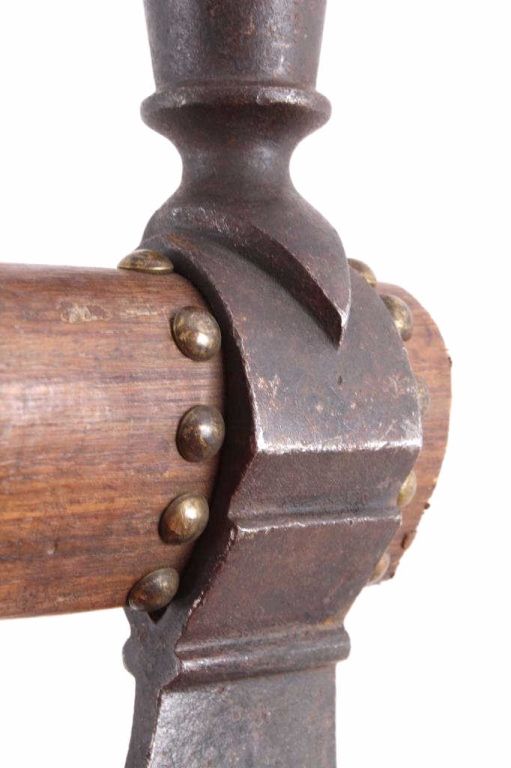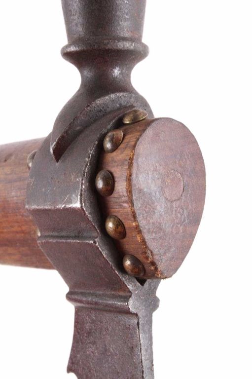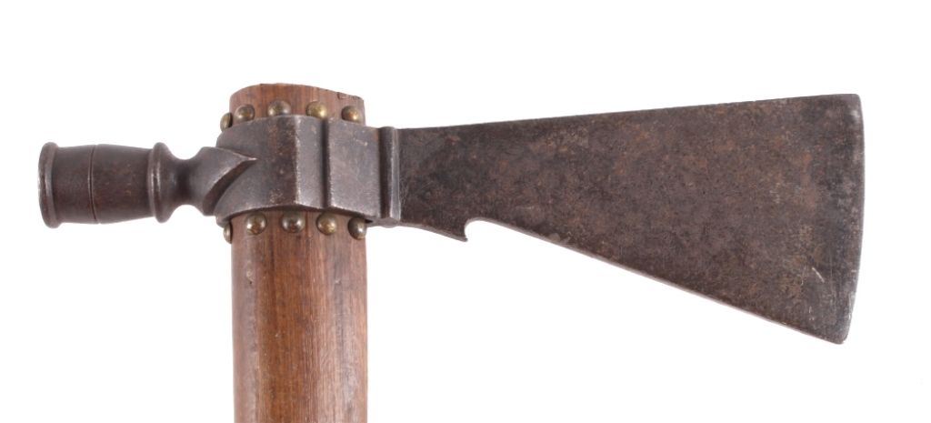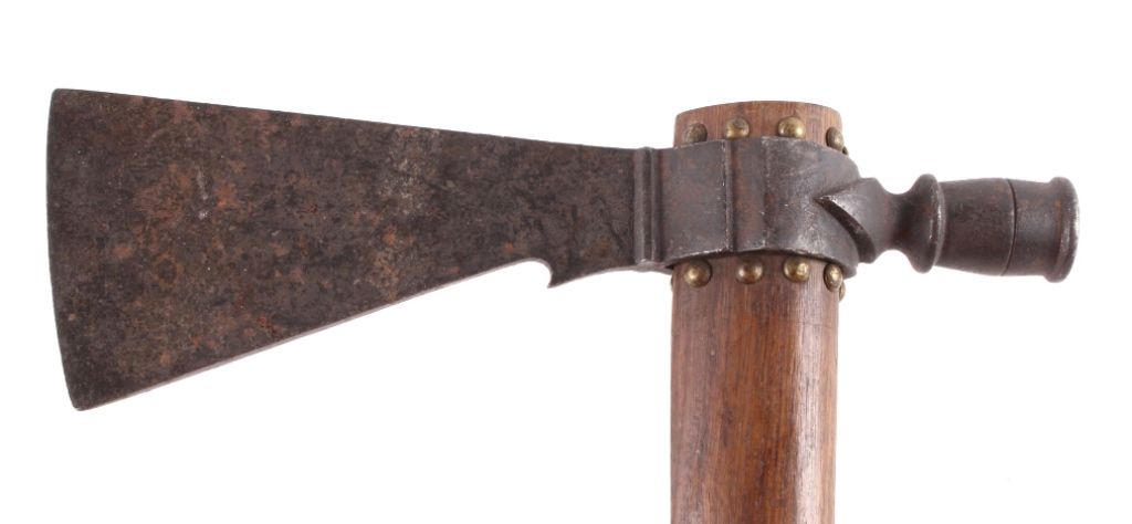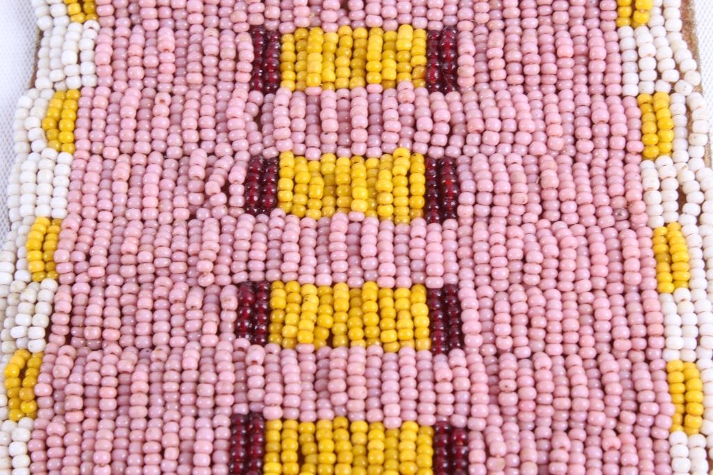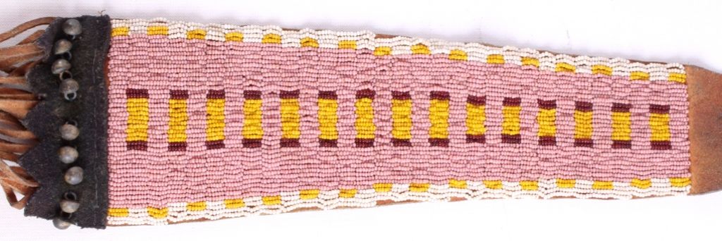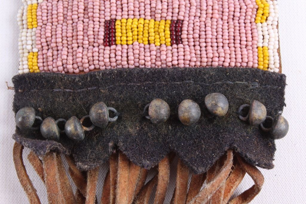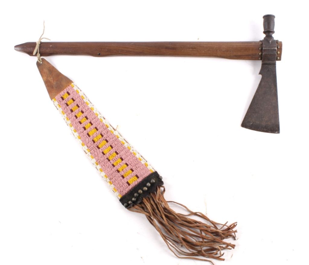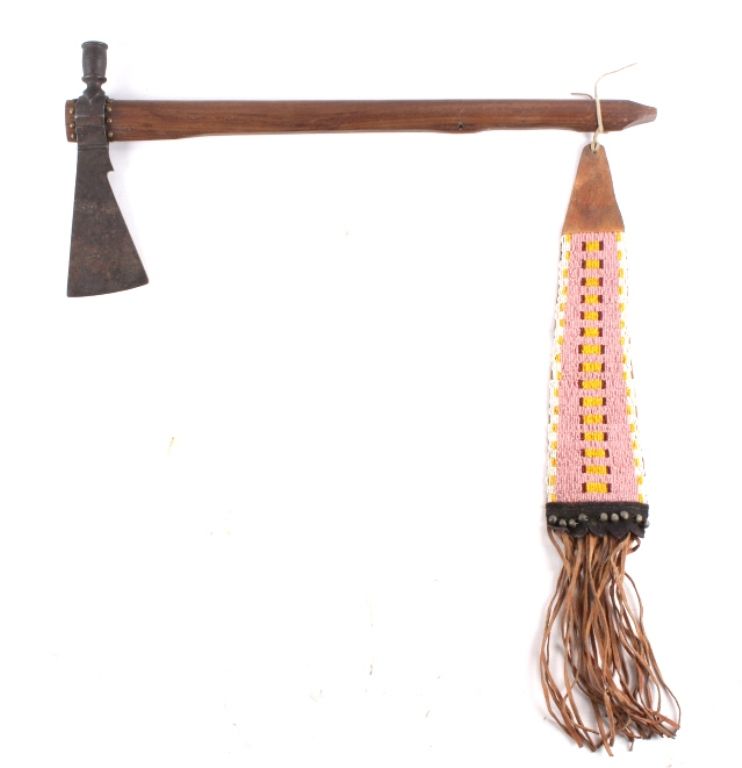 This is a wonderful piece from the Plains Native American Indians showin a pipe tomahawk with beaded drop. The beaded drop show an all sinew sewn design with early glass seed trade beads, trade brass tacks, trade cloth, hand cut long fringe, all on Indian tanned hide. The tomahawk shows a forged iron head with pipe bowl and has brass stud tacks. This rare piece is believed to be (strongly) from the turn of the century (circa 1880-1915). Tomahawk is 23.25" long with a 10.25"l x 3.25"w x 1.5"d head that has a 13/16" bowl. Beaded drop measures 24" long overall and 4" wide.