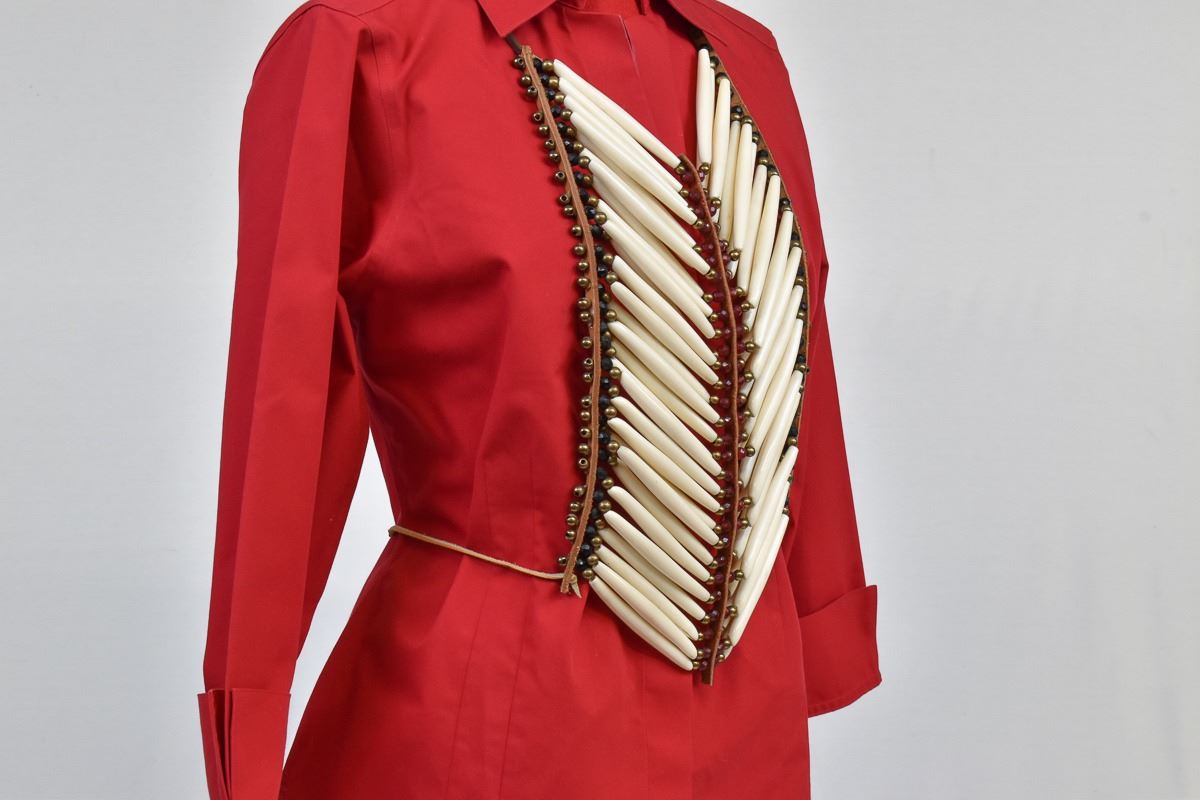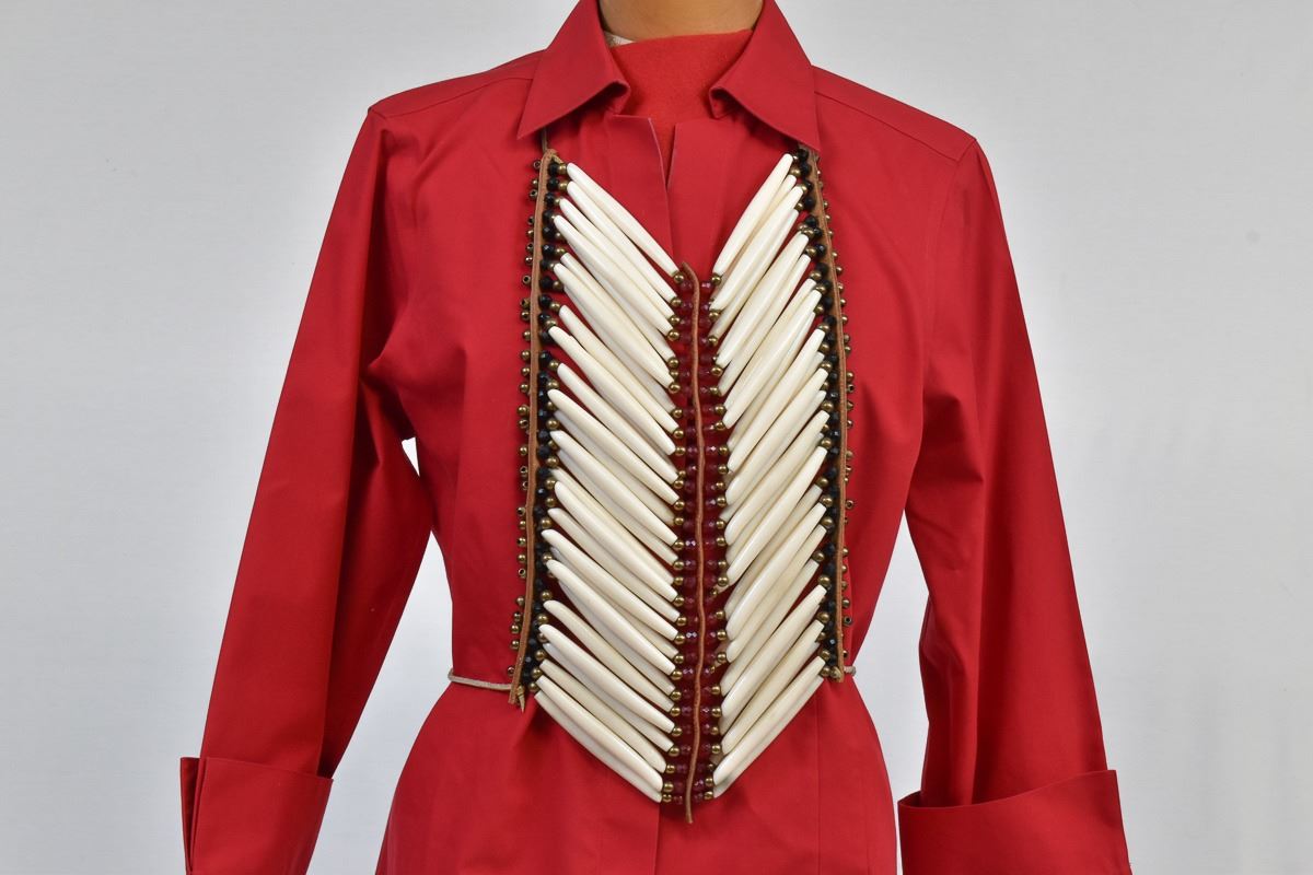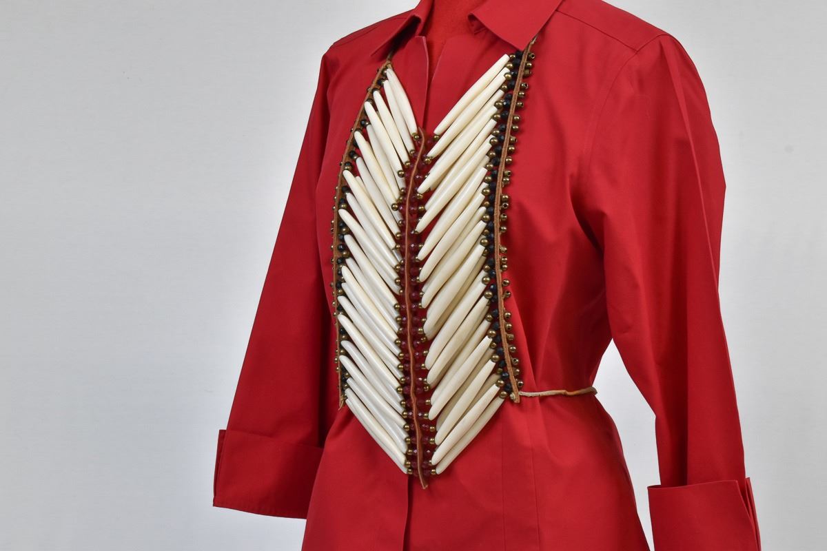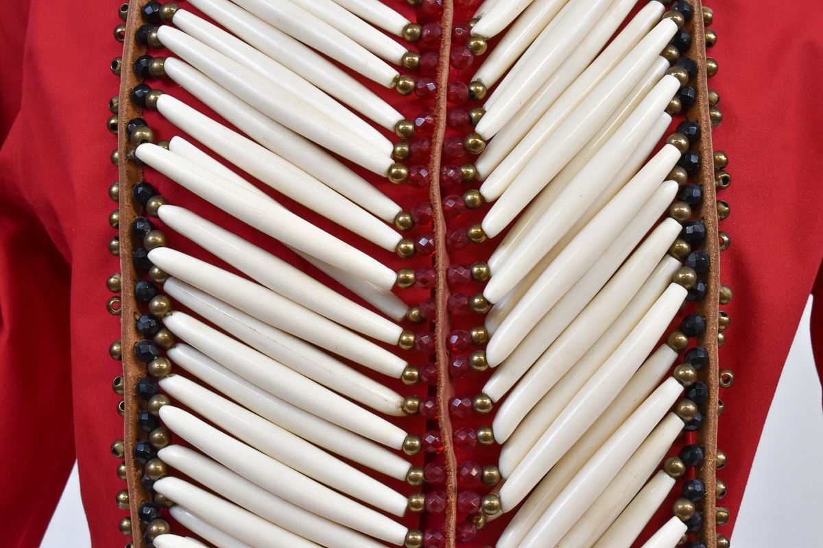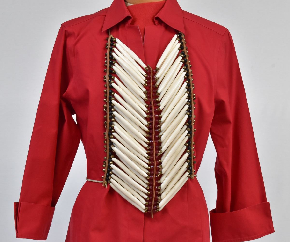 Native American Plains Indian Pipebone Breastplate, measures 11'' x 13'', embellished with faceted glass beads, brass beads, and leather