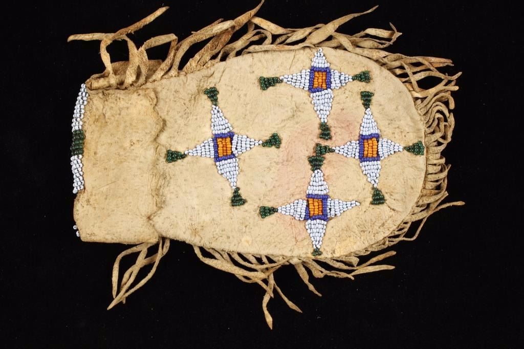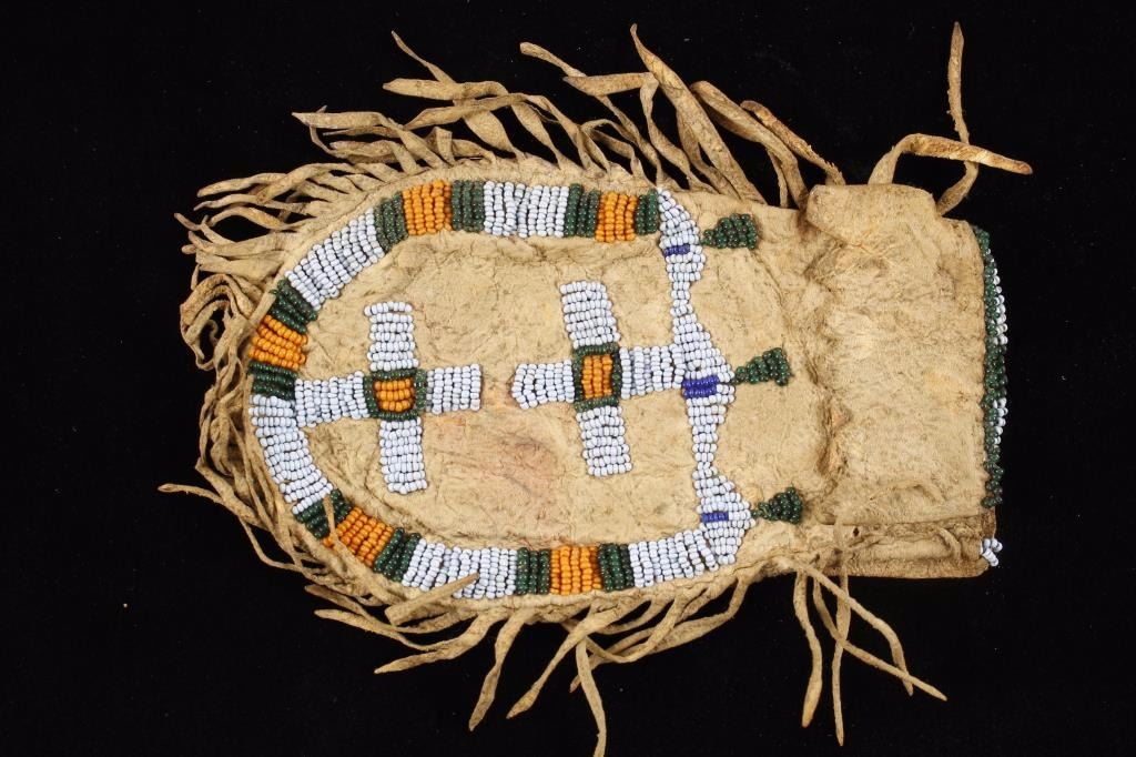 Leather construction with beaded geometric design in blue, green, and orange with fringed bottom. Overall good condition light red stain on one side otherwise good.