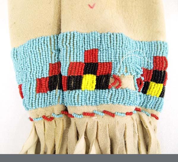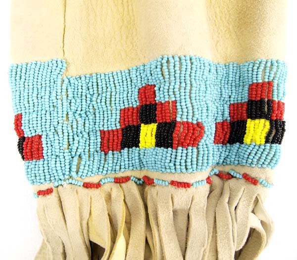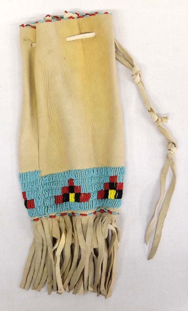 Native American Plains Indian Suede Beaded Pipe Bag. Intricate bead work adorns this suede leather bag in turquoise, red, black & yellow colors, the beading is also intricately woven into the top edge of this piece. (There are some missing beads in the larger design along the bottom as shown). This bag measures approx. 15''L x 6''W.