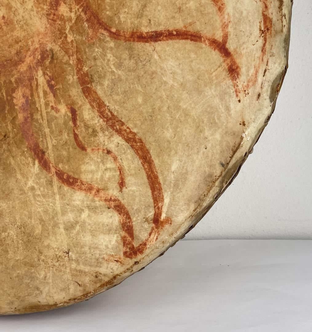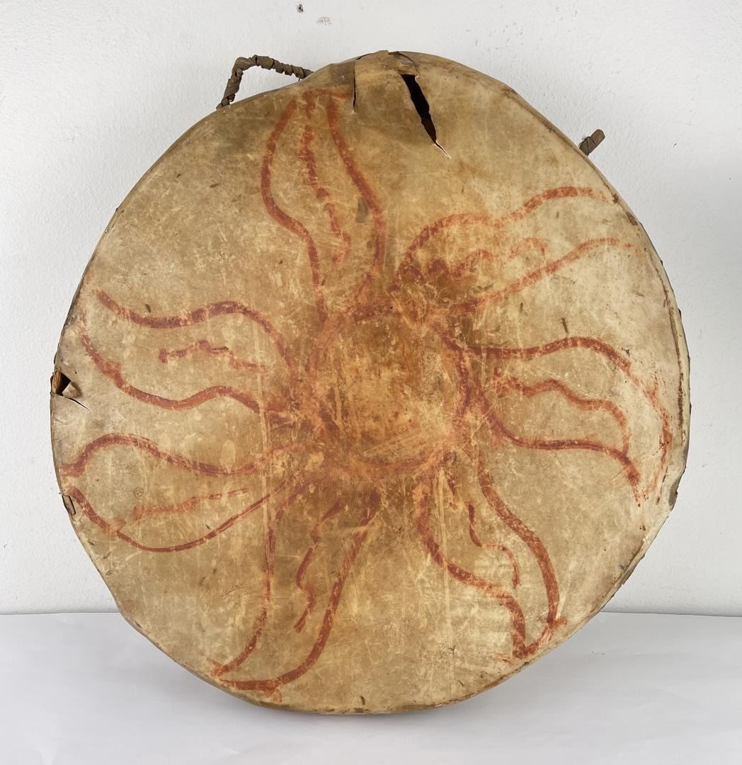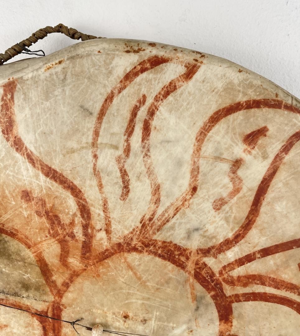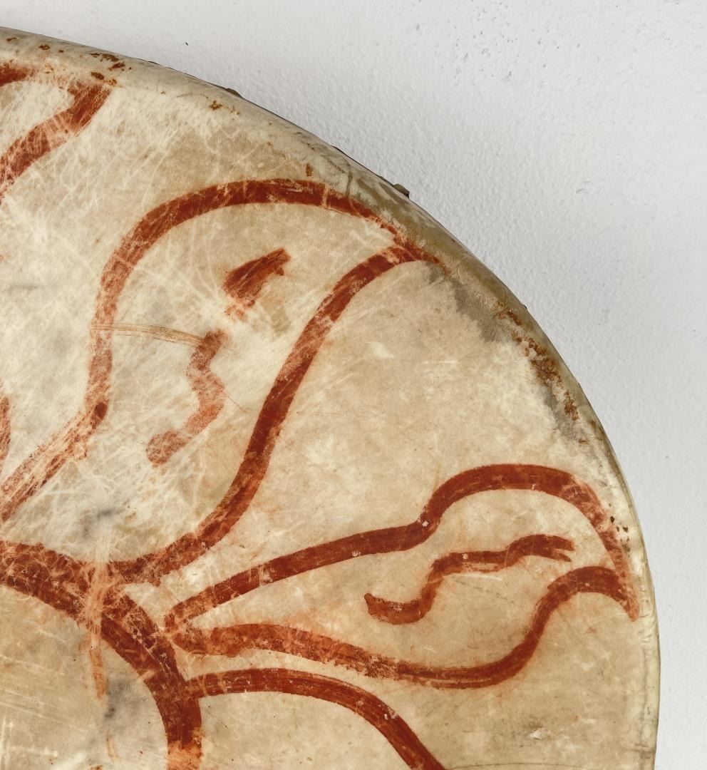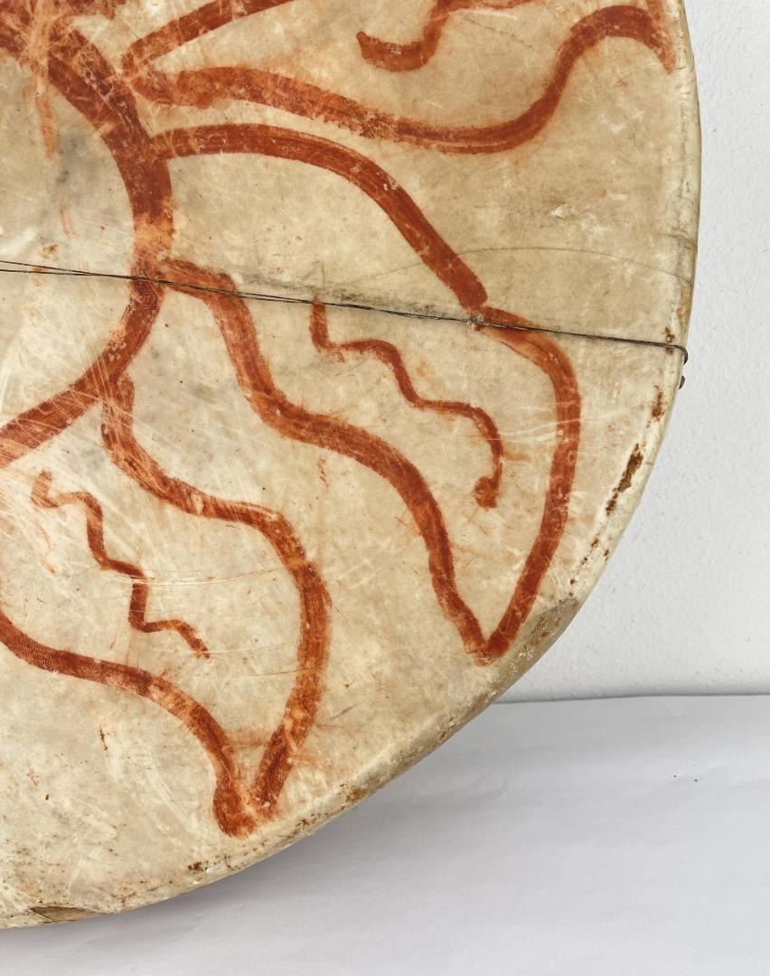 Very early drum. Original paint and wear. Wonderful patina. This example is 100% authentic unlike most you see on the market. 25" diameter. 5.25" tall. Appears to be painted with a Sun. First half of the 19th Century.