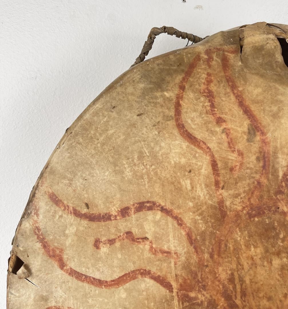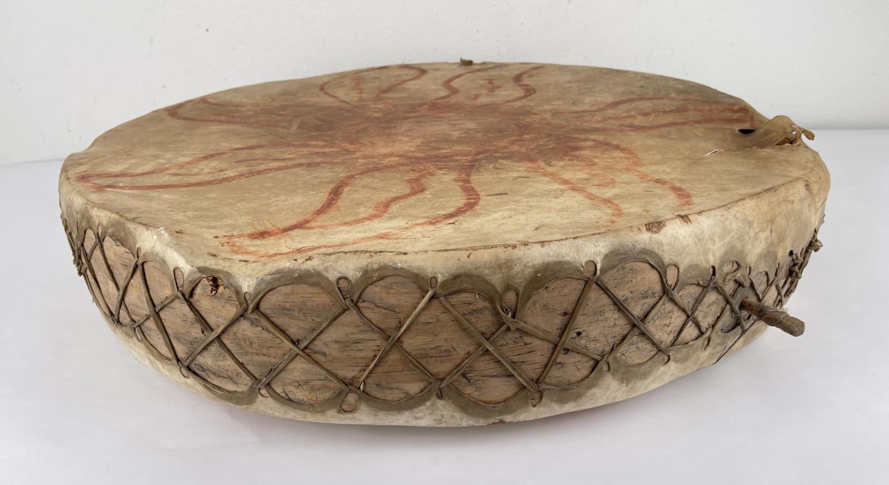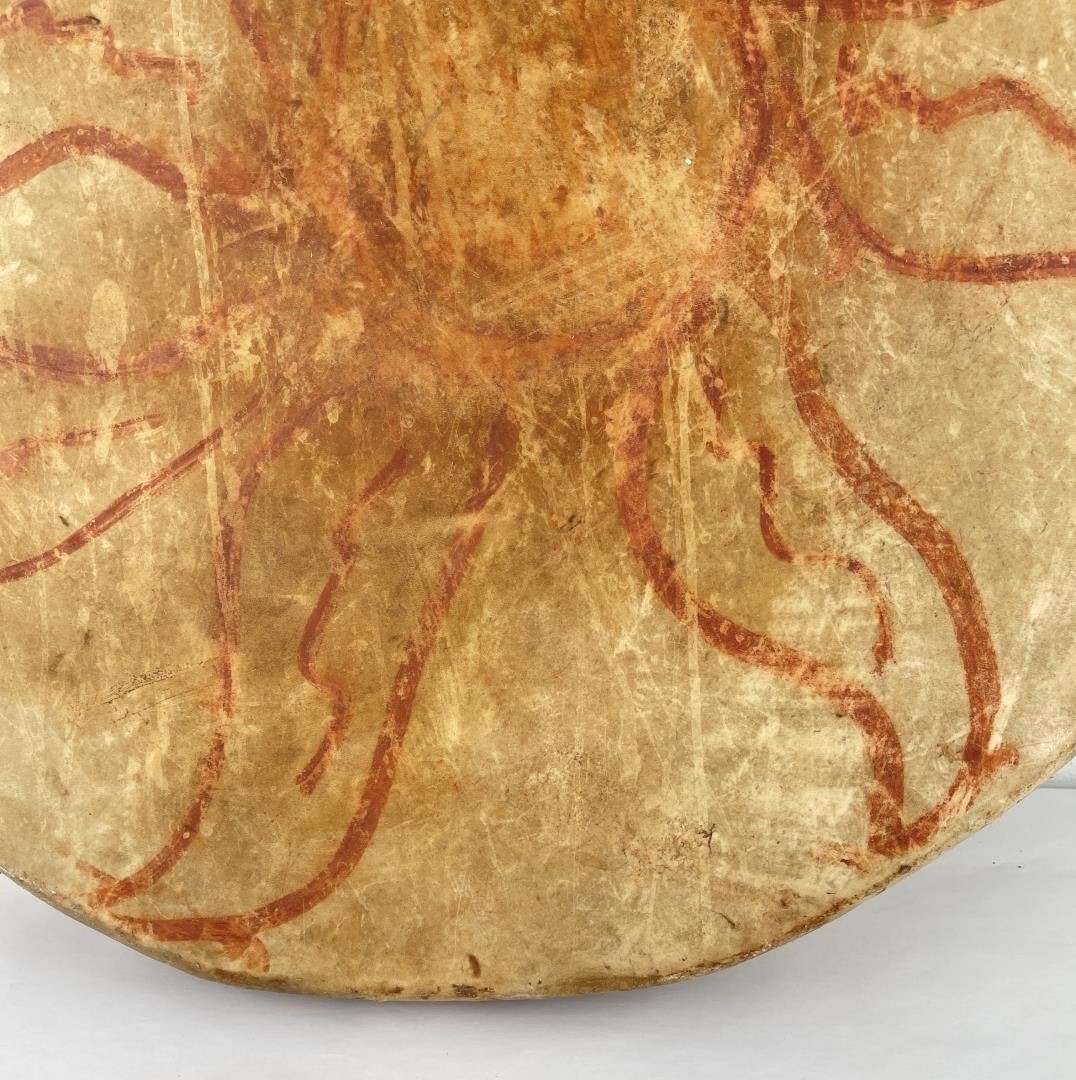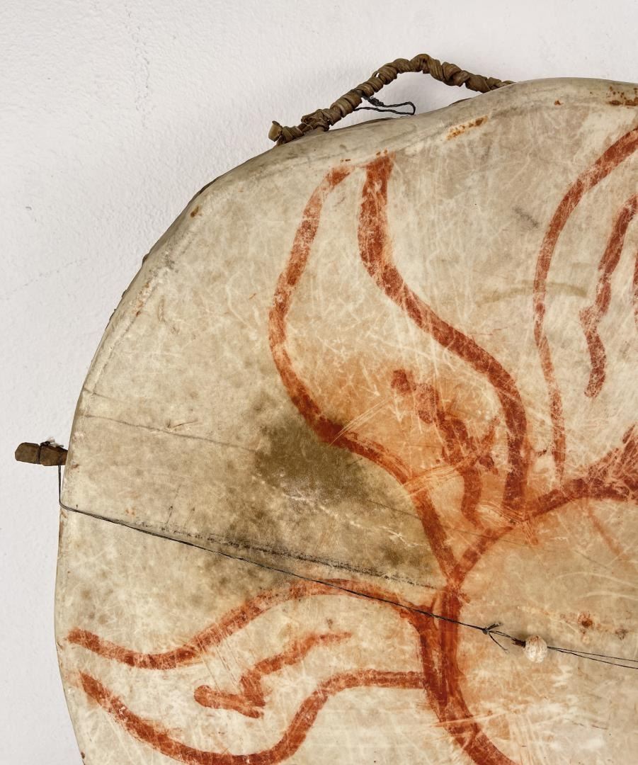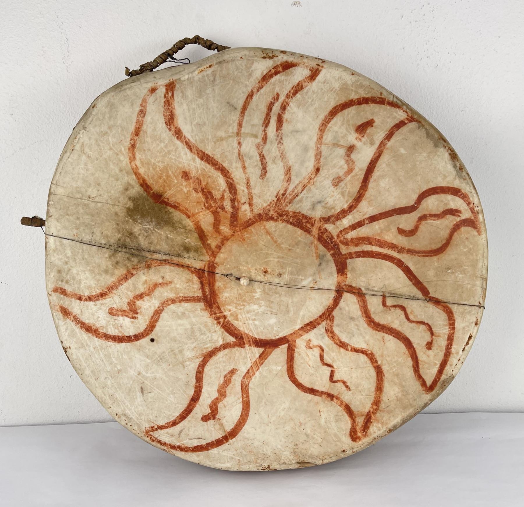 Very early drum. Original paint and wear. Wonderful patina. This example is 100% authentic unlike most you see on the market. 25" diameter. 5.25" tall. Appears to be painted with a Sun. First half of the 19th Century.