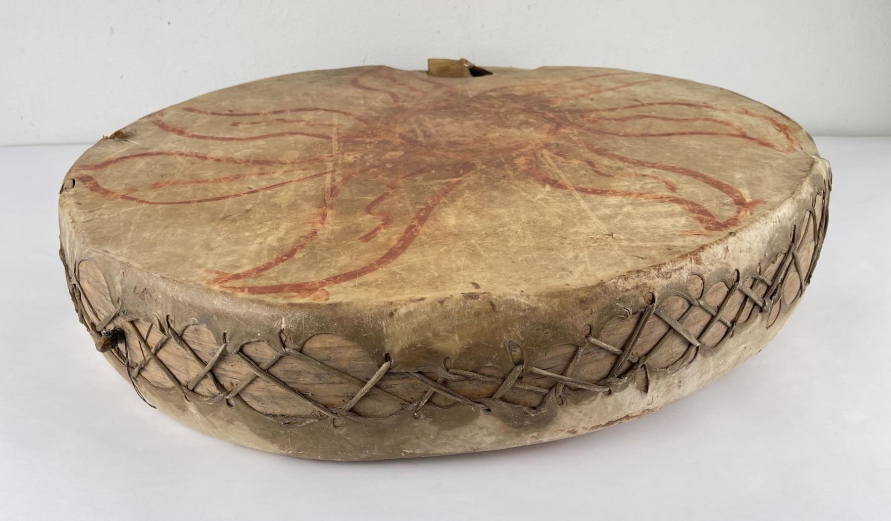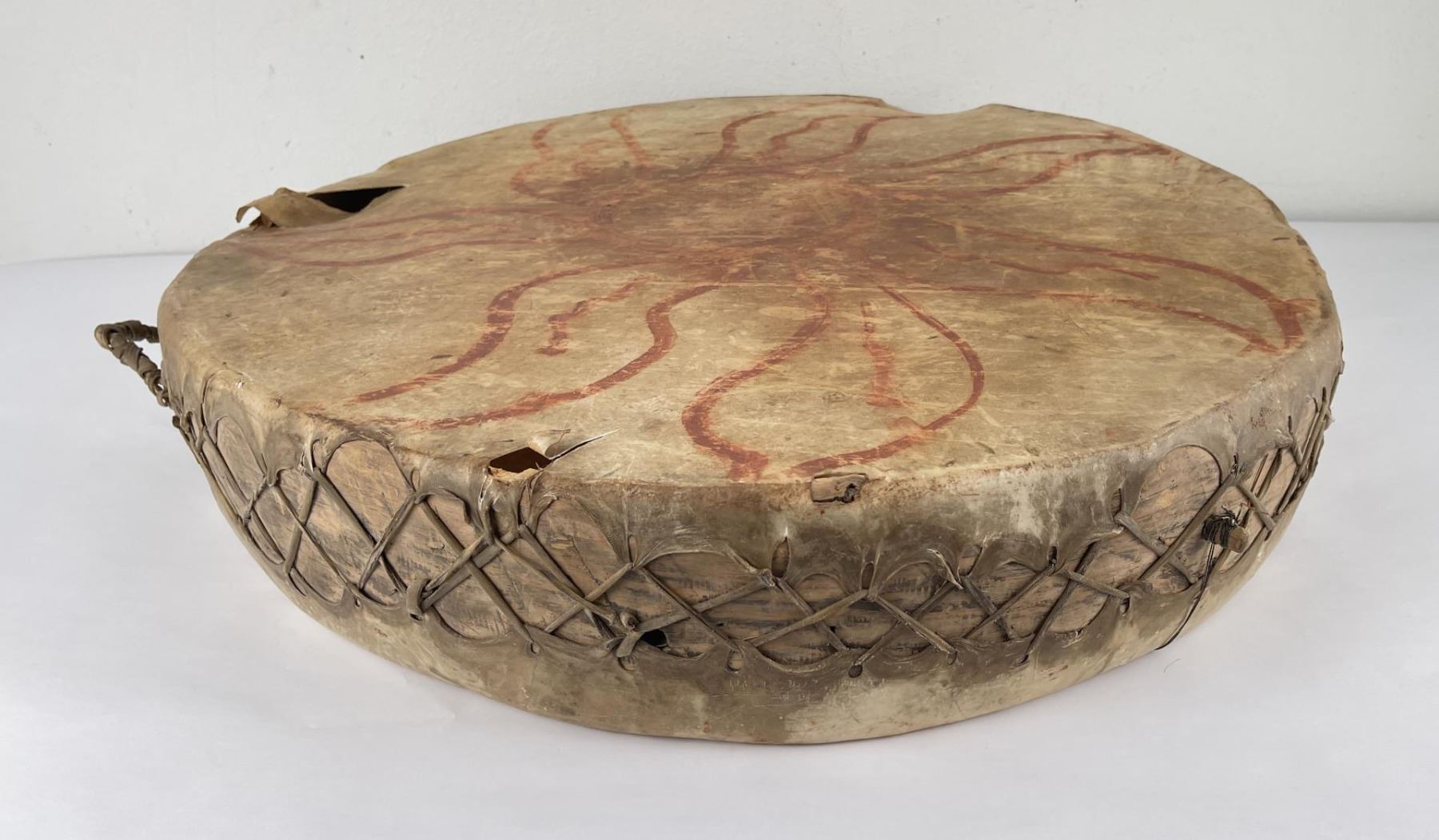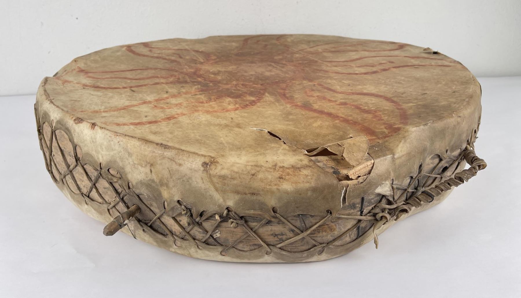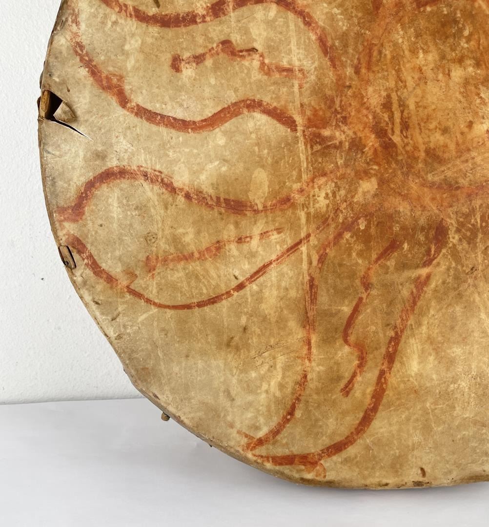 Very early drum. Original paint and wear. Wonderful patina. This example is 100% authentic unlike most you see on the market. 25" diameter. 5.25" tall. Appears to be painted with a Sun. First half of the 19th Century.
