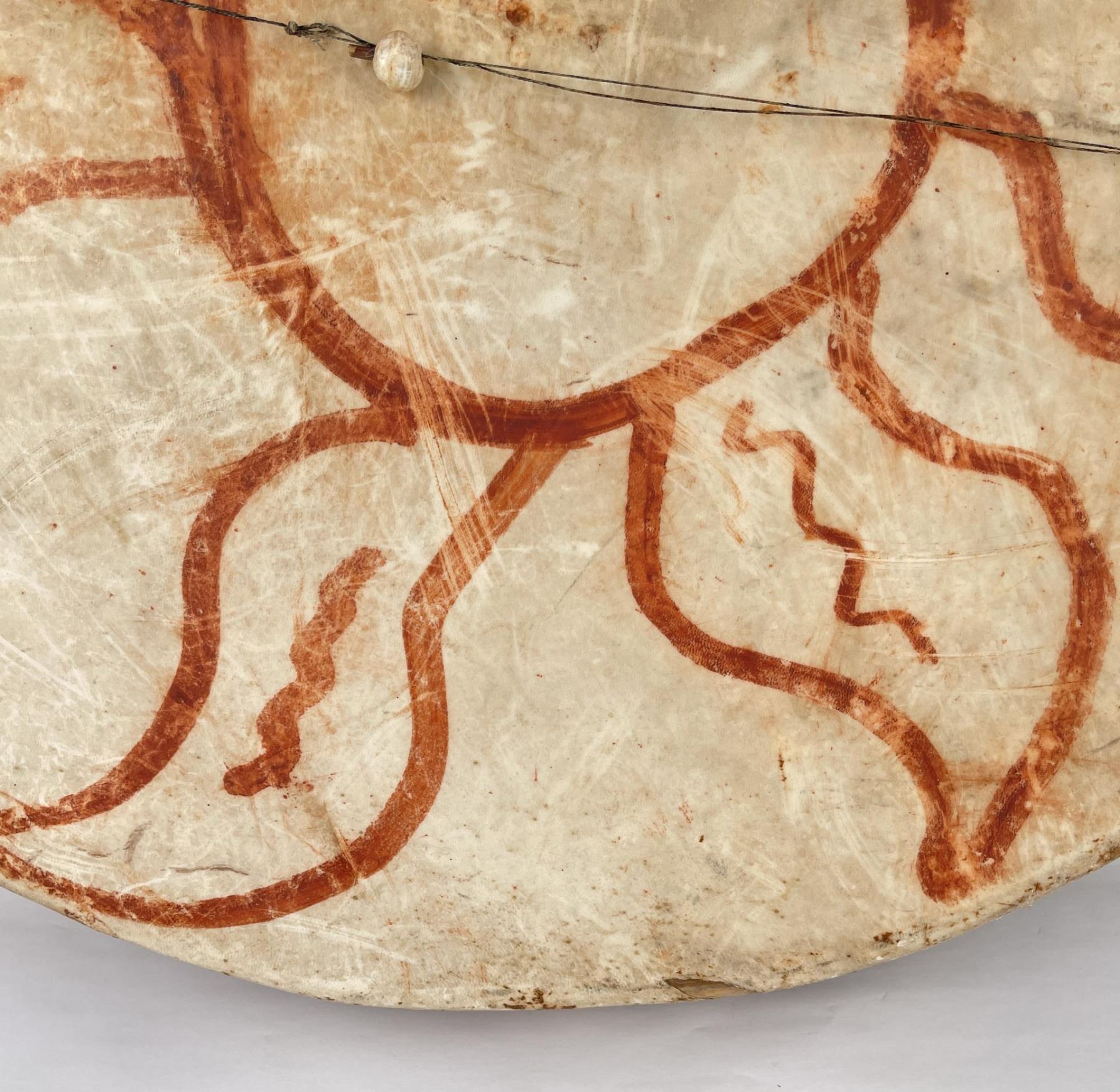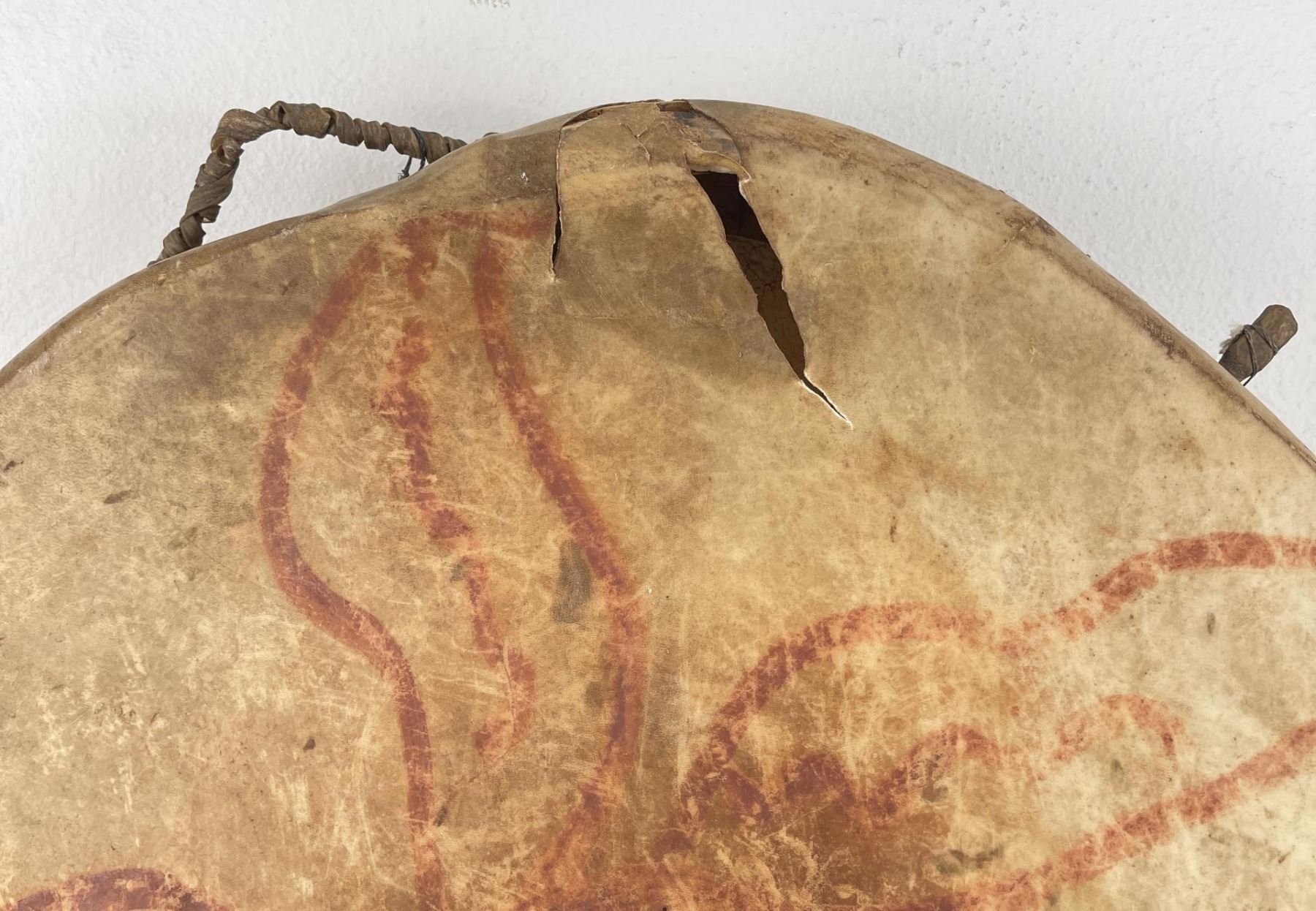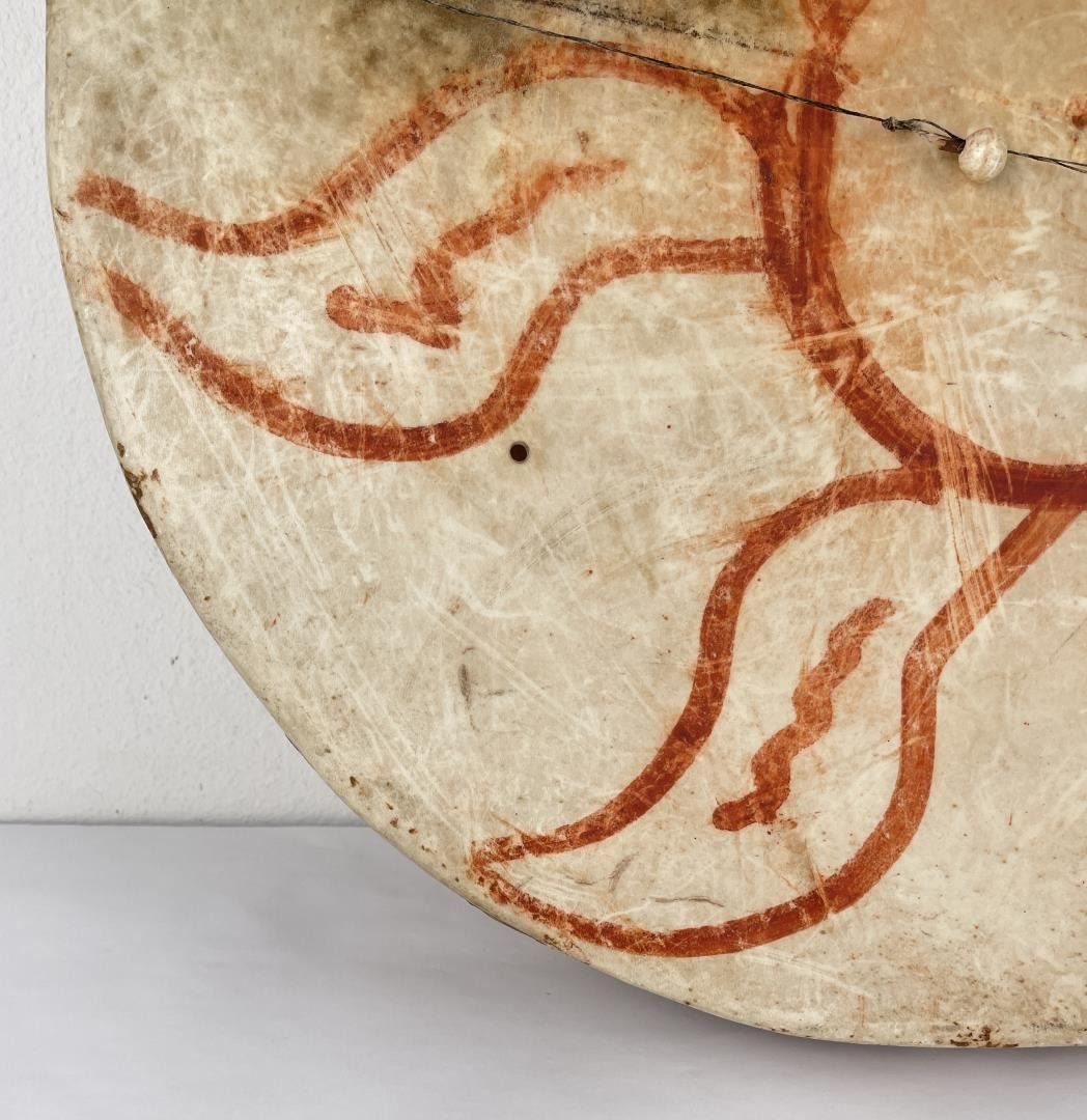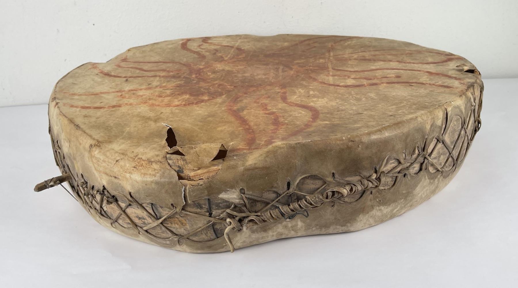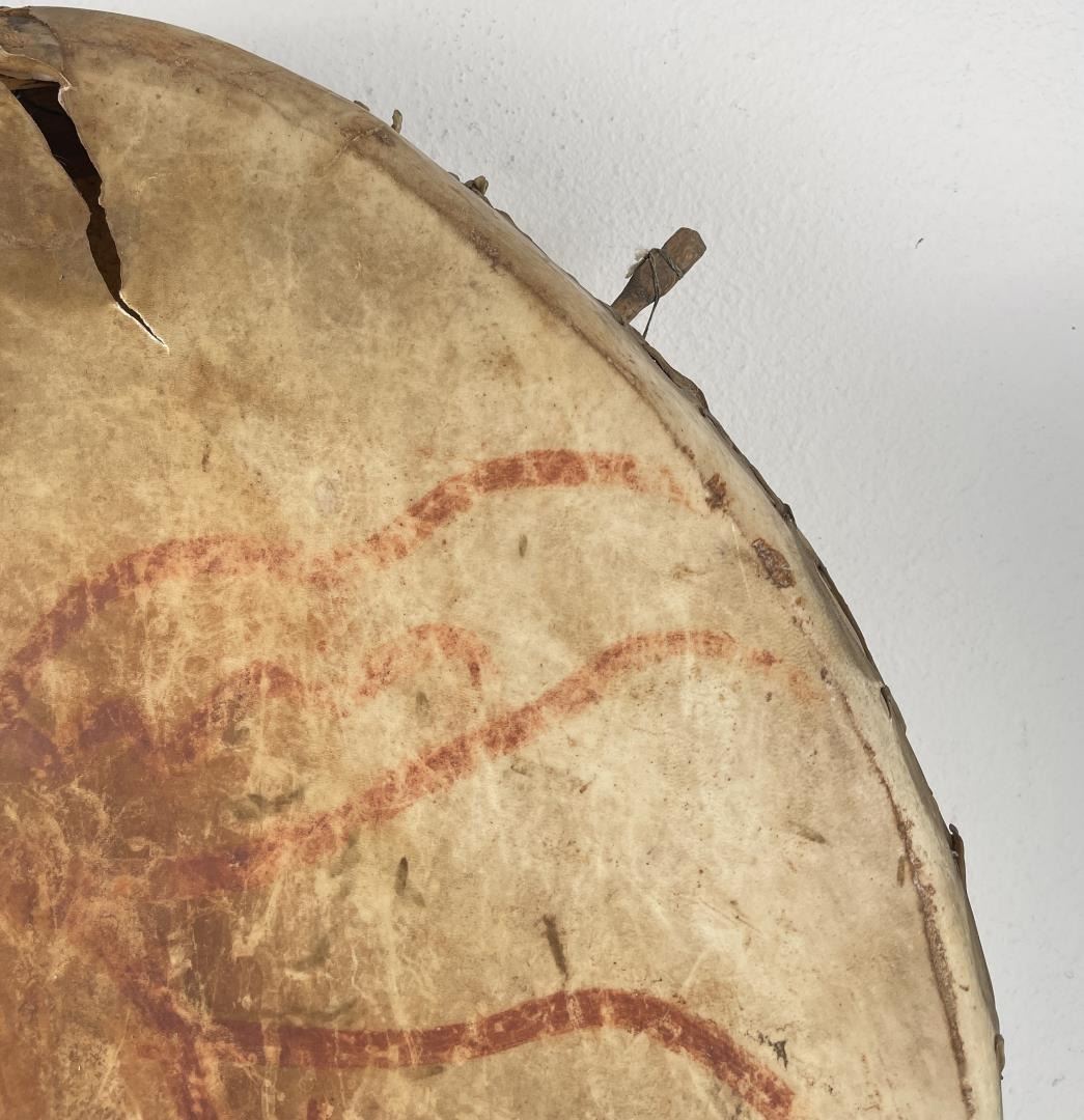 Very early drum. Original paint and wear. Wonderful patina. This example is 100% authentic unlike most you see on the market. 25" diameter. 5.25" tall. Appears to be painted with a Sun. First half of the 19th Century.