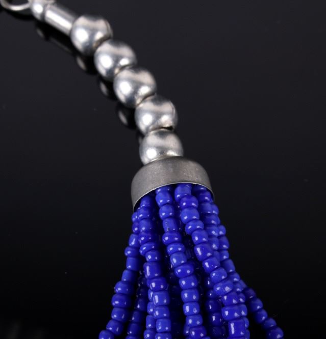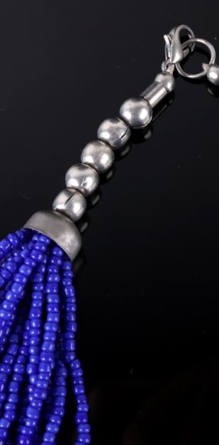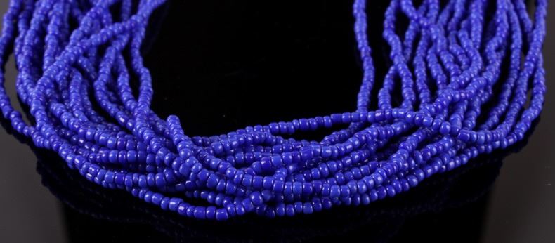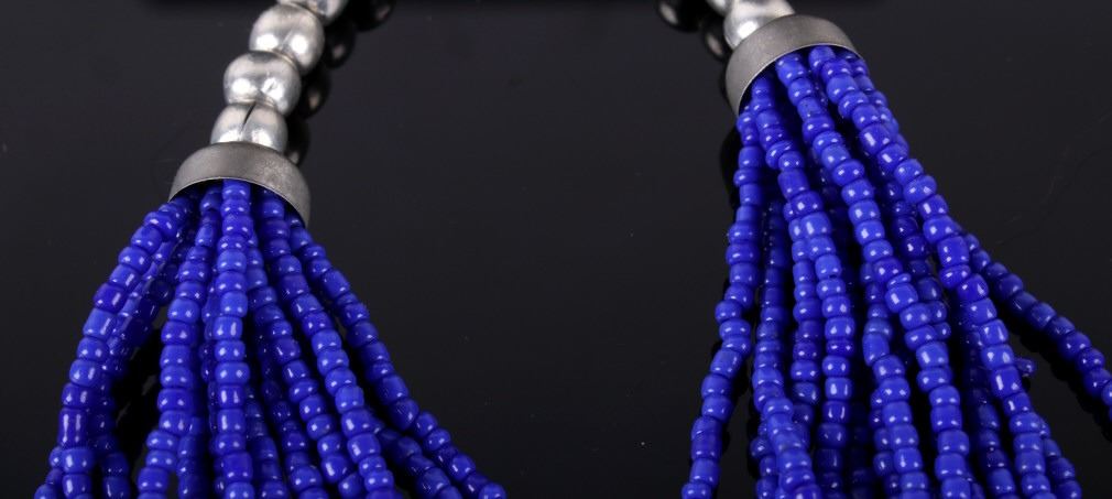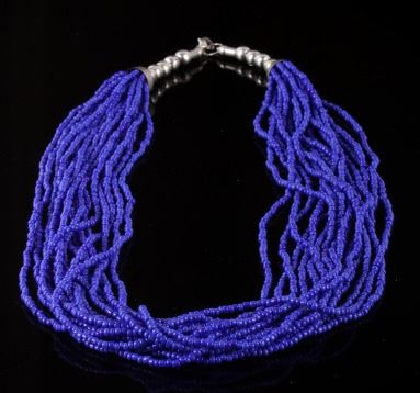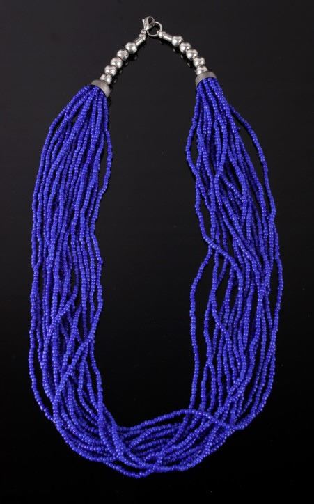 Featured in this lot is a Plains Indian beaded necklace. The necklace features 16 strands of glass blue trade beads with silver-like beads on the ends. Plains Indians, or Indigenous people of the Great Plains and Canadian Prairies, are the Native American tribes and First Nation band governments who have traditionally lived on the greater Interior Plains in North America (wikipedia). This beautiful necklace measures 10" long when strung and is in good condition.