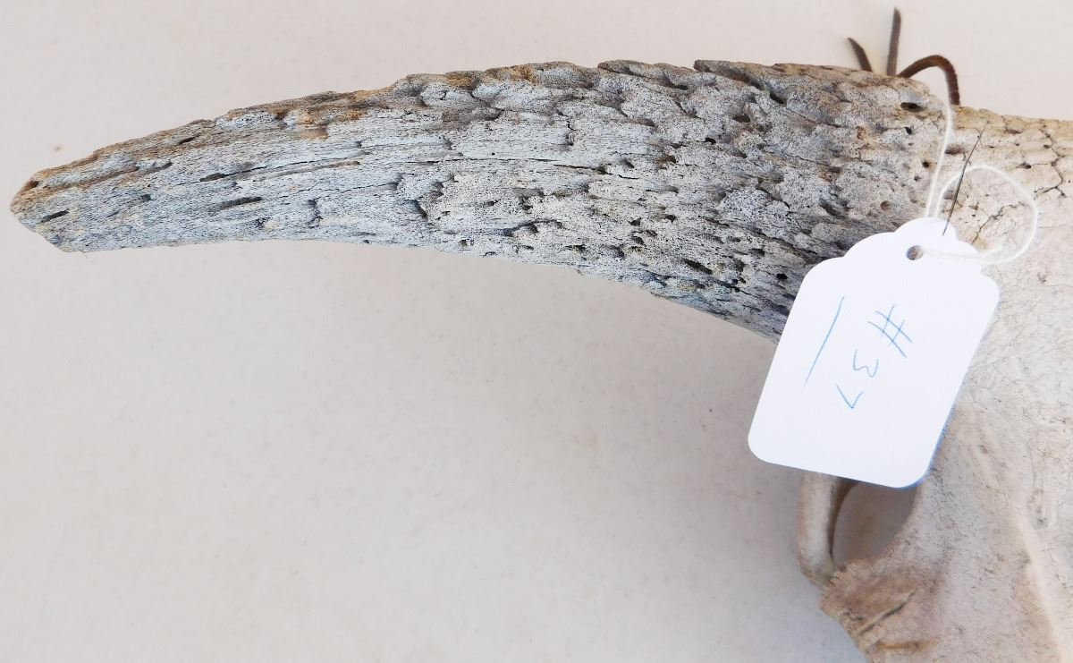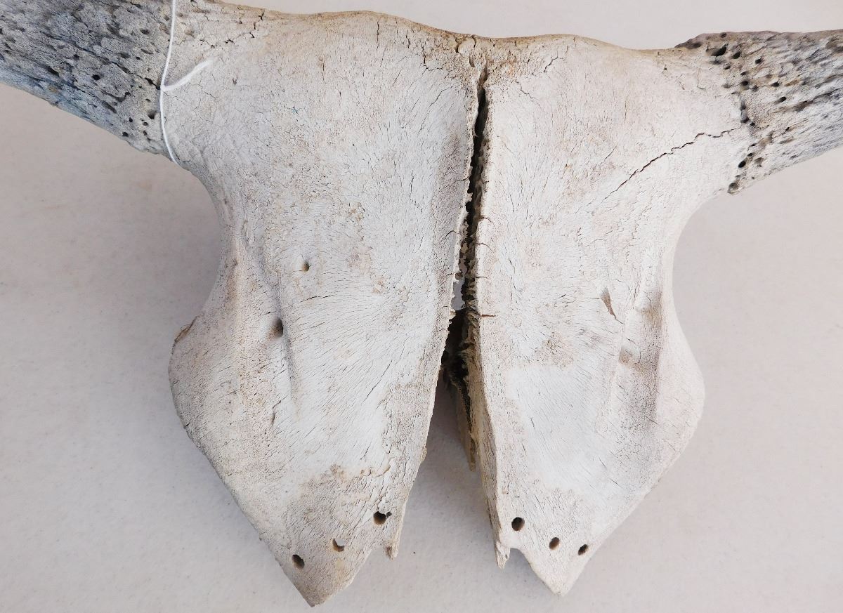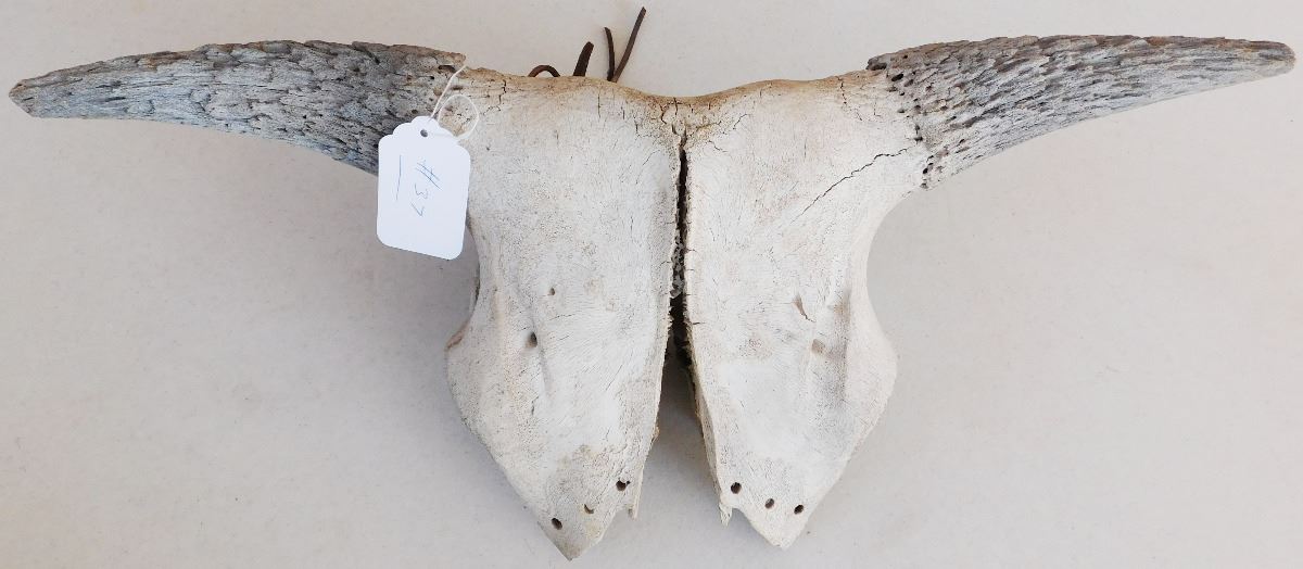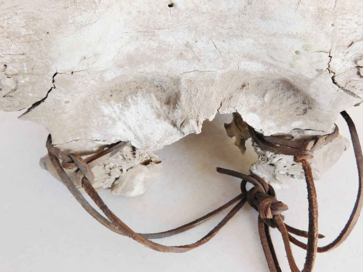 From approximately the 1800's is a Plains Indian Trail Marker Buffalo Skull which measures 23 x 9 x 5 inches. This item is believed to be Sioux or Dakota. It has normal wear. Please note the six holes drilled on the bottom of the face of the of Skull. Shipping: $45.00