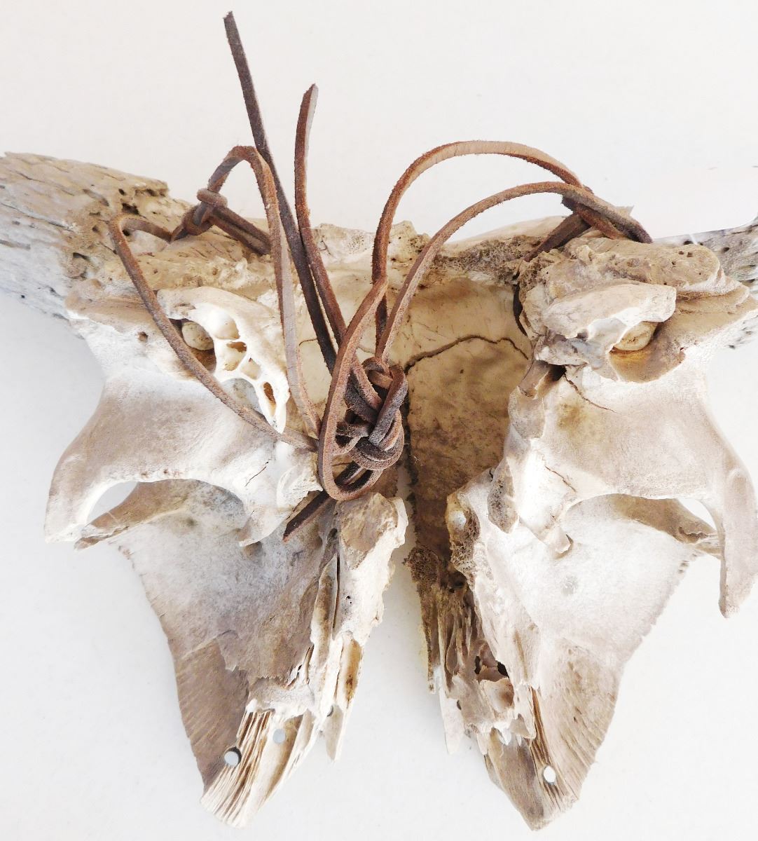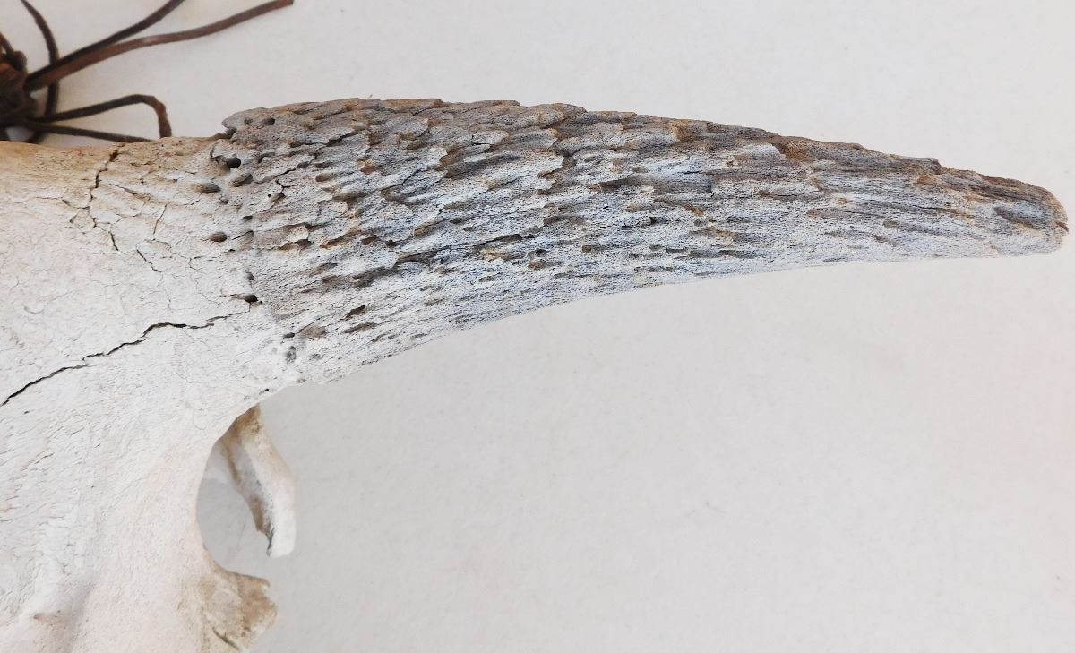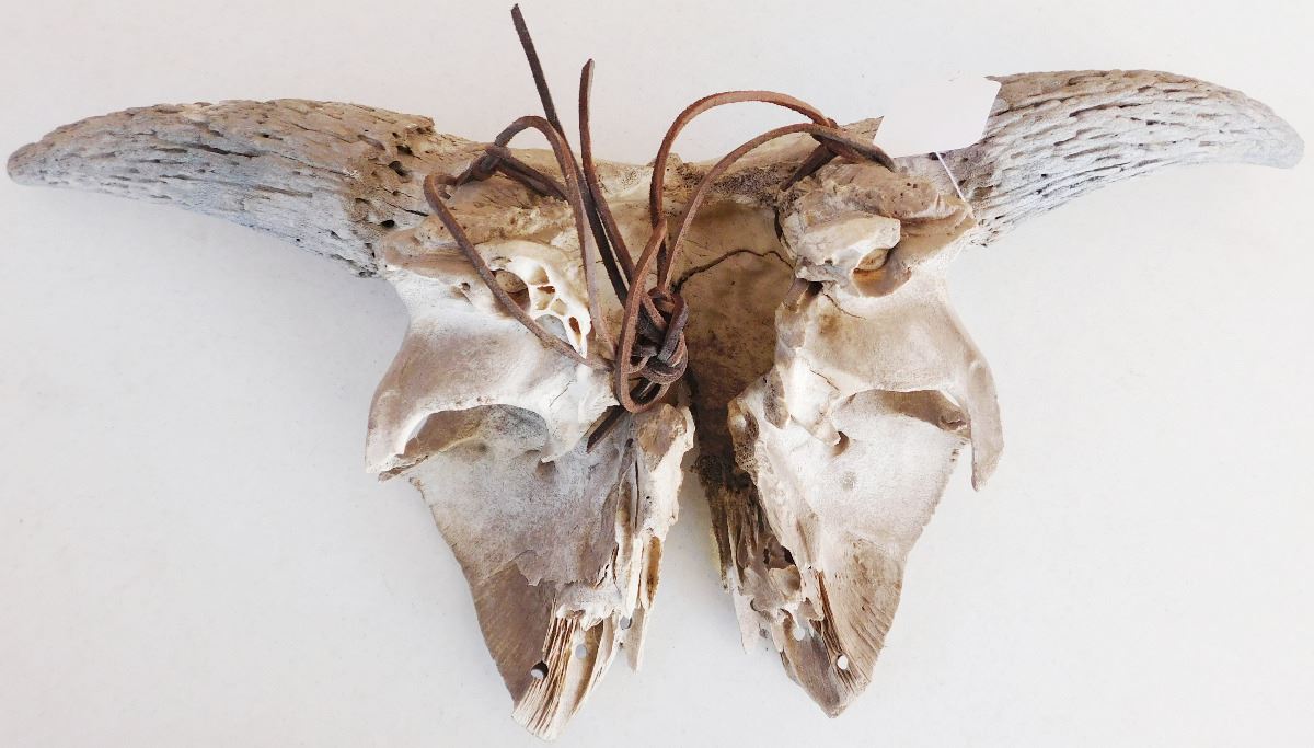 From approximately the 1800's is a Plains Indian Trail Marker Buffalo Skull which measures 23 x 9 x 5 inches. This item is believed to be Sioux or Dakota. It has normal wear. Please note the six holes drilled on the bottom of the face of the of Skull. Shipping: $45.00