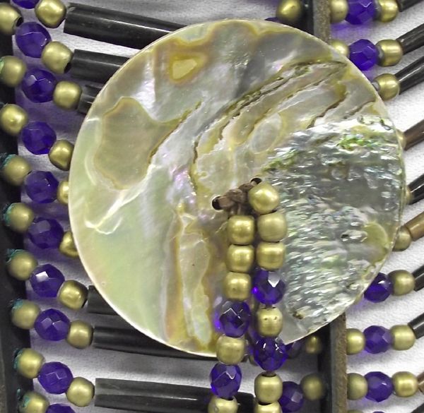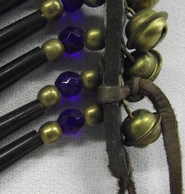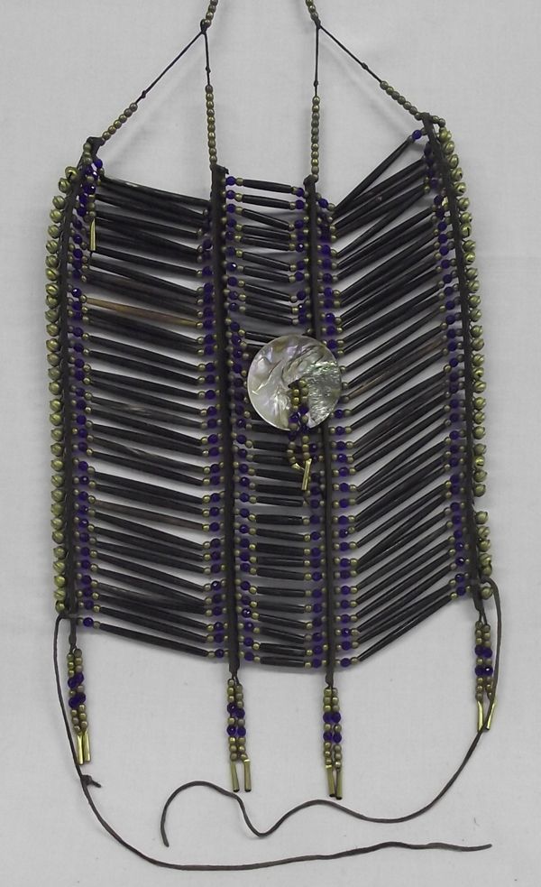 Plains Indian Tribal Breast Plate. Measures 18''H not including ties and hanging beads. Made of bison horn, trade beads and brass bells. Brass beads and abalone center disk. Fantastic display or for costume wear.