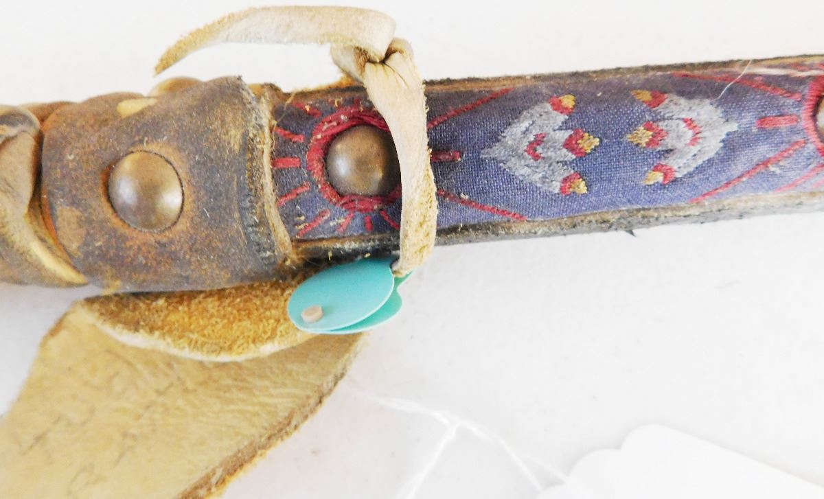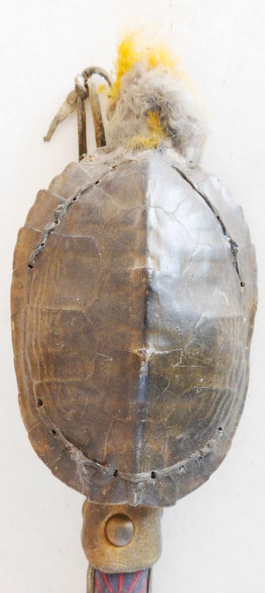 Plains Indian Turtle Rattle, circa mid-20th century. Item measures 24 x 4 x 2 inches. This rattle is made from rabbit foot fur, metal bells, rawhide, brass tacks and turtle shell. See finely sewn design. Sioux, from the Dakotas. Condition: There is some dust, wear and scruffs, see images. Shipping: $22.50.