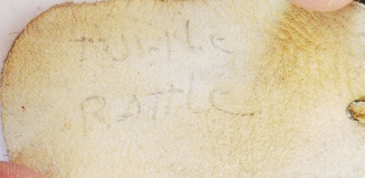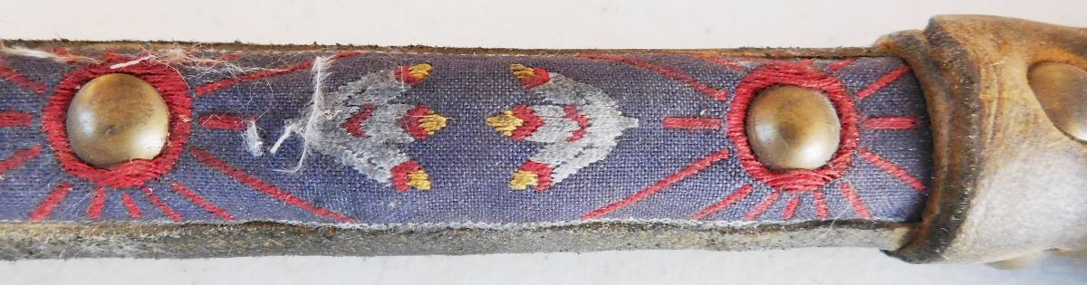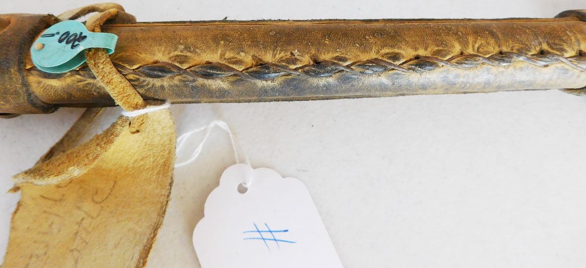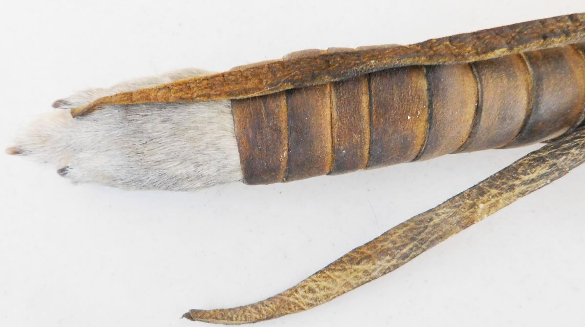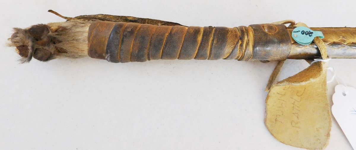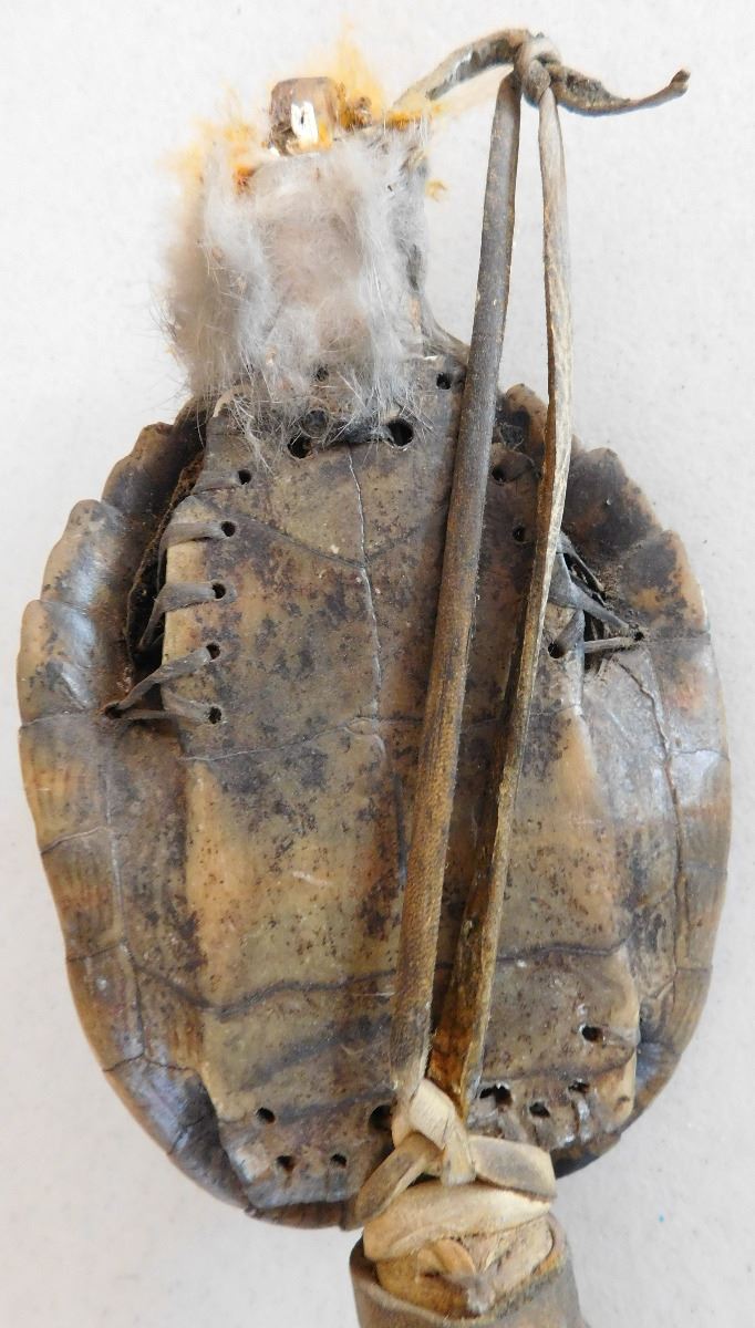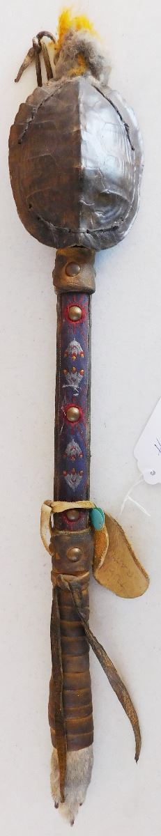 Plains Indian Turtle Rattle, circa mid-20th century. Item measures 24 x 4 x 2 inches. This rattle is made from rabbit foot fur, metal bells, rawhide, brass tacks and turtle shell. See finely sewn design. Sioux, from the Dakotas. Condition: There is some dust, wear and scruffs, see images. Shipping: $22.50.