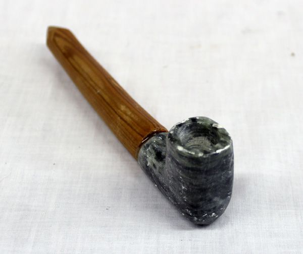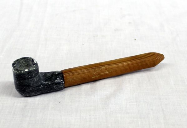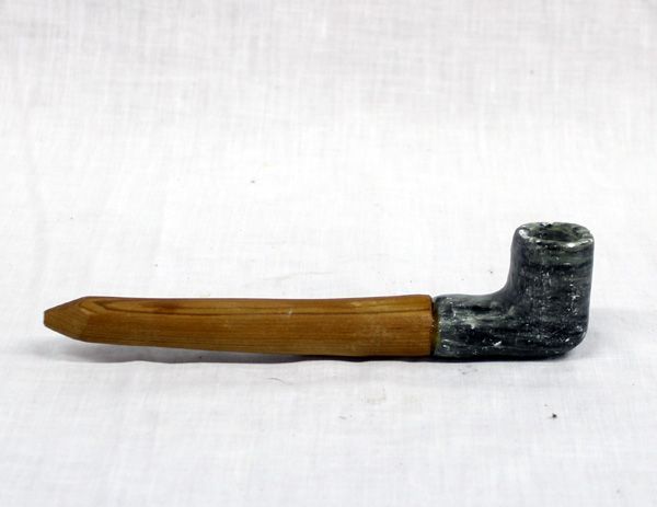 Plains Indian Woman's Soapstone Pipe, wooden handle, measures 2'' x 8'', gray and black soapstone
