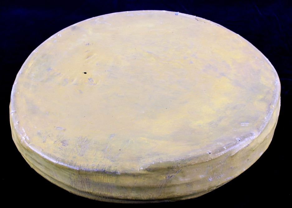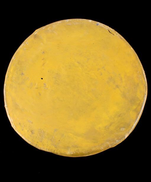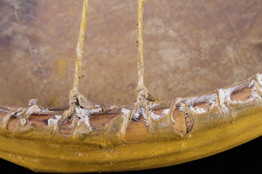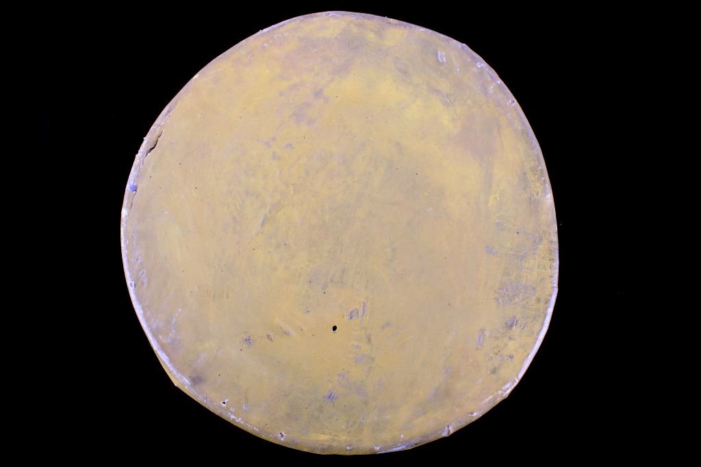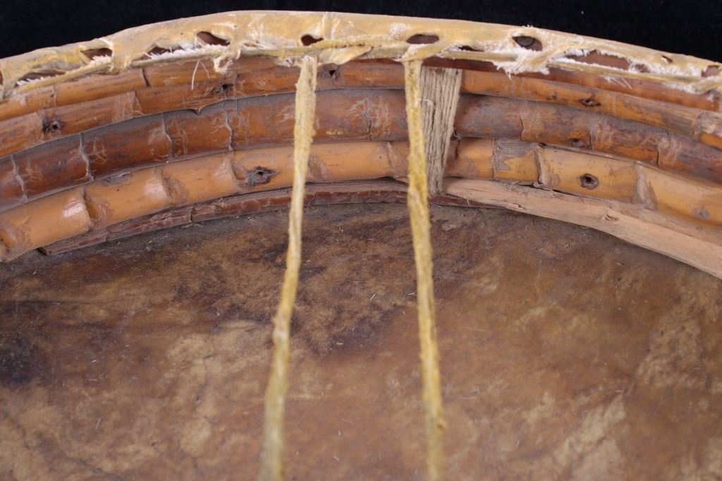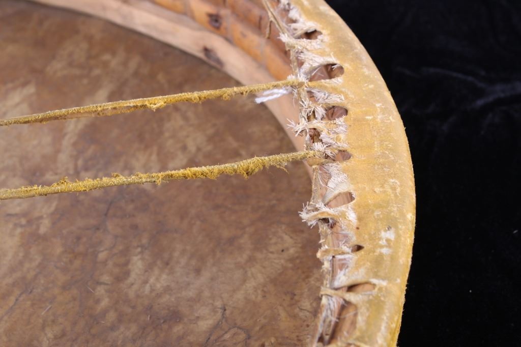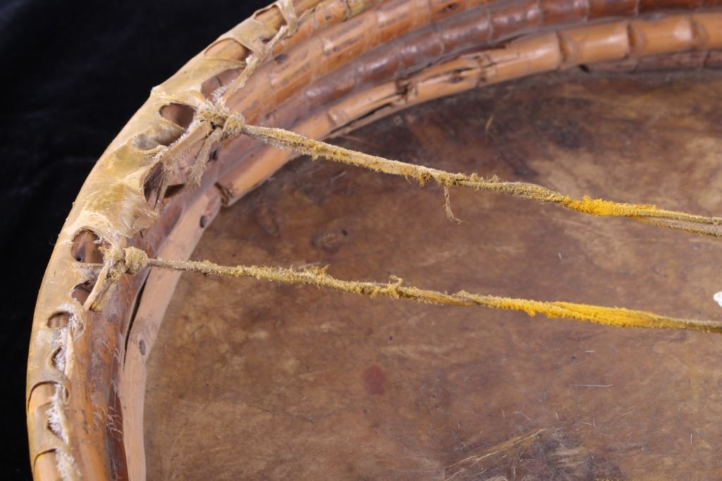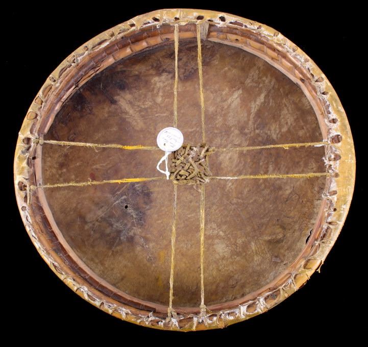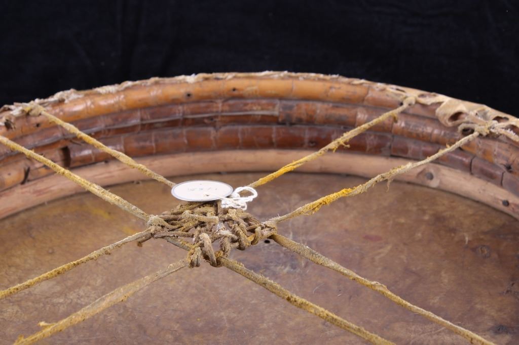 The lot features a monochrome yellow mineral painted warrior drum “Tom-Tom” from the Plains Native American Indians dating to circa 1890. The piece shows a wetted and stretched parfleche rawhide front which is wrapped over bent wood frame and is sinew rawhide sewn. The piece shows all old nail construction with the Indian tanned hide ties which meet at the center. The drum is also accompanied by an original museum collection tag (made by Jennison U.S.A.) which is marked with the collection year of 1935 and “Tom Tom about 35 years old” which would place this drum as being from circa 1890’s. The piece has a nice even mineral pigment yellow ocher natural painted finish. Provenance: From one of the largest and most prominent American Indian collections in Montana. The piece was examined by an American Indian expert and found to be an authentic Plains circa 1890 drum. The drum does not show any direct symbols or painting to denote a specific tribe, but yellow ocher paint used as a background color is prominent in Cheyenne and Northern Cheyenne drums such as the Cheyenne Ghost Dance Shield from the Yankton Museum which sold in our June 2019 sale for $8,500 and similar to the three color Cheyenne war drum from our February 2017 sale. The drum shows all the correct patina and wear from use for its early authentic 19th Century age. Measures overall 16.75” diameter by 3”D.