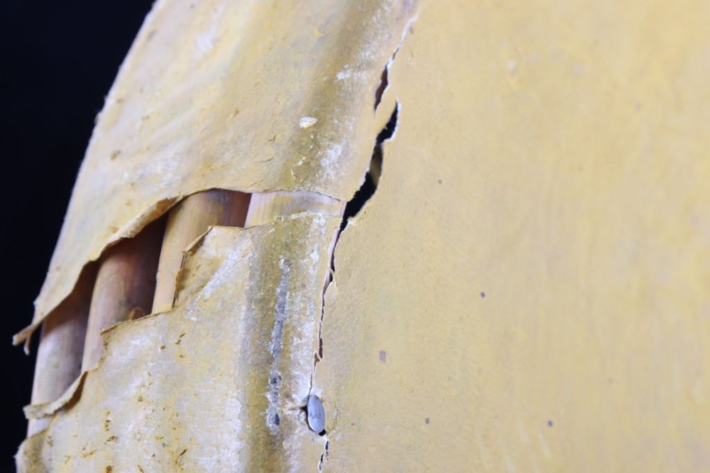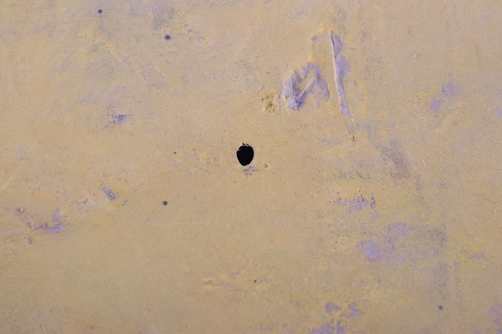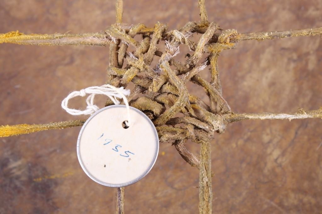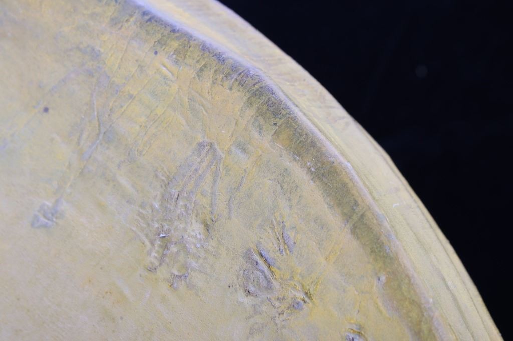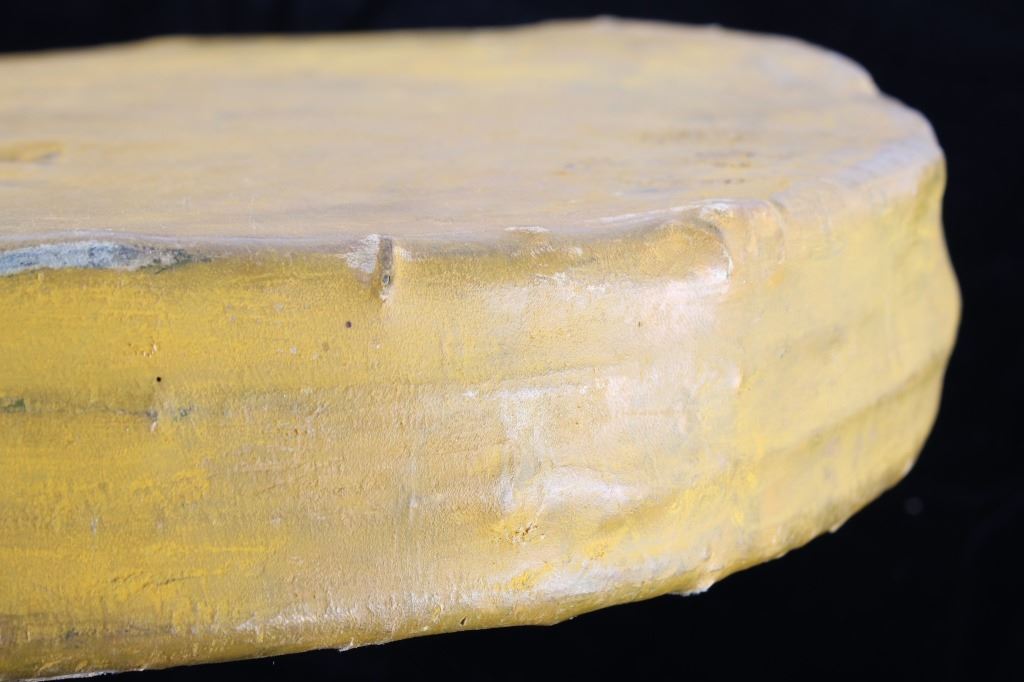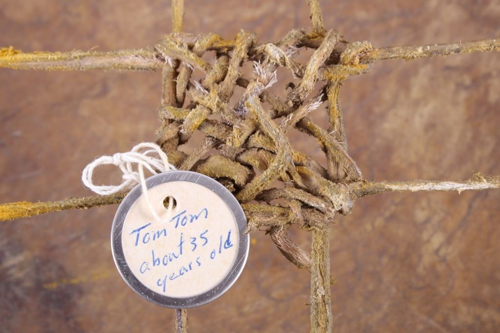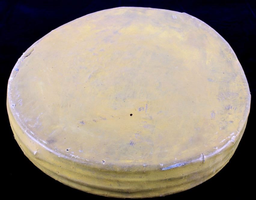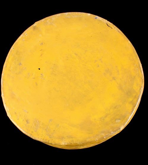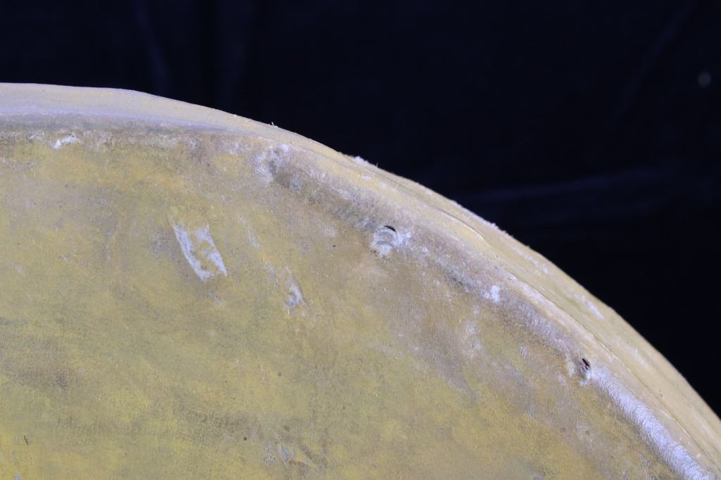 The lot features a monochrome yellow mineral painted warrior drum “Tom-Tom” from the Plains Native American Indians dating to circa 1890. The piece shows a wetted and stretched parfleche rawhide front which is wrapped over bent wood frame and is sinew rawhide sewn. The piece shows all old nail construction with the Indian tanned hide ties which meet at the center. The drum is also accompanied by an original museum collection tag (made by Jennison U.S.A.) which is marked with the collection year of 1935 and “Tom Tom about 35 years old” which would place this drum as being from circa 1890’s. The piece has a nice even mineral pigment yellow ocher natural painted finish. Provenance: From one of the largest and most prominent American Indian collections in Montana. The piece was examined by an American Indian expert and found to be an authentic Plains circa 1890 drum. The drum does not show any direct symbols or painting to denote a specific tribe, but yellow ocher paint used as a background color is prominent in Cheyenne and Northern Cheyenne drums such as the Cheyenne Ghost Dance Shield from the Yankton Museum which sold in our June 2019 sale for $8,500 and similar to the three color Cheyenne war drum from our February 2017 sale. The drum shows all the correct patina and wear from use for its early authentic 19th Century age. Measures overall 16.75” diameter by 3”D.