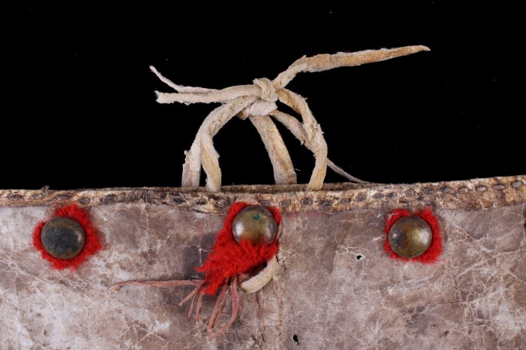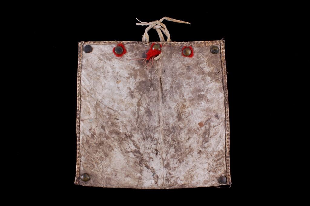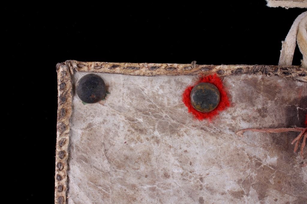 For your consideration is this Plains Indians polychrome painted Parfleche purse, circa 19th C. This is a good Parfleche purse, with leather straps shown at the top, geometric patterns painted with mineral polychrome paint, and a naturally tanned hide. This purse shows seven large brass tacks on the other side of the polychrome painted side of the purse. The condition of this Parfleche purse is good, with wear consistent with age and some fading to the polychrome paint. The measurements of this purse are 12 1/4" x 11".