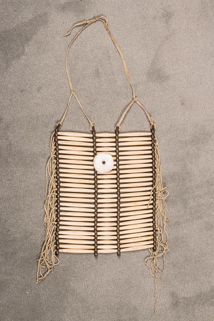 Plains Man's Breast Plate. 12" x 10". Classic 19th century style with 78 bone hairpipes strung on harness leather with tacks and fringe, accented with a round bone cutout.