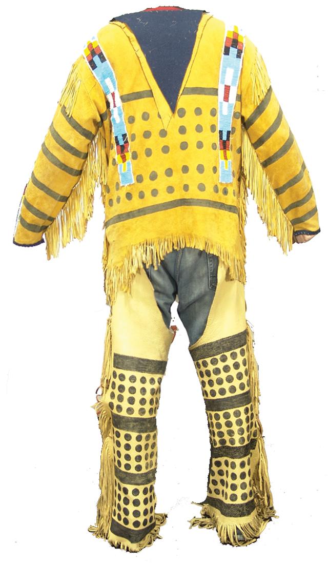 Mid 1900s, Beautiful beaded hide shirt done in traditional style with beaded chest and arm strips, the beautiful chaps done in the same beaded design and with painted dots. Man's XL