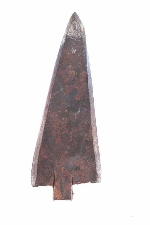 The lot features fourteen arrow metal points attributed to the Plains Indians from the Sundog Bruce VanLandingham collection. The collection includes fourteen arrow metal points being manufactured from sheet iron in traditional fashion. The arrowheads or spear points show a ground edge and cut back with dark coloring. Provenance: From the renowned Sundog Fine Art Bozeman, Montana collection and acquired by Bruce VanLandingham. Bruce VanLandingham was a pillar in the American Indian collecting community and a respected expert. Along with being an avid collector Bruce also was the sole owner of Sundog Fine Art Gallery in Bozeman which was both part museum and gallery. The exact age of the pieces are unknown. The largest measures 3.25"L by 1.25"W.