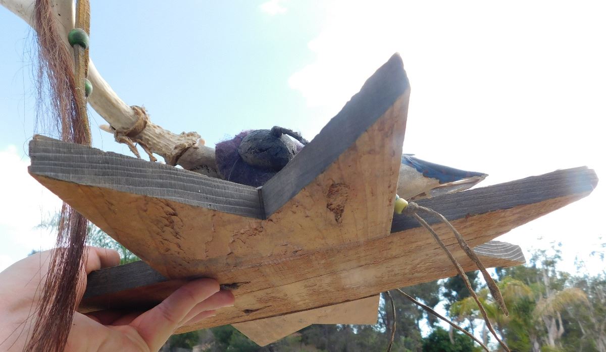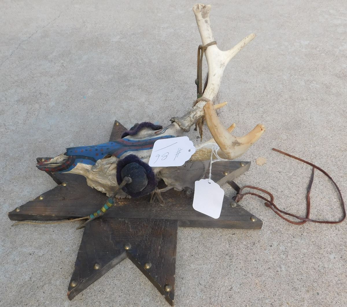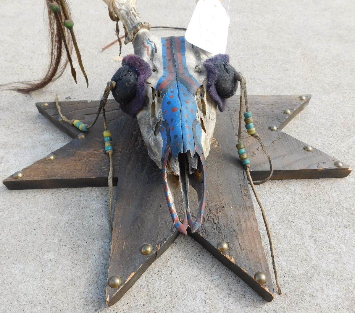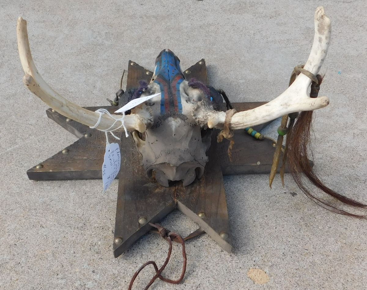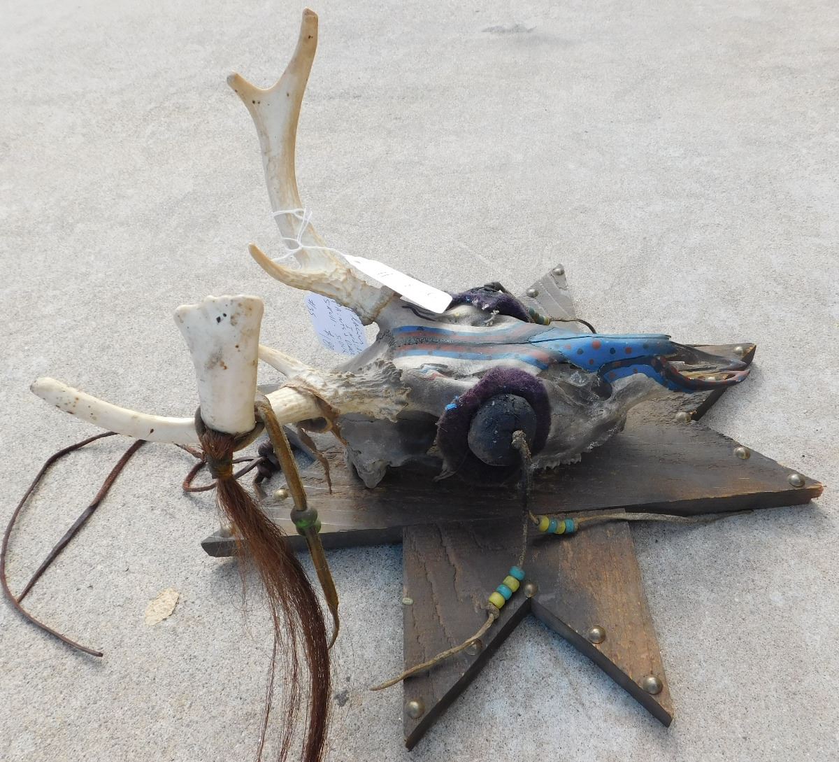 Plains Mounted Trail Marker, mid-20th century item. Made of deer skull, wood, beads, leather, and brass tacks. It has been painted red, black and blue. Sioux, South Dakota. Condition: There is some minor wear, see images. Shipping: $34.00.