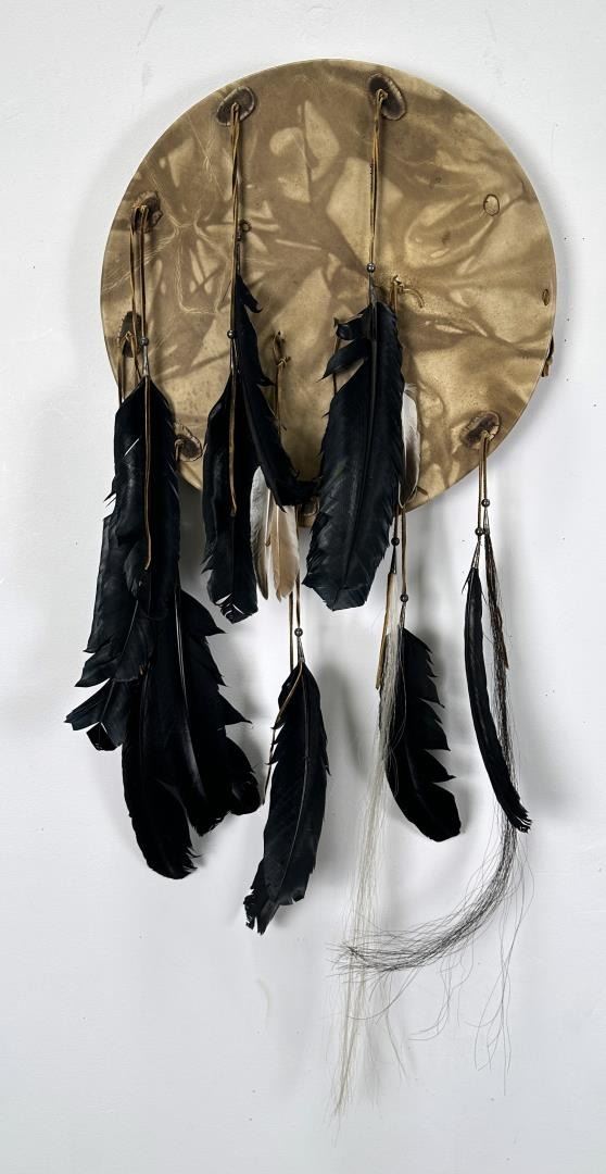 Dyed turkey feather adornments. Measures 16" in diameter by 2 1/2" thick.