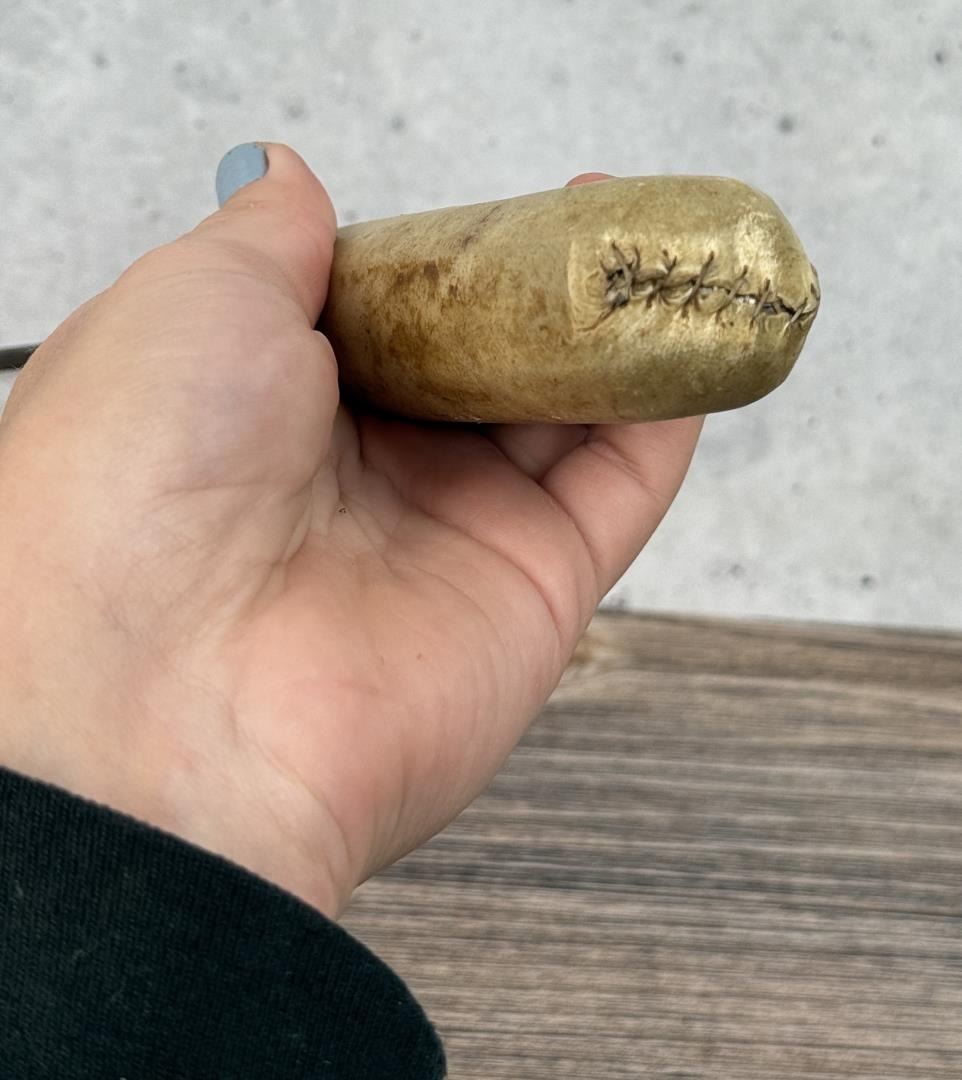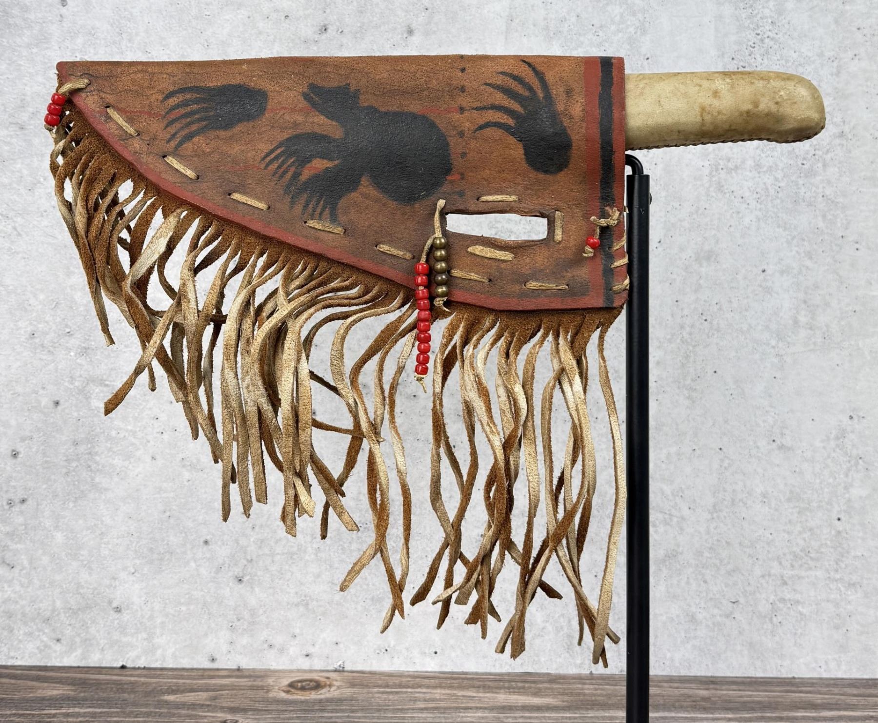 Painted Parfleche Sheath. Knife handle is Rawhide Wrapped. Mid 20th Century. Knife is 14 5/8" long, Sheath is 13 3/8" long and 14 3/8" wide with fringe.