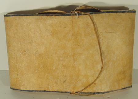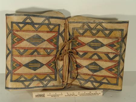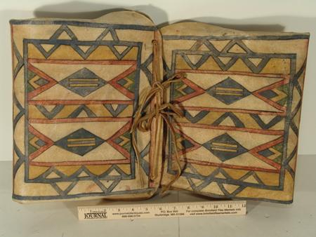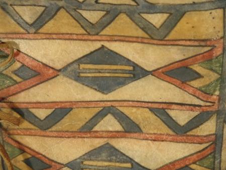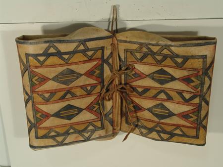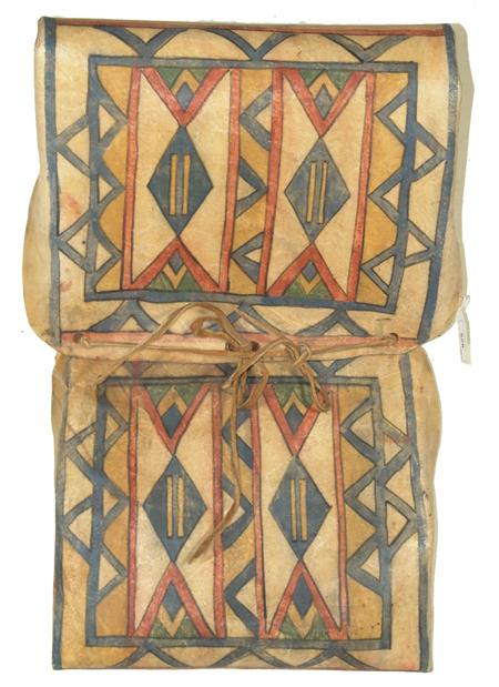 Traditional style shaped rawhide "suitcase" with mineral painted designs. 21" x 14"