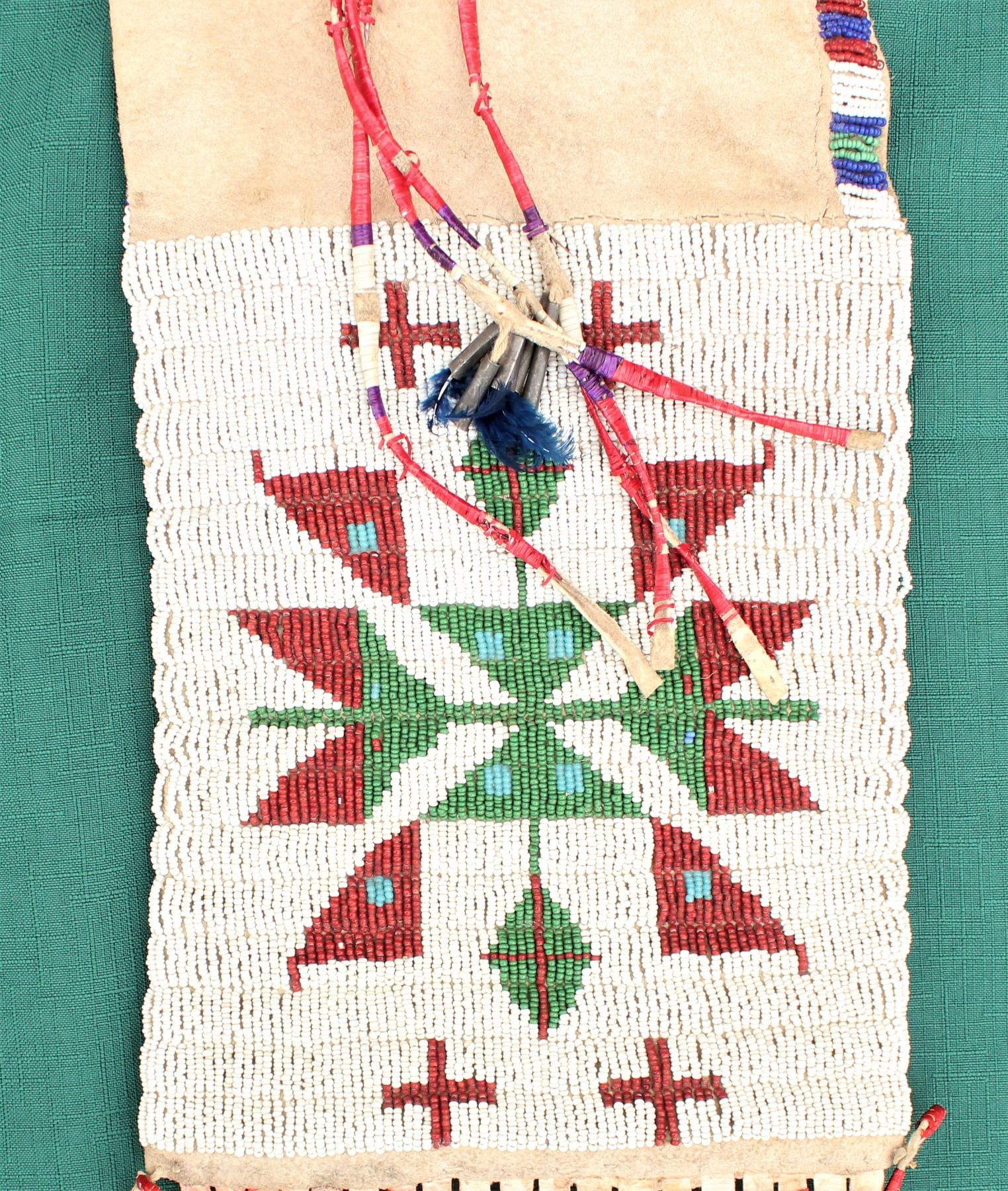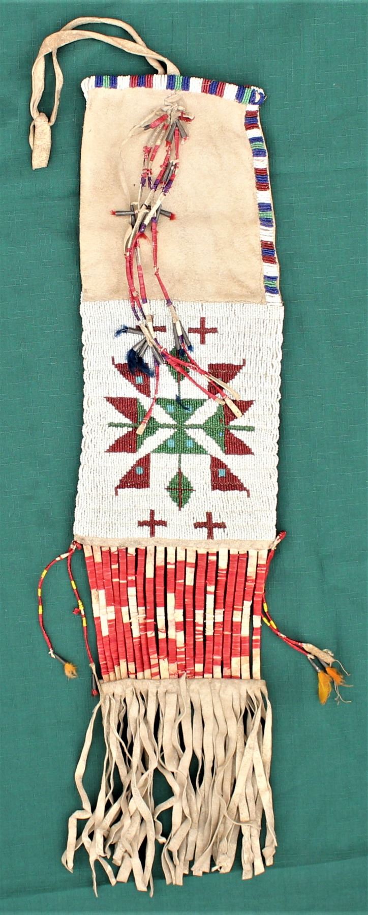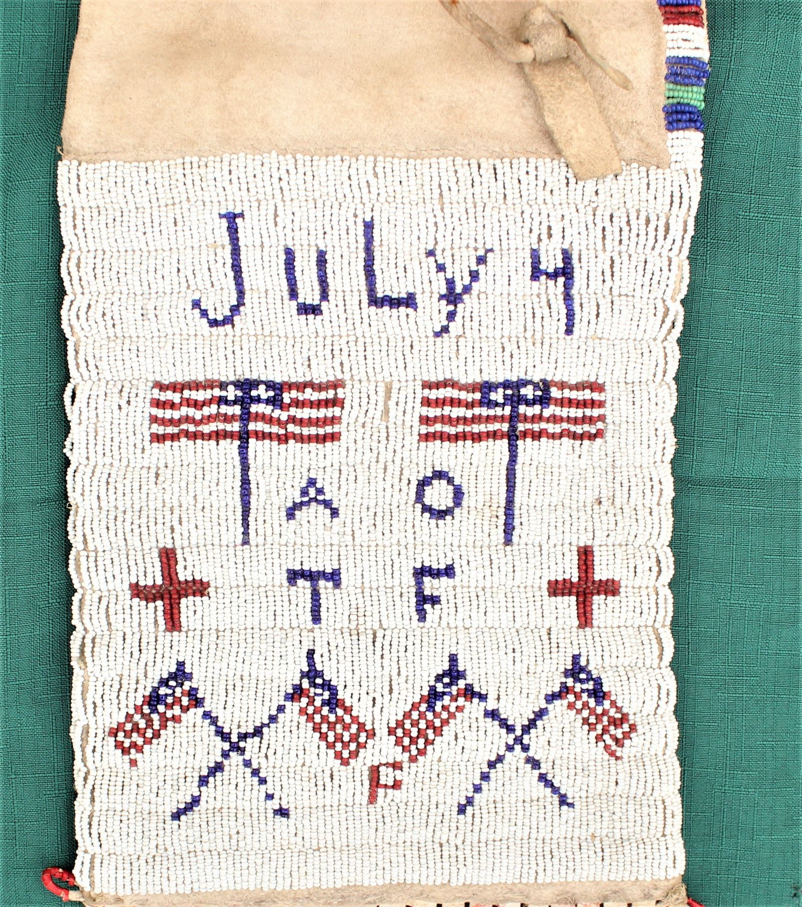 Appealing turn of the Century pipe bag with beautifully beaded geometric design on one side with great great quilled fringe and tinkle cones on one side and a wonderful patriotic pictorial presentation on the other side of "July 4" and figurals American flags on the other side. Measuring 7" x 29".