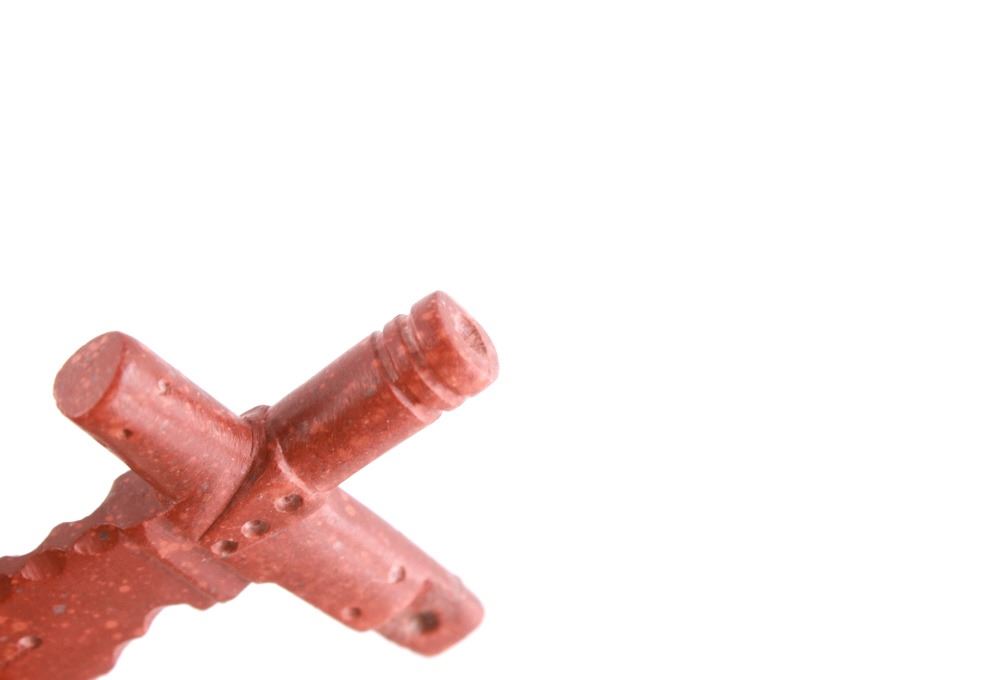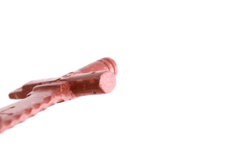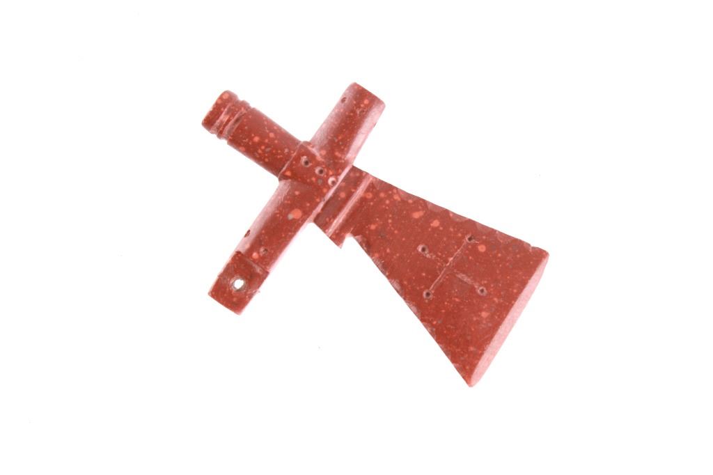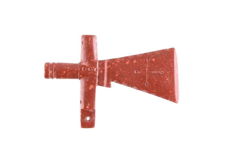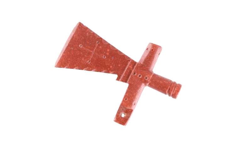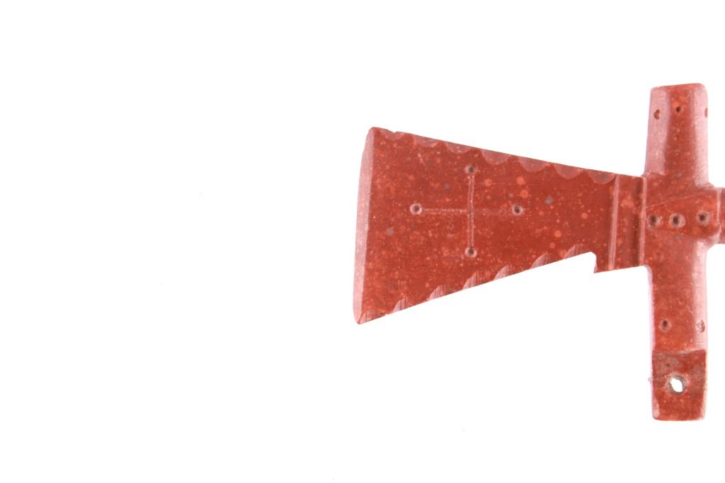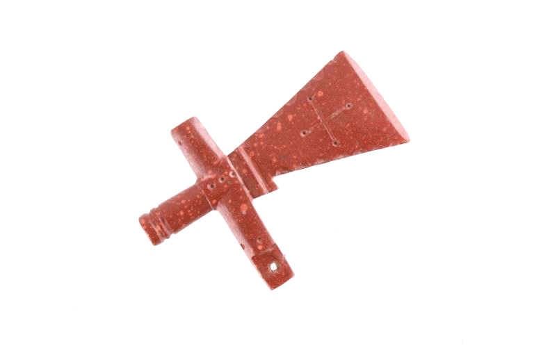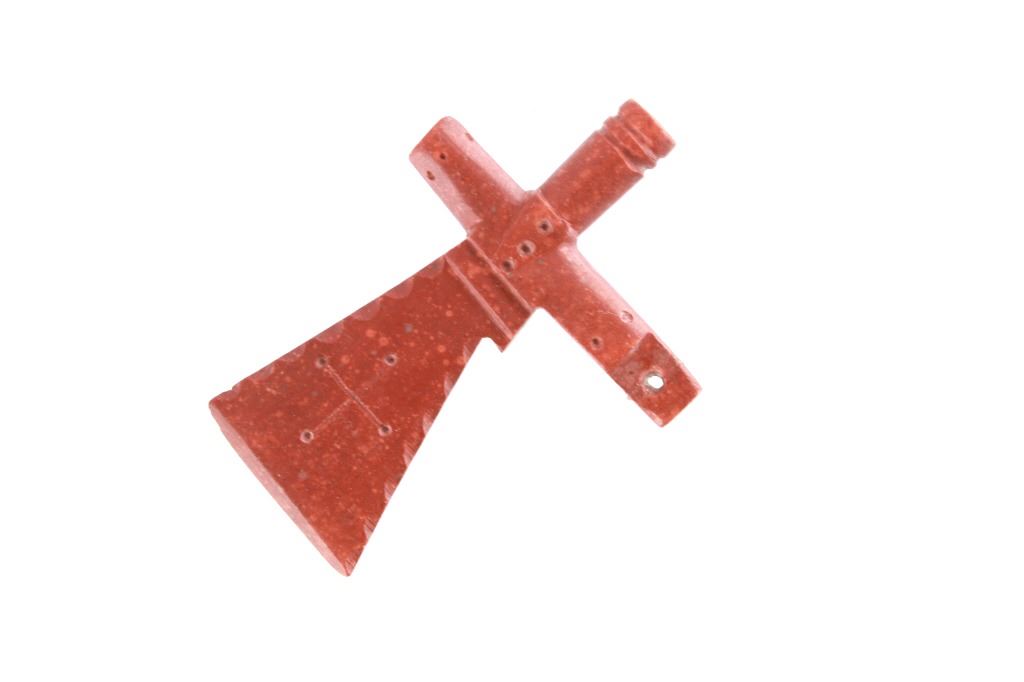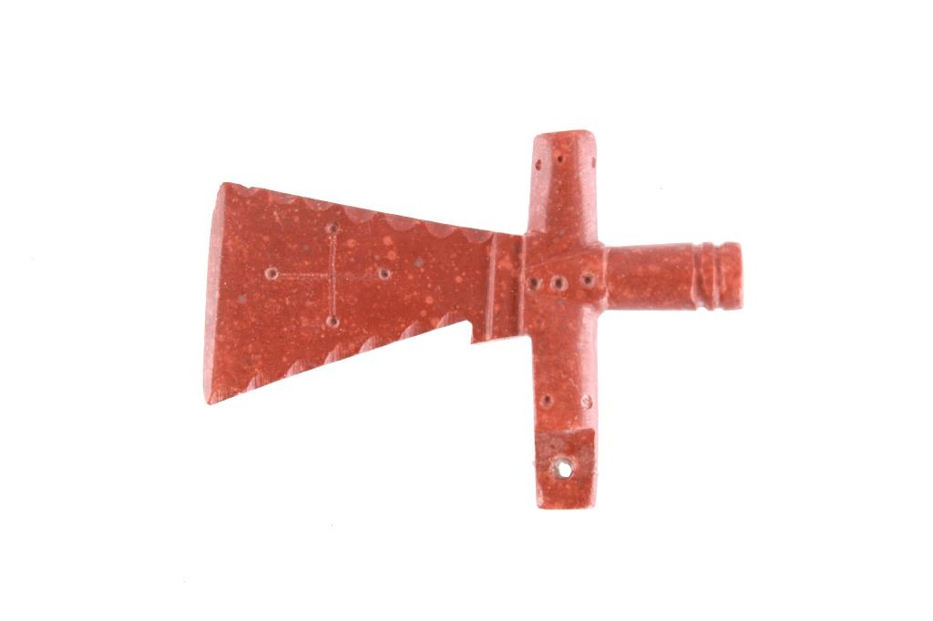 The lot features a fantastic miniature pipe tomahawk from the Plains Native American Indians dating to circa 1900. The piece shows solid catlinite pipe stone with a rich red to speckled pink coloring. The piece shows a pipe tomahawk head with cross etched on either side of the blade along with a punch dot pattern, tall thin bowl, far extending eyelet clean out and stem handle end with pierced hole. Likely a charm or necklace fetish. Shows a ridged beveled edge on the outside edges of the blade. Provenance: From the renowned Sundog Fine Art Bozeman, Montana collection by Bruce VanLandingham. Bruce VanLandingham was a pillar in the American Indian collecting community and a respected expert. Along with being an avid collector, Bruce was also the sole owner of Sundog Fine Art Gallery in Bozeman, which was both part museum and gallery, this piece is directly from the collection. No visible cracks or major damages. Measures overall 2 1/8" by 1.5". Museum collection number E1075.