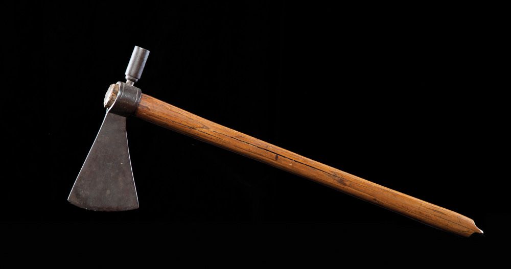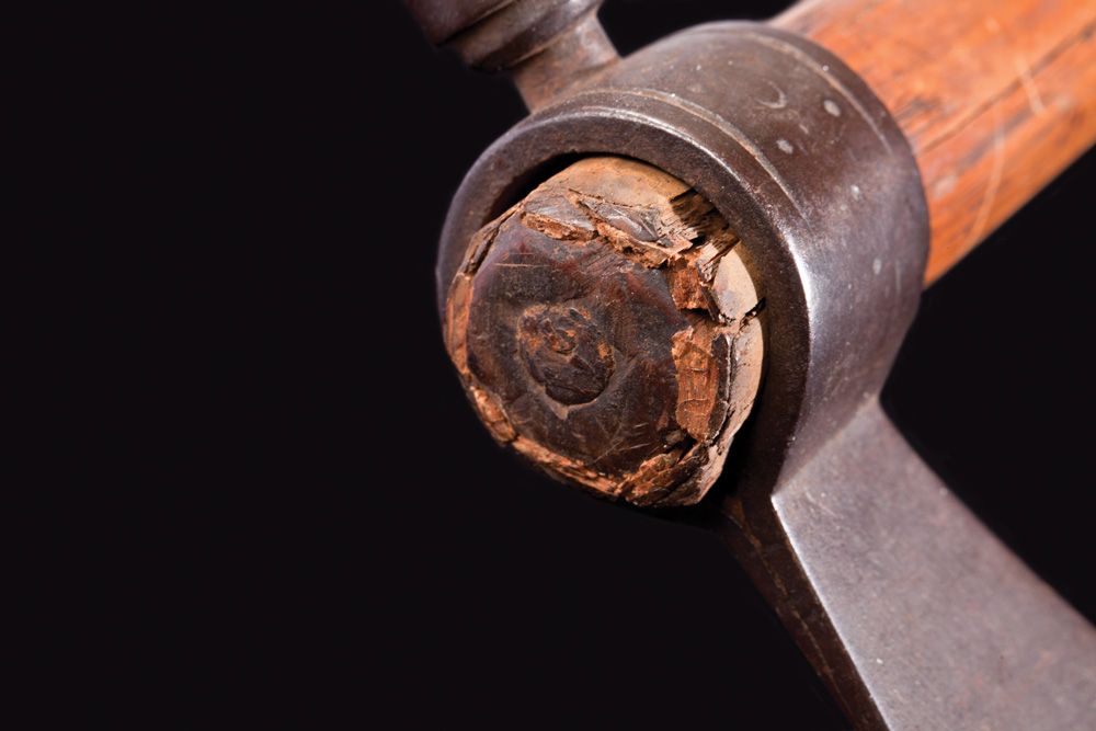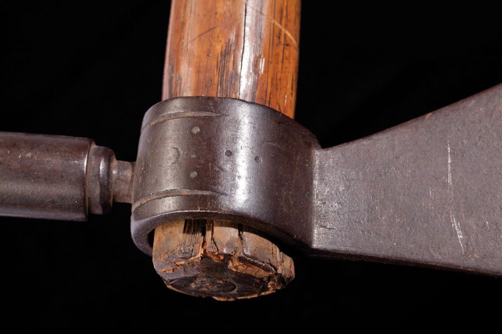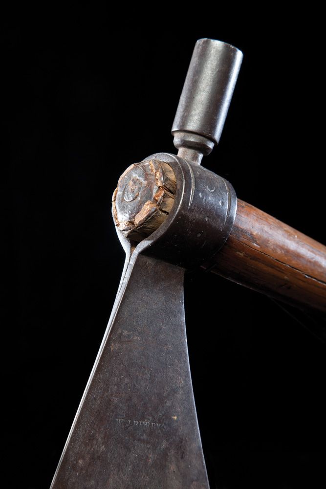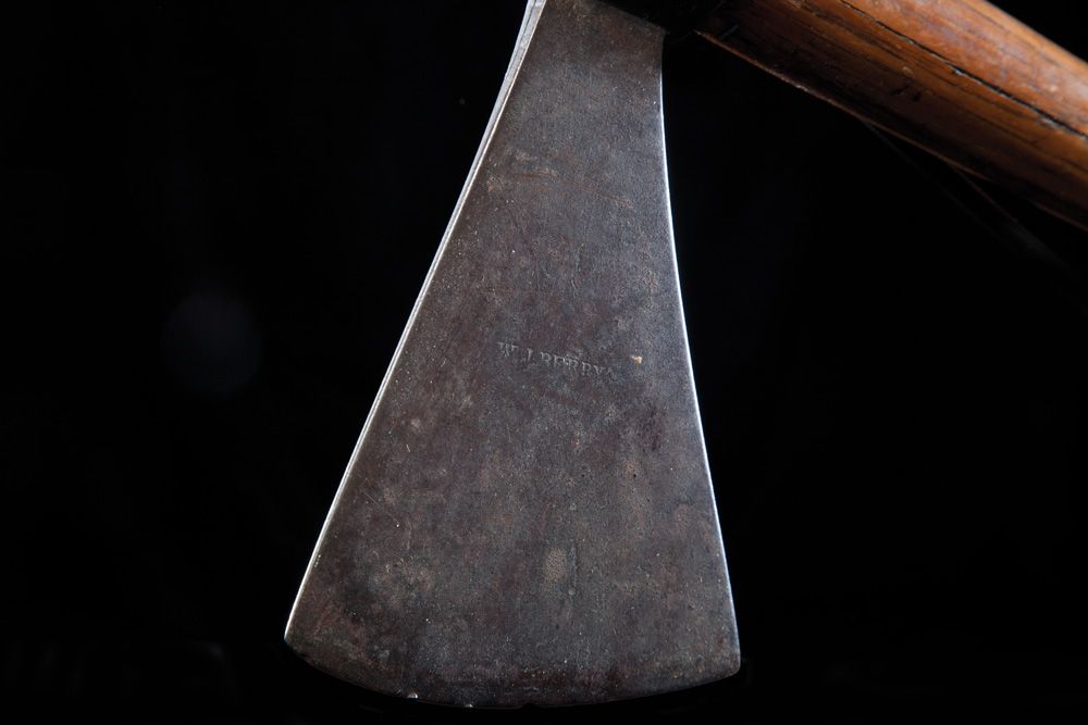20” long overall, 8” x 3 1/2” steel head with 3 1/2” blade, stamped during forge WJ BERRY. Dot and line accents on swell. Fine condition, circa 1890.