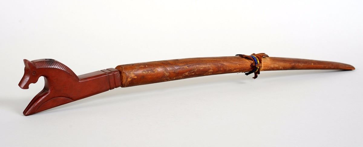 Plains Pipe with Catlinite Bowl Depicting a Horse and Wood Stem with Beadwork 21 1/4" L. Bowl 5" L. Good Condition