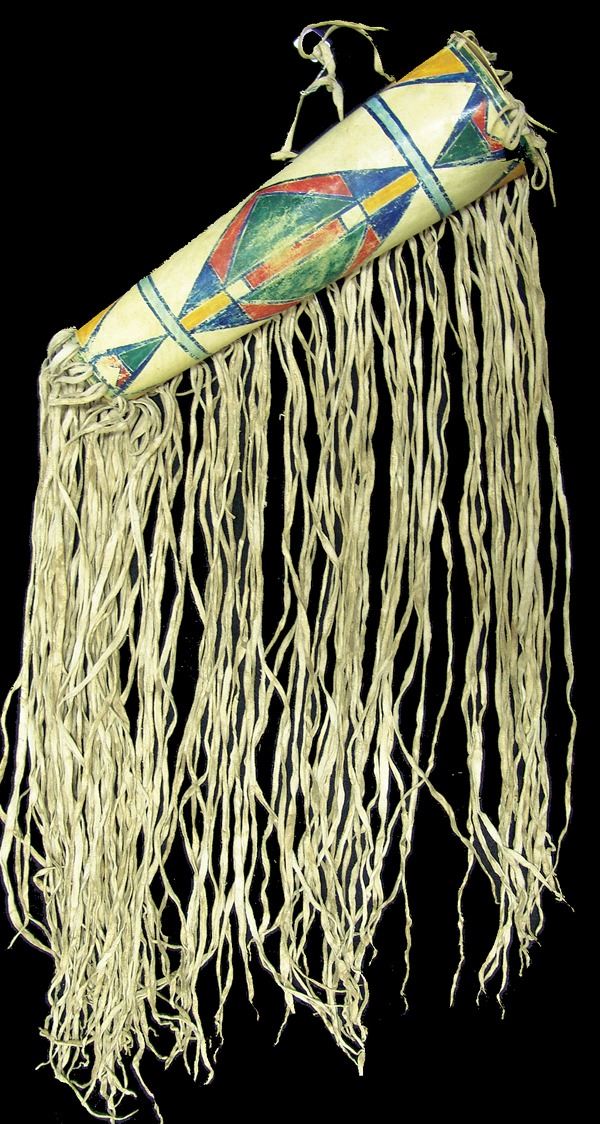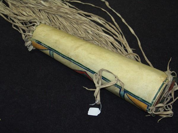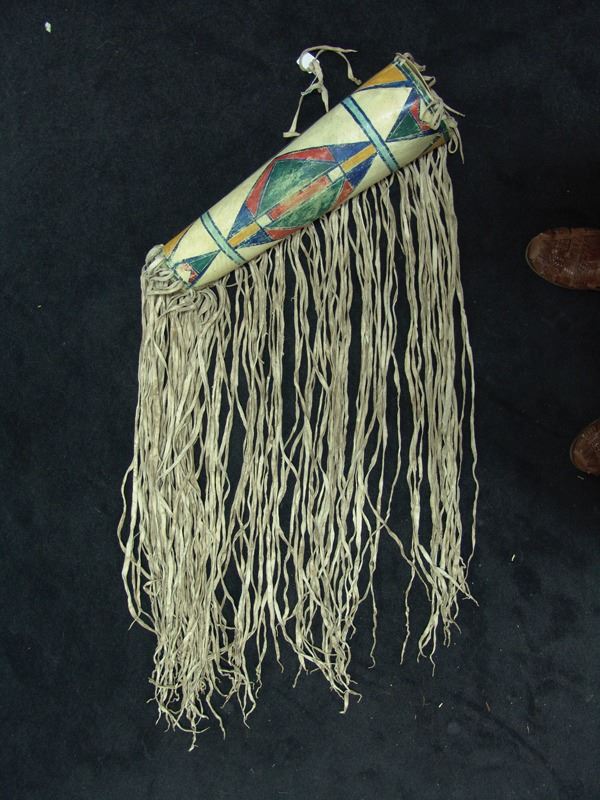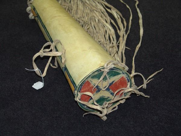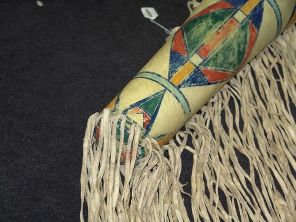 Beautiful shaped rawhide cylinder with cap and lid, long side fringe, and colorful, pigment painted geometric design. Very good condition.Early/Mid 1900s21"