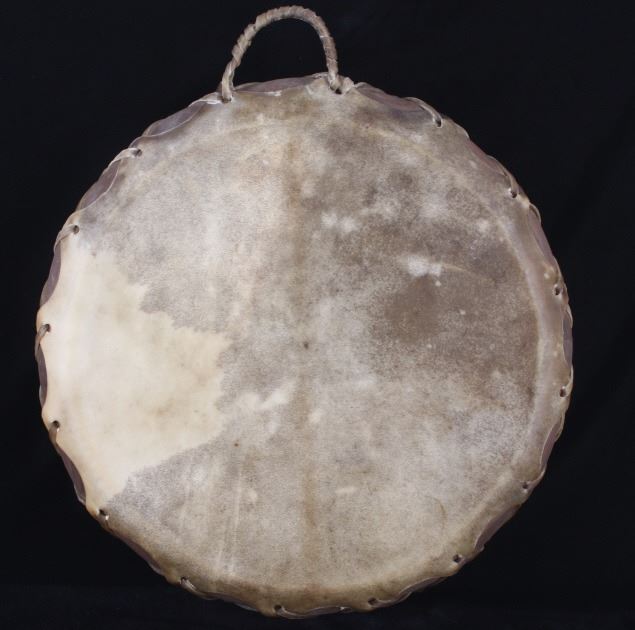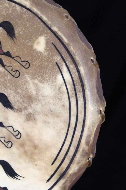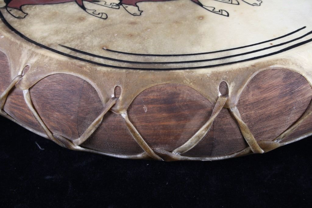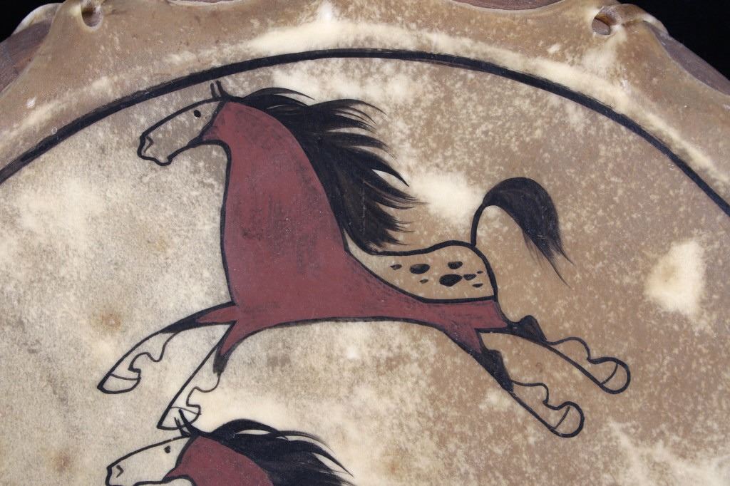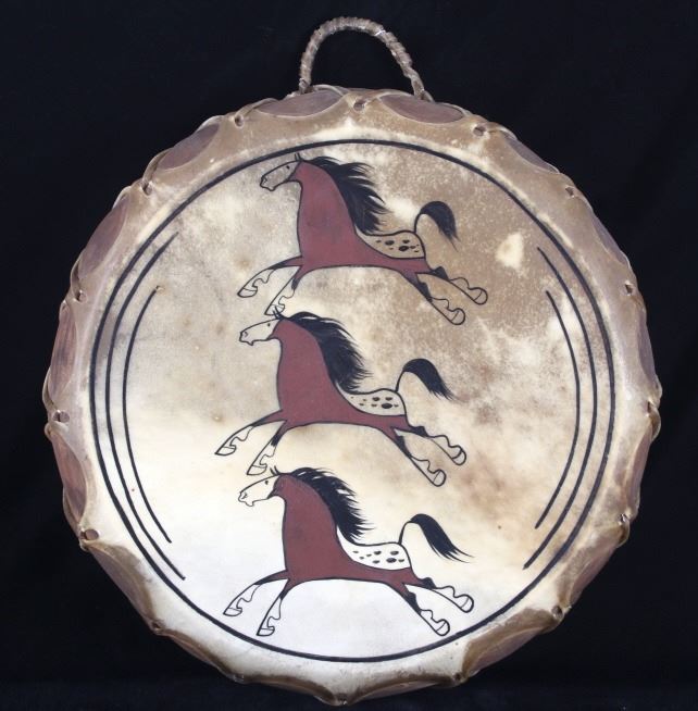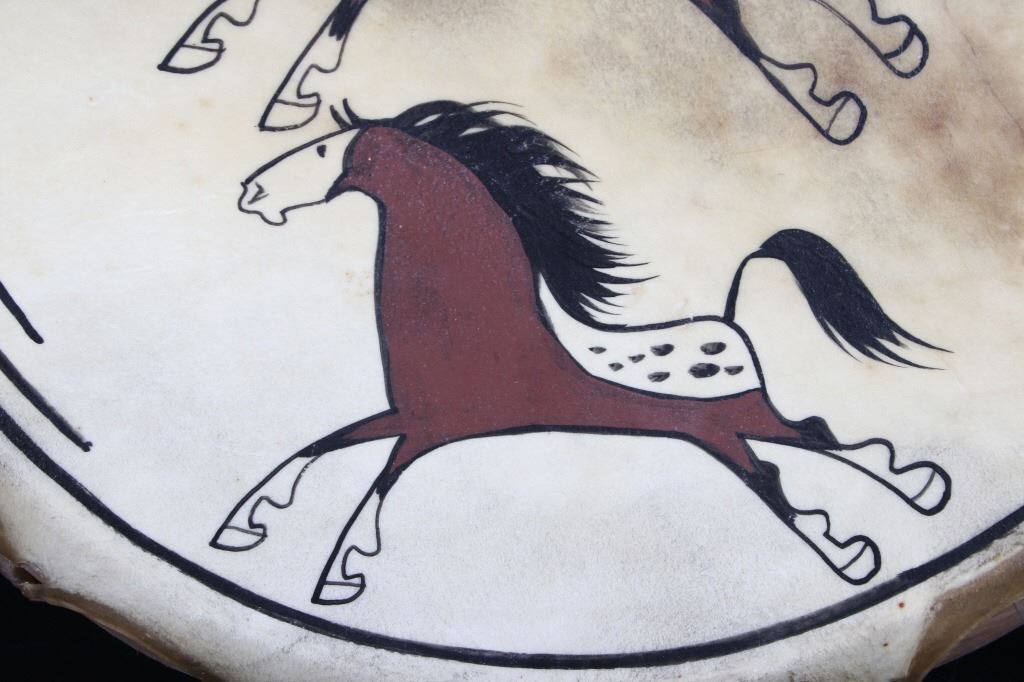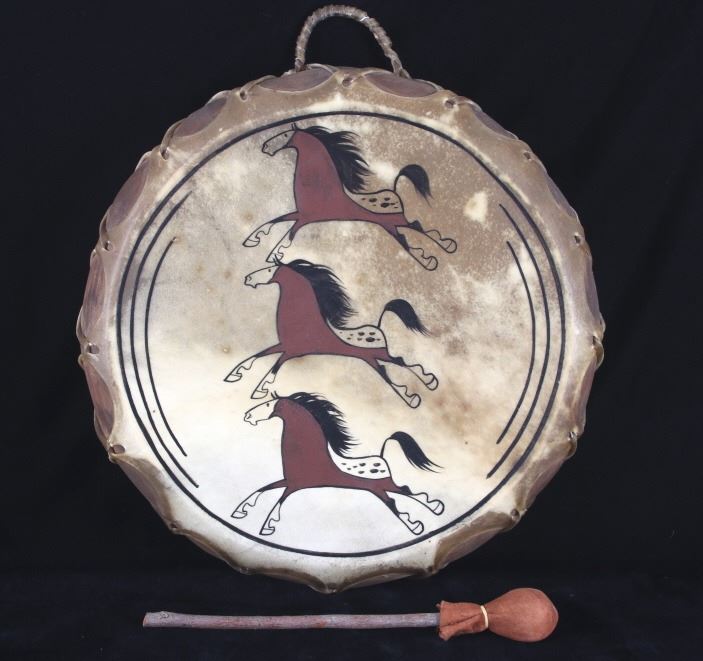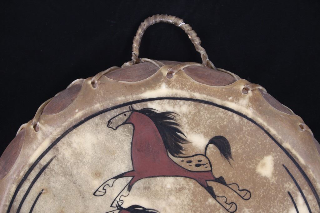 Featured in this lot is this Plains Indians horse painted Parfleche wrapped drum circa 1980's. The drum features a wonderfully and professionally crafted Parfleche wrapped construction that features a painted face with three horses painted on its face and shows a circular wooden frame that is segmented and expertly placed to keep its consistent slope. The beater features a cut wooden core with a hide wrapped tip. The condition of this drum is is good with no obvious signs of damage and in good overall condition. The measurements of this drum are 18" x 16 1/2" x 3" and the beater measures 12 1/2" x 1 3/4" x 1 1/2".