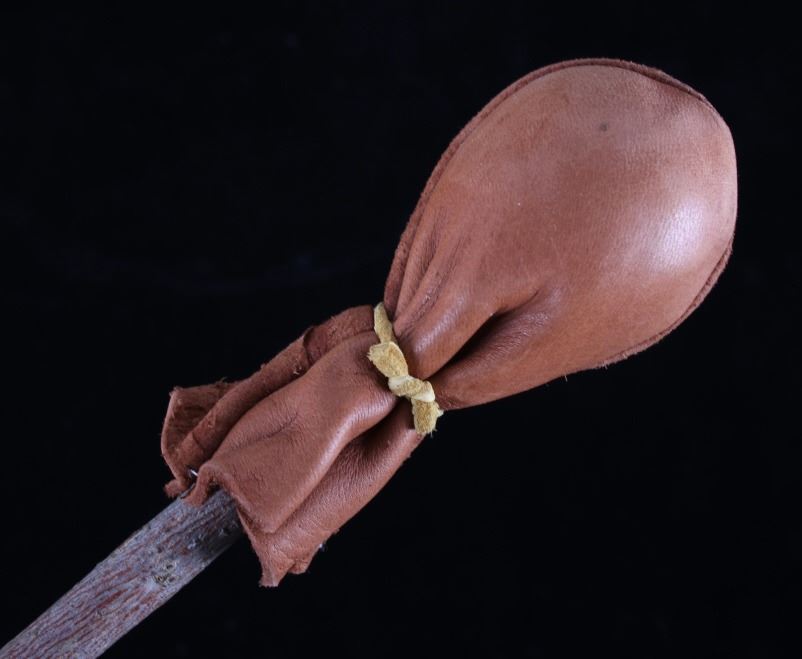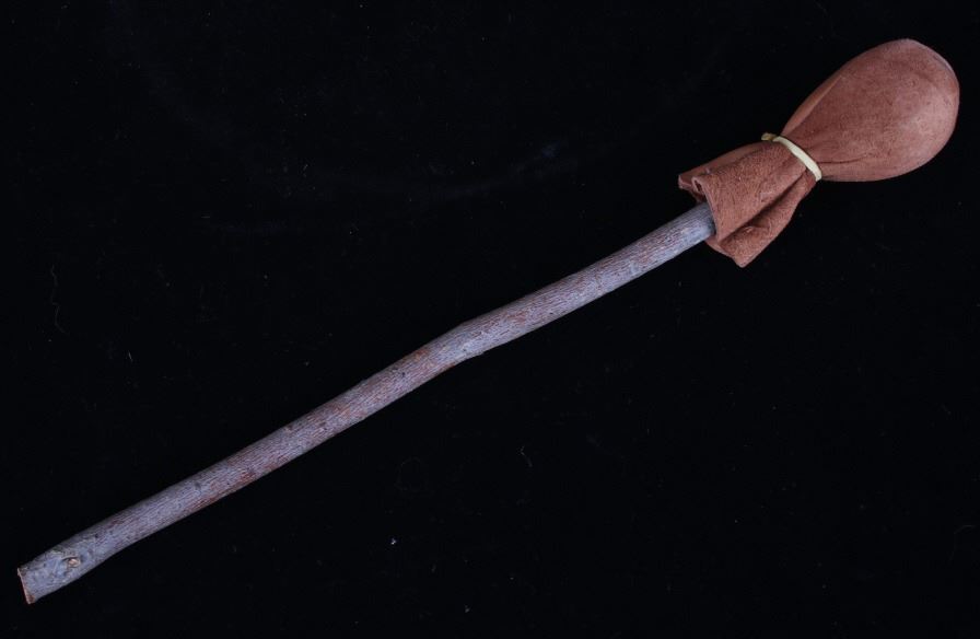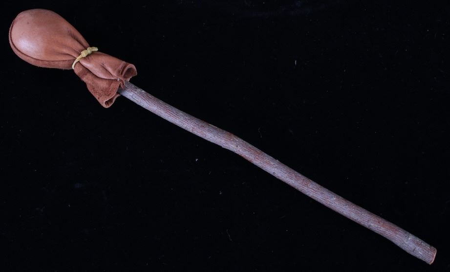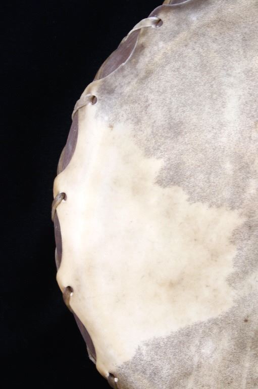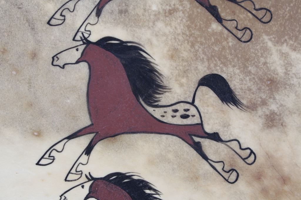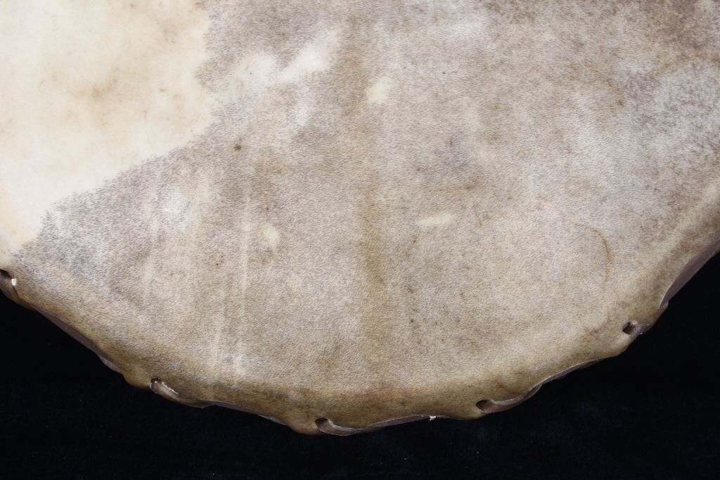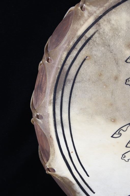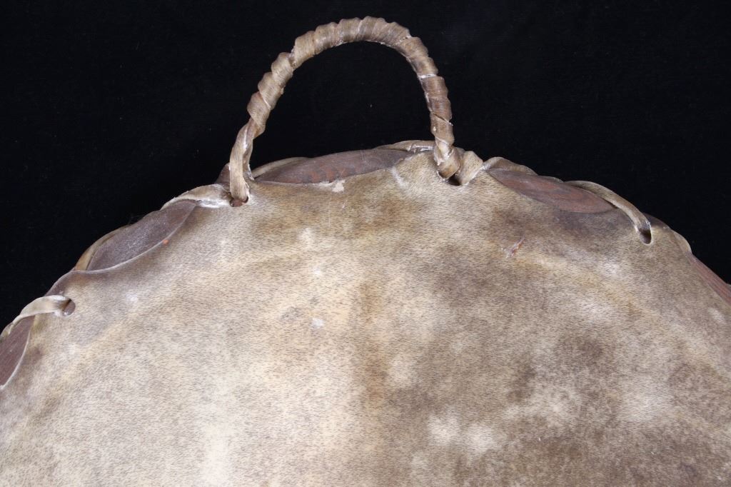 Featured in this lot is this Plains Indians horse painted Parfleche wrapped drum circa 1980's. The drum features a wonderfully and professionally crafted Parfleche wrapped construction that features a painted face with three horses painted on its face and shows a circular wooden frame that is segmented and expertly placed to keep its consistent slope. The beater features a cut wooden core with a hide wrapped tip. The condition of this drum is is good with no obvious signs of damage and in good overall condition. The measurements of this drum are 18" x 16 1/2" x 3" and the beater measures 12 1/2" x 1 3/4" x 1 1/2".